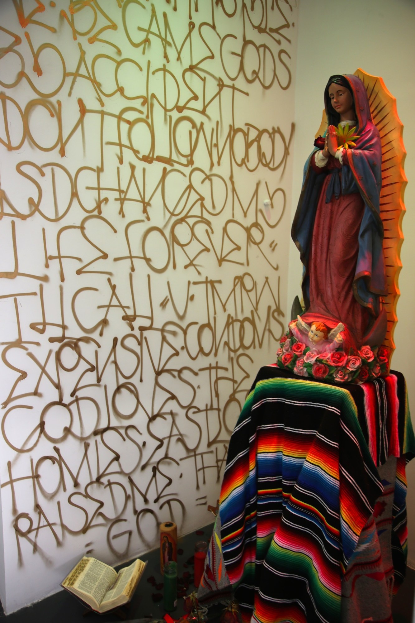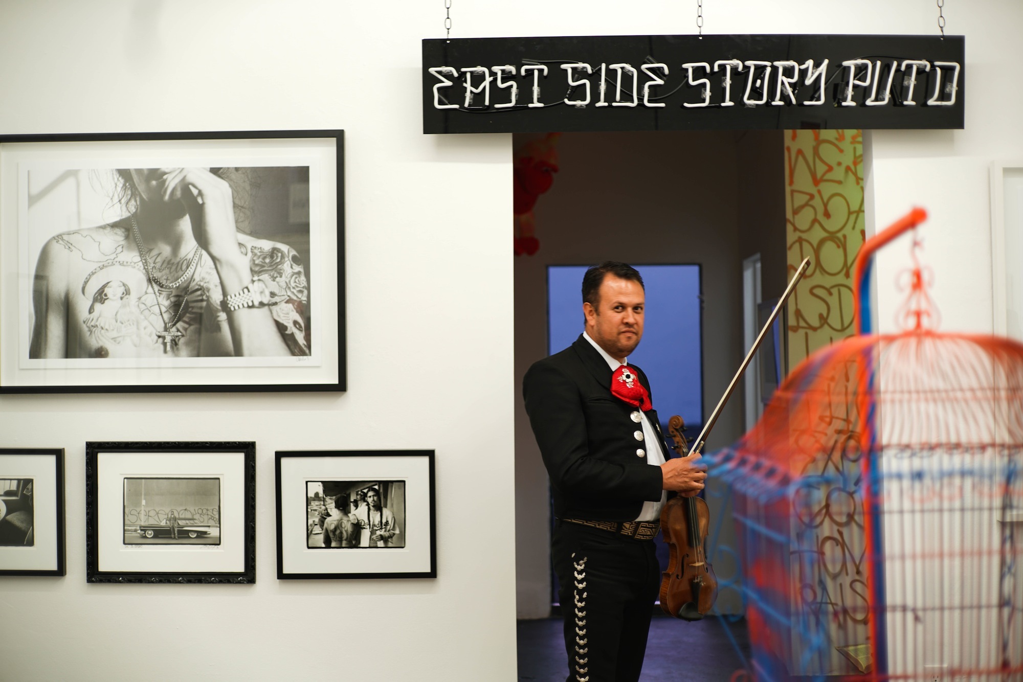 In addition to these portraits, East Side Story also incorporates installations designed to make the gallery space feel more like a familiar neighborhood: there are religious objects and iconography, live parakeets in brightly hued cages, pillared cakes, piñatas, a wall of tri-color Novena candles, plus a few dirt bikes and lowrider whips. A mariachi violinist even performed at its opening party. And given a certain presidential candidate’s divisive, racist rhetoric, shows that celebrate America’s wonderfully varied cultures and communities are exactly what we want to see more of.