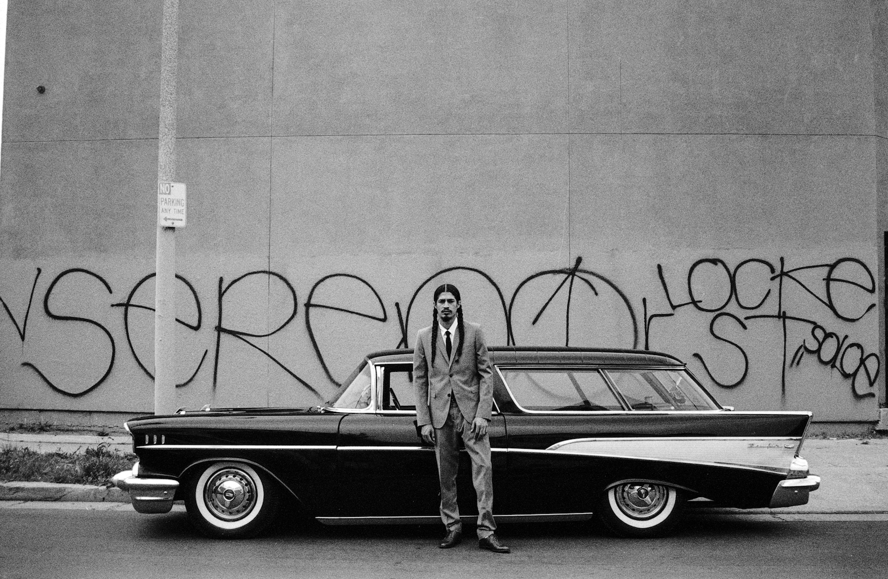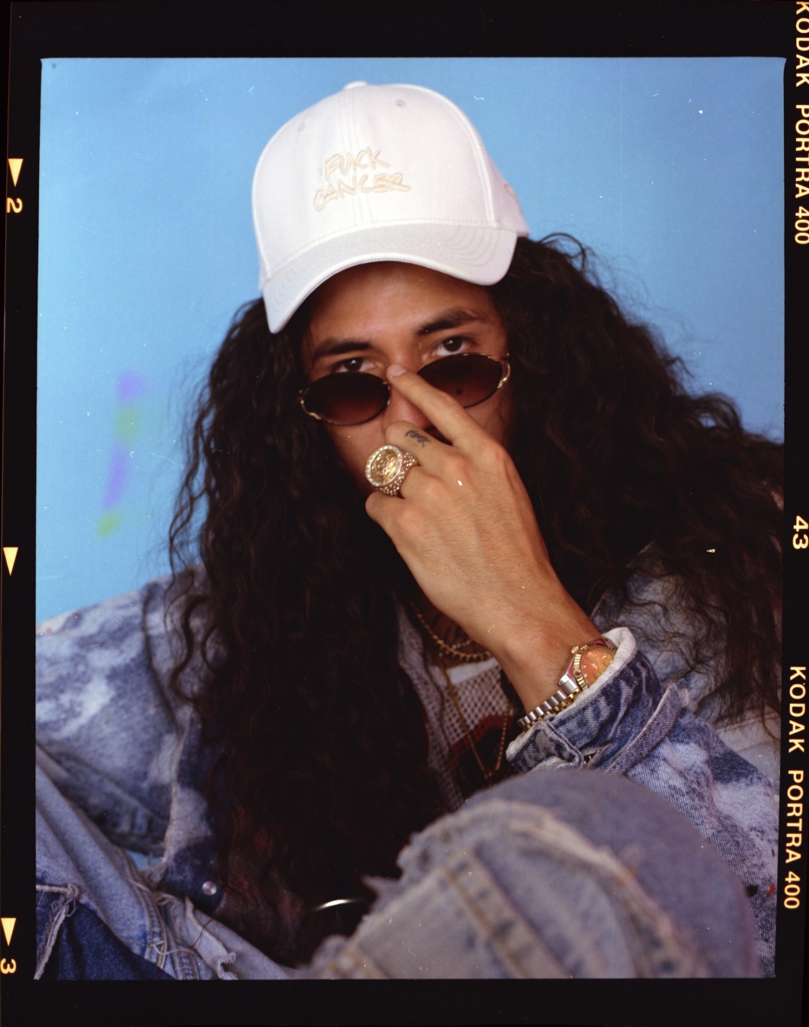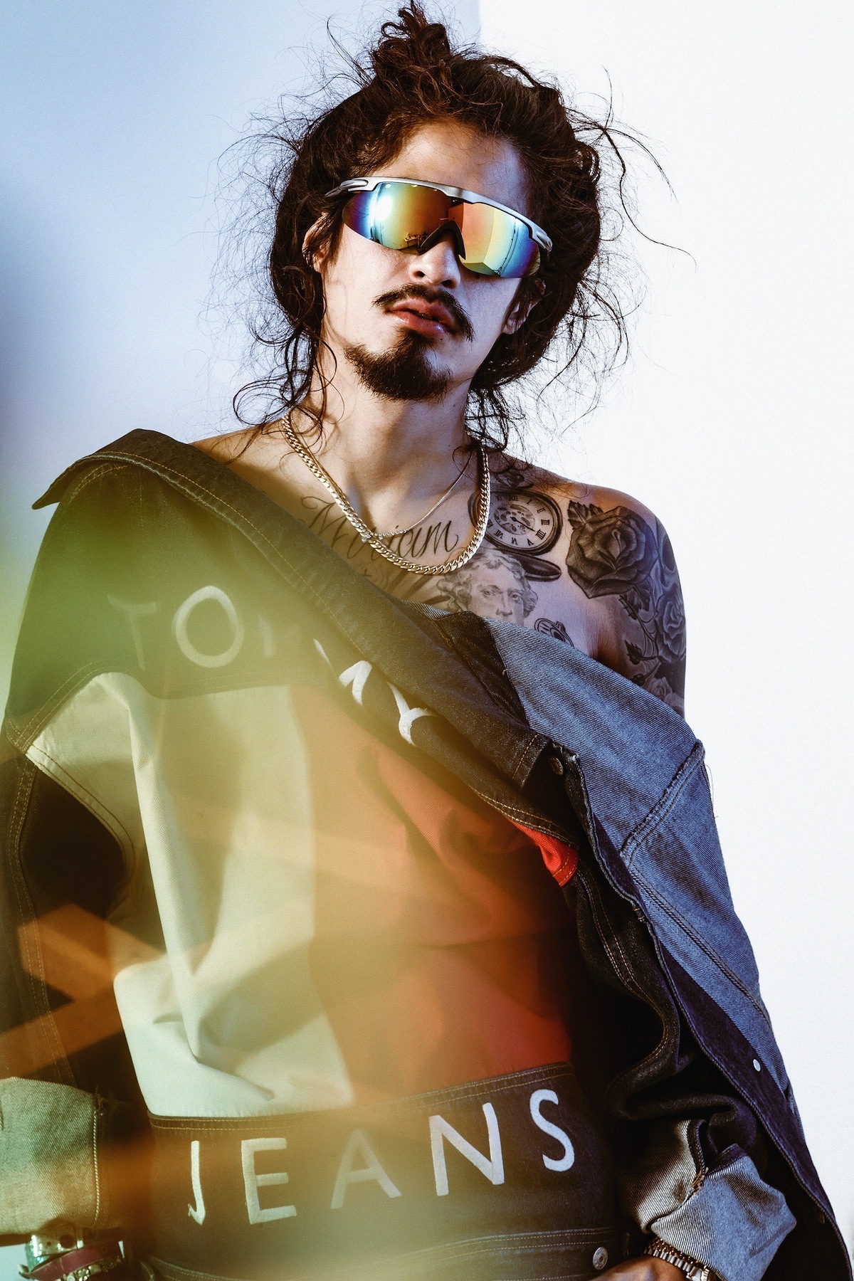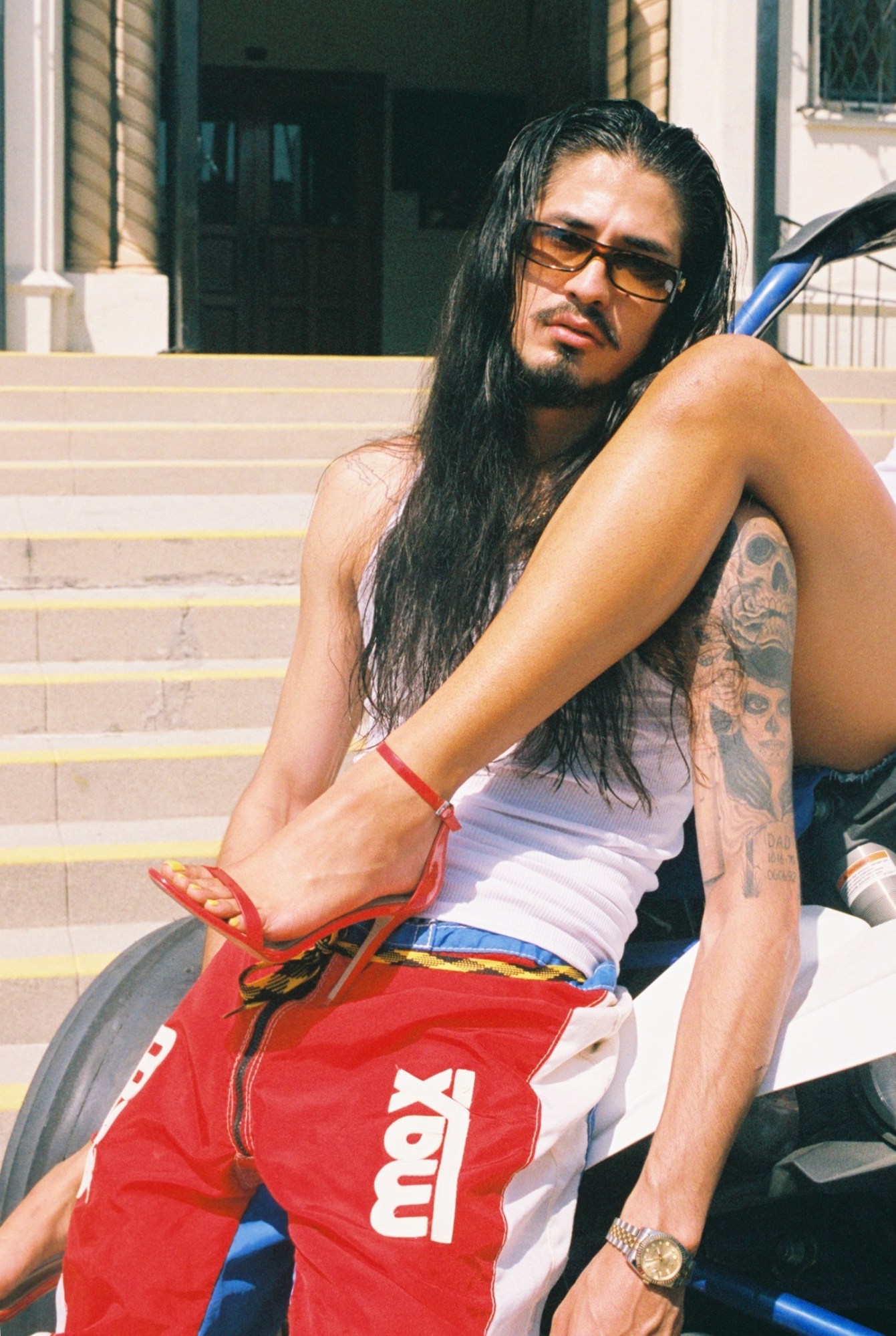 East Side Story includes images by photographers both established and emerging, among them Estevan Oriol, former professional skater Steve Olson, Dan Regan, and Adri Law. In Oriol’s black and white portrait, Gil stands stoically in a suit in front of a vintage car, and wears his long hair braided. In Rick Rodney’s photograph, he rocks a boxy Tommy Jeans jacket. Both images feel reminiscent of what can be found flipping through @veteranas_and_rucas — a public archive of Southern California’s Chicano youth. The account spans images of dapperly suited 40s dandies, lowrider car enthusiasts, rave-loving “party crews,” devoted Brit-pop fans, and some seriously excellent workwear, not unlike Gil’s jacket.