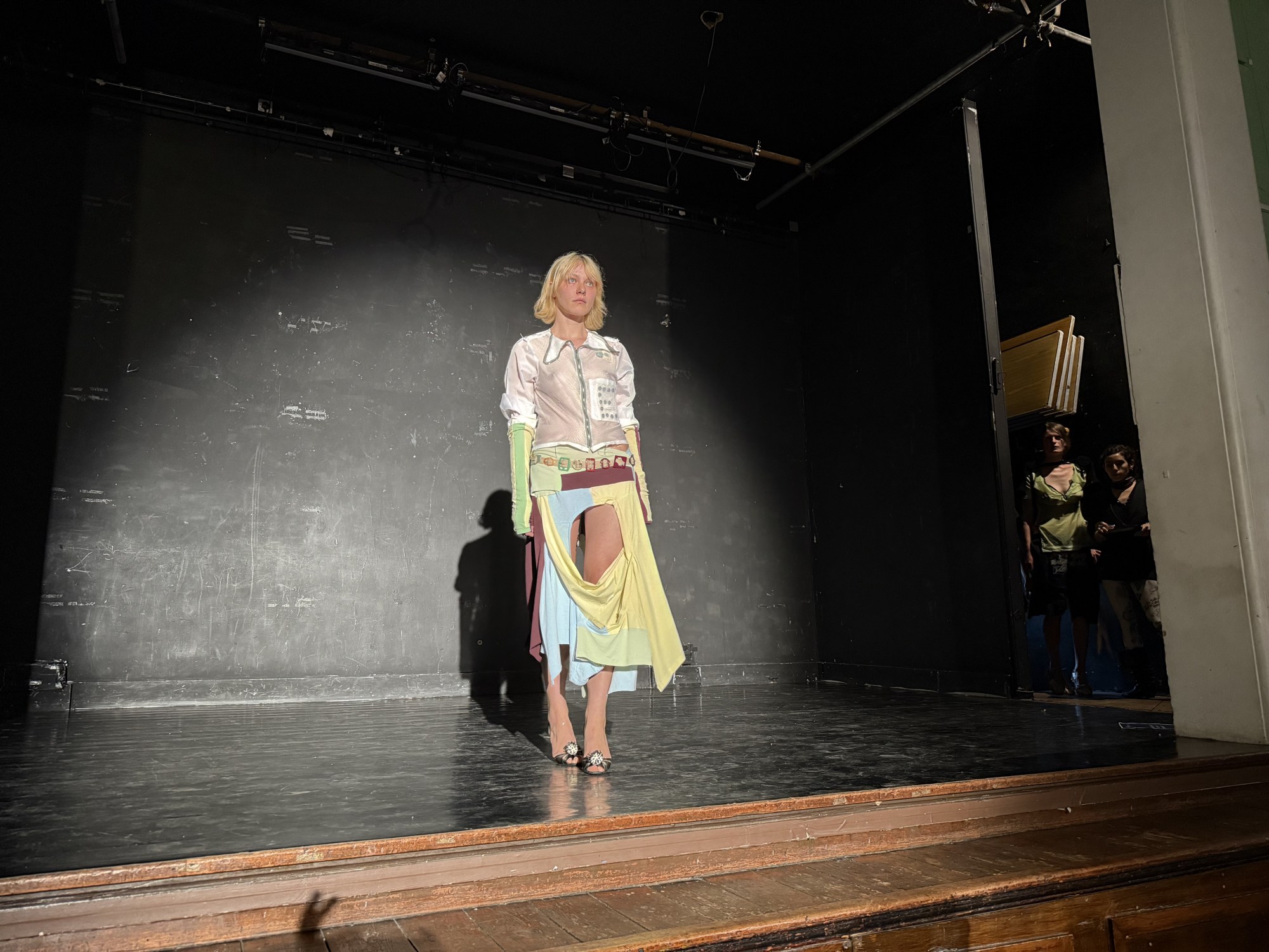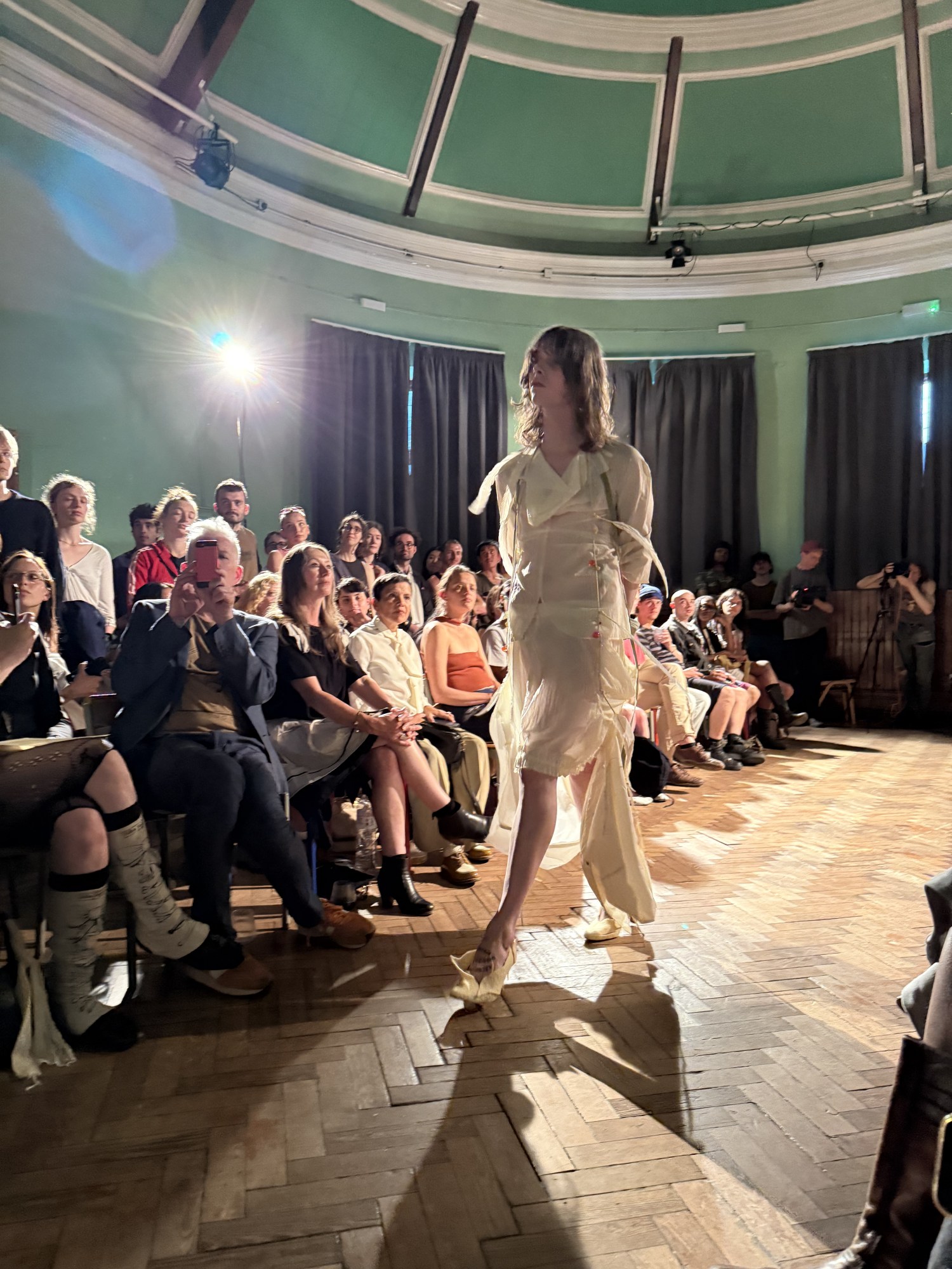 There’s no step-and-repeat, no PR choreography, no assigned seating—just a crowd of queer creatives, art school friends, and just two stray fashion editors (myself and British Vogue’s Daniel Rodgers). Also in attendance: Fabio Piras, director of the Central Saint Martins MA Fashion course and Hill’s former tutor—a quiet yet weighty endorsement from the institution that shapes London’s brightest. The rest of the industry that proclaims to support young talent was missing in action—and missing out.
