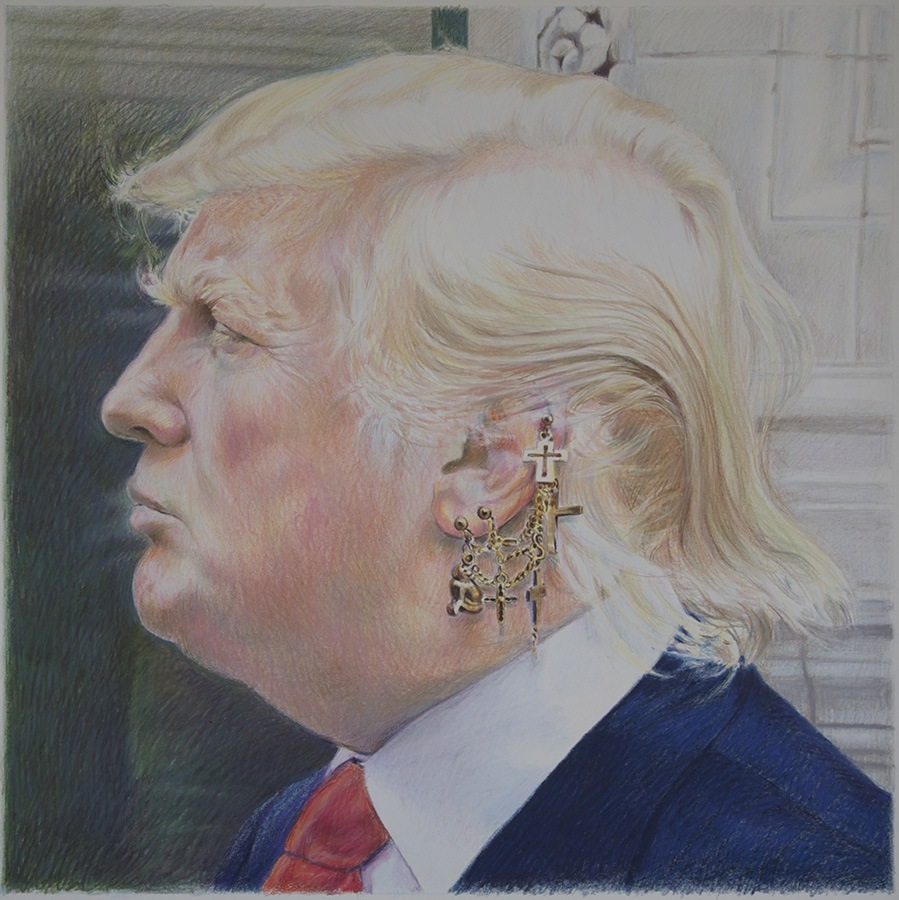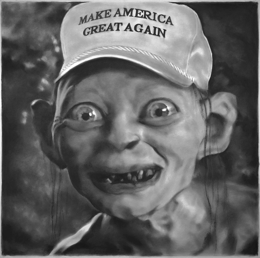 Each piece in the show pairs pop culture with politics — think Golem in a “Make America Great Again” cap — in order to raise questions about racism, sexism, or elitism. But the exhibition is not pedagogic as much as it is a Rorschach test. Yahnker’s works are intended to provoke us — he wants us to question our own opinions and roles, just as he questioned himself when he was drawing them. “I can honestly say the process of making this show was as much an uncomfortable self-examination as a societal critique,” says Yahnker.