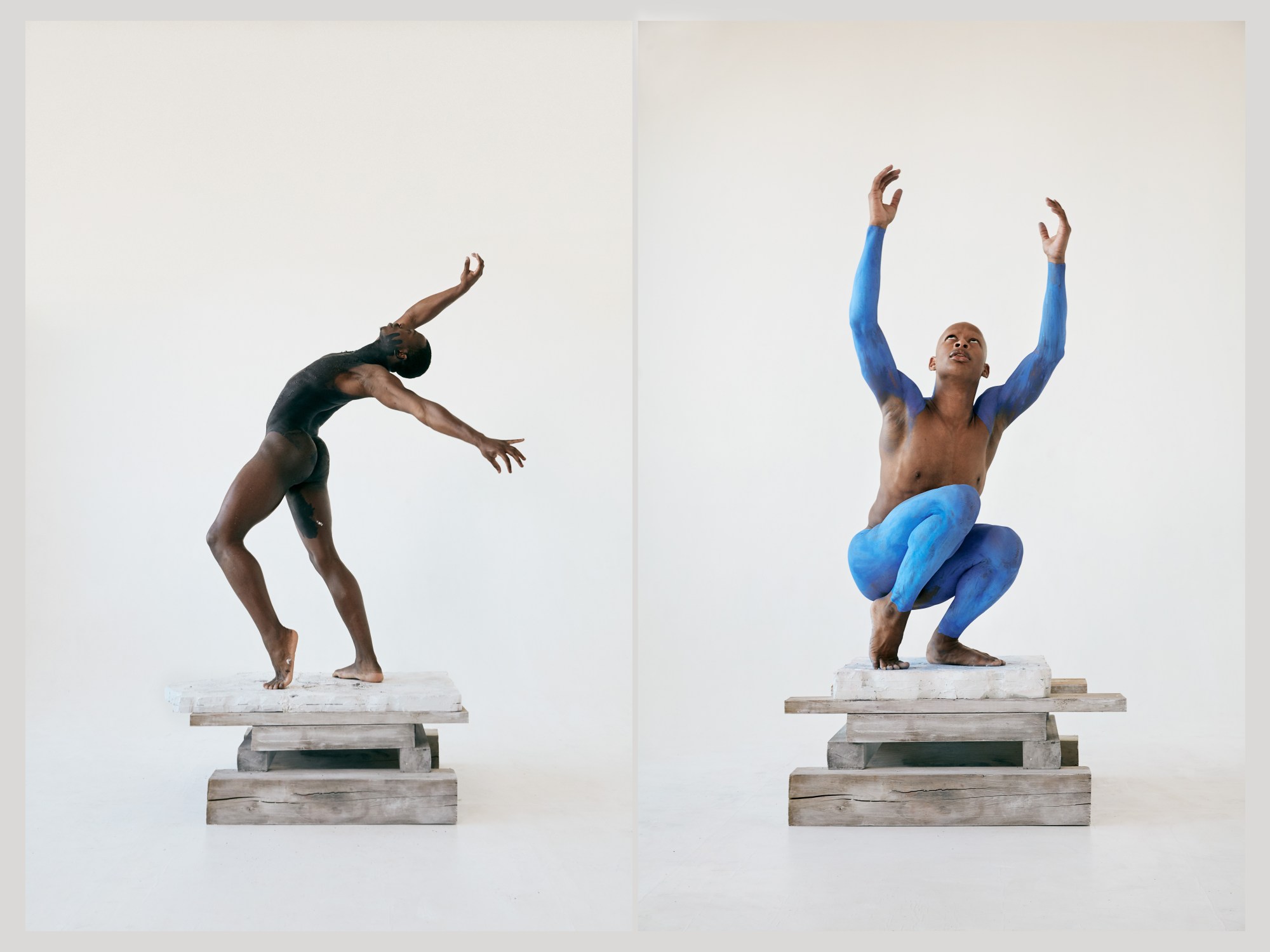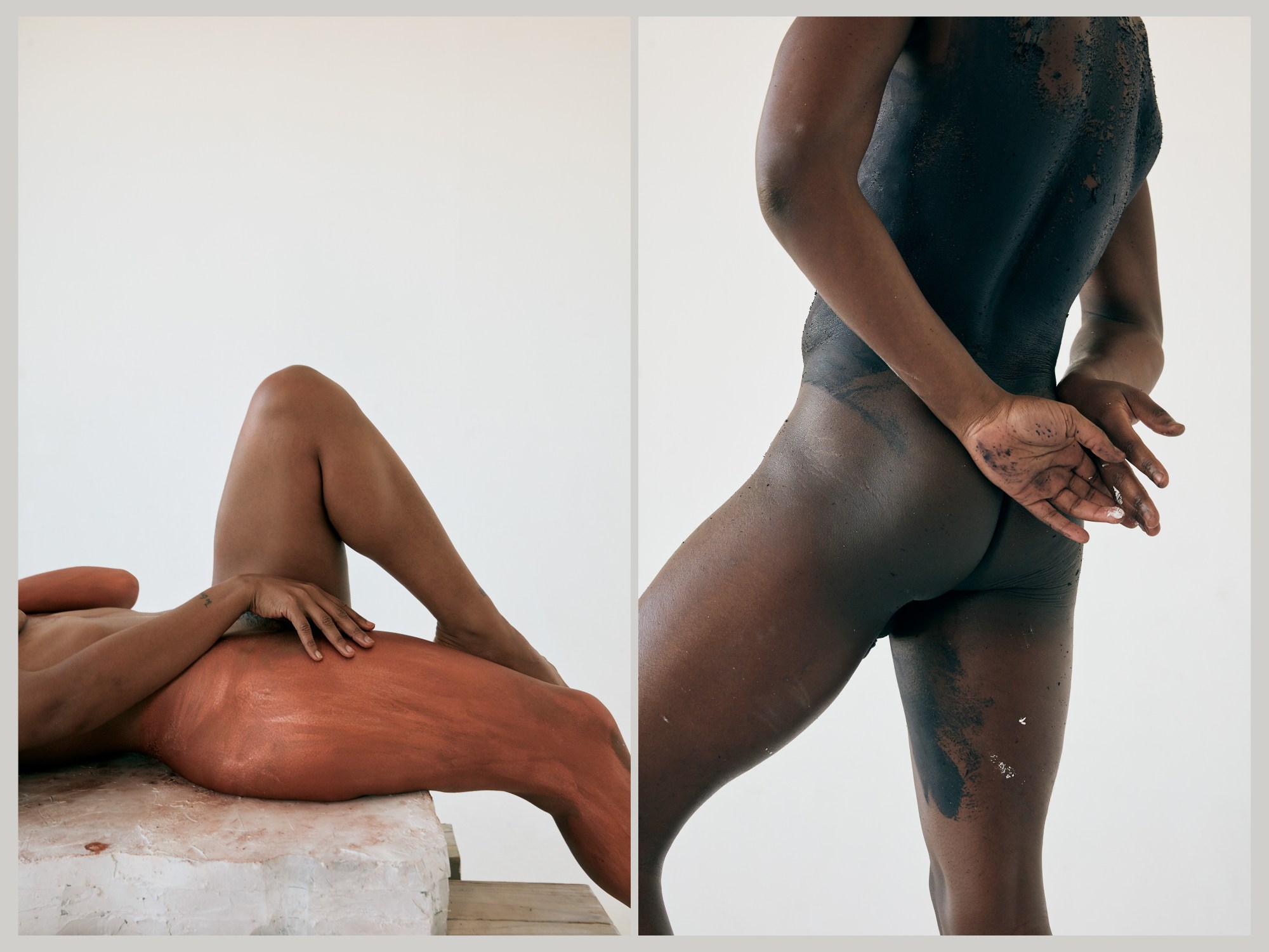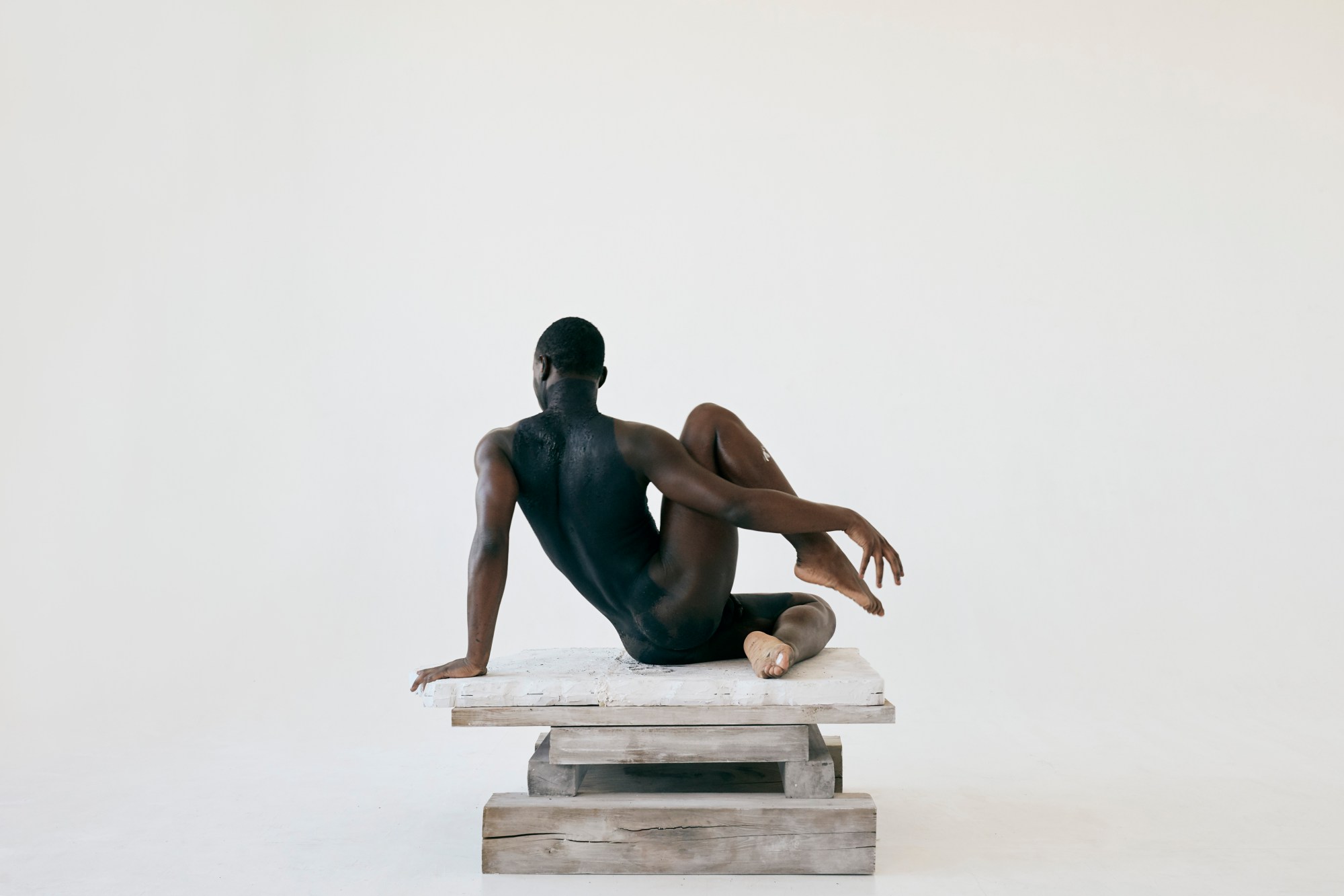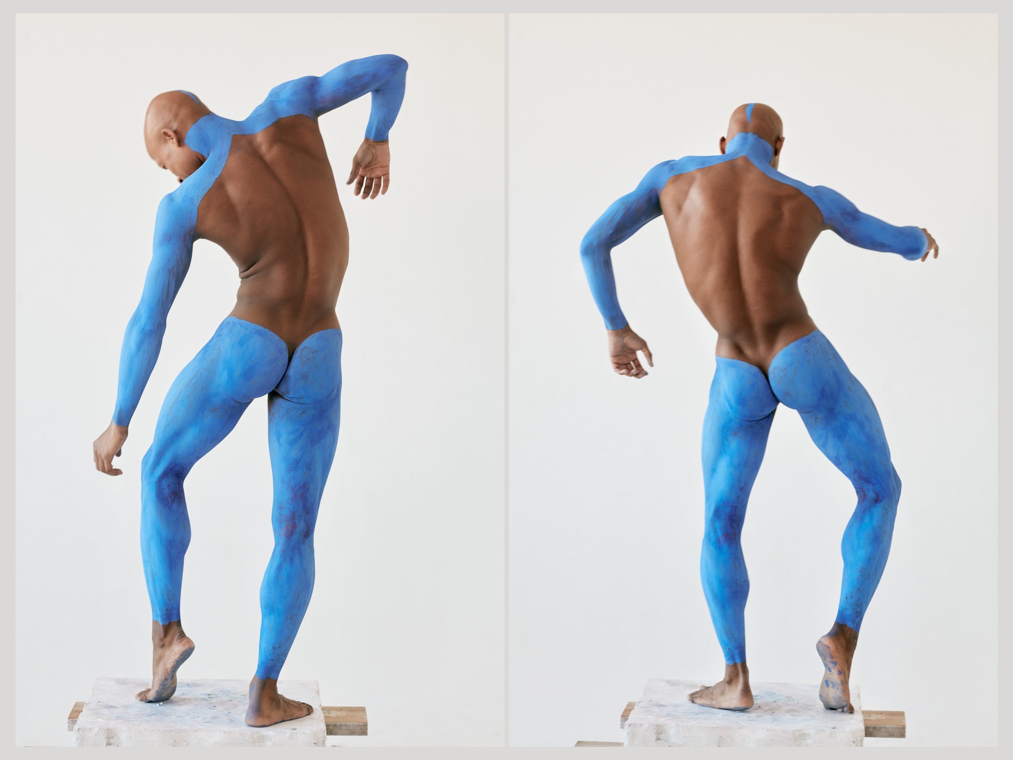 Each of her five models — all dancers — embody the proud shape and form of these sculptures, each nude, their bodies painted in ways that create illusions of where outstretched limbs begin and end. The dancers glide gently through the air to create a serene atmosphere reminiscent of the cavernous gallery spaces that are home to the artworks mentioned above. “I love working with dancers,” Erica adds. “The five dancers in this project come from various dance backgrounds. The melding of the different styles — from classical to hip hop, contemporary, and everything in-between — into a classical beat shows a beautiful juxtaposition and highlights strength and power in movement, as well as beautiful softer, more internal breaths of air — all things speaking to the experience of people of colour swallowed in a culture that always excludes them.