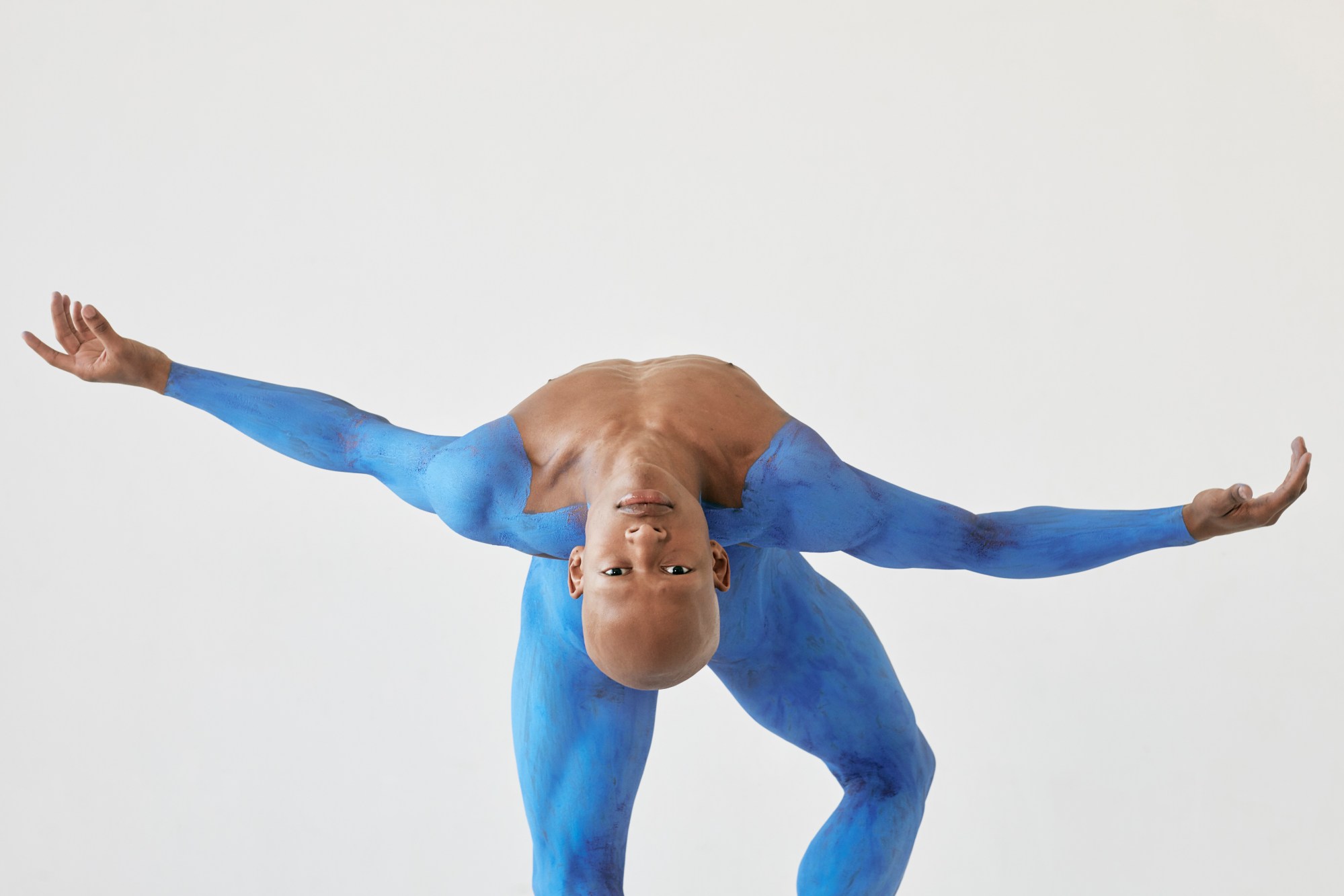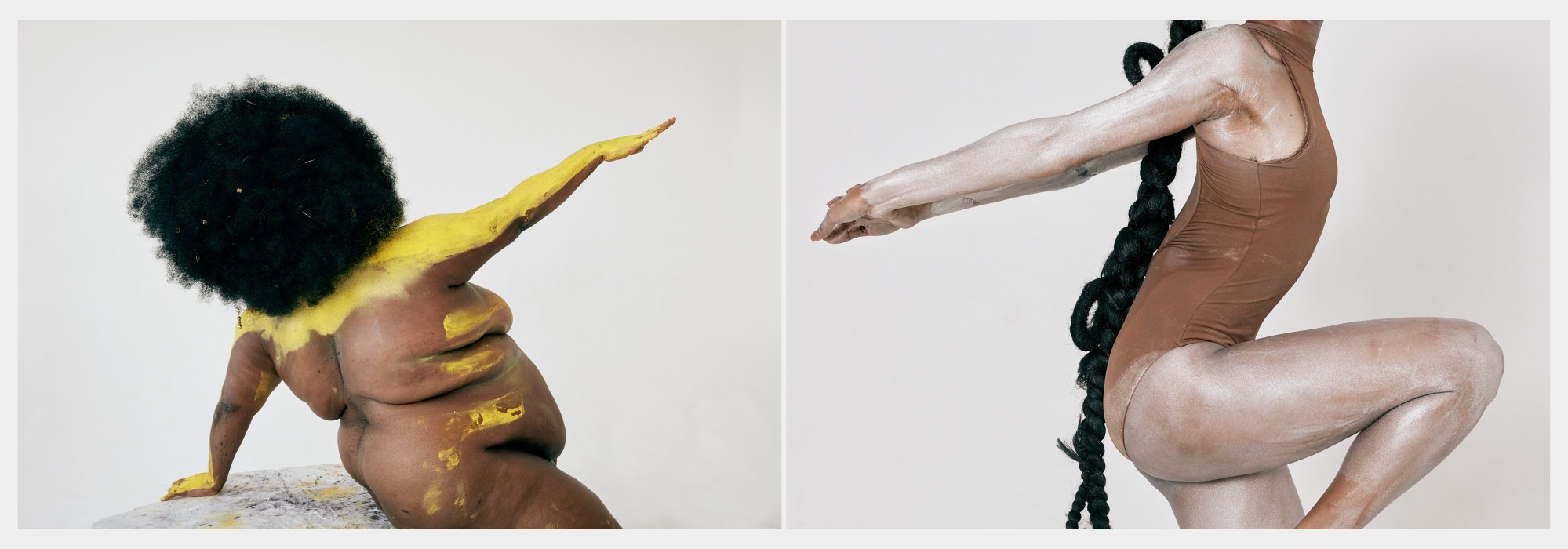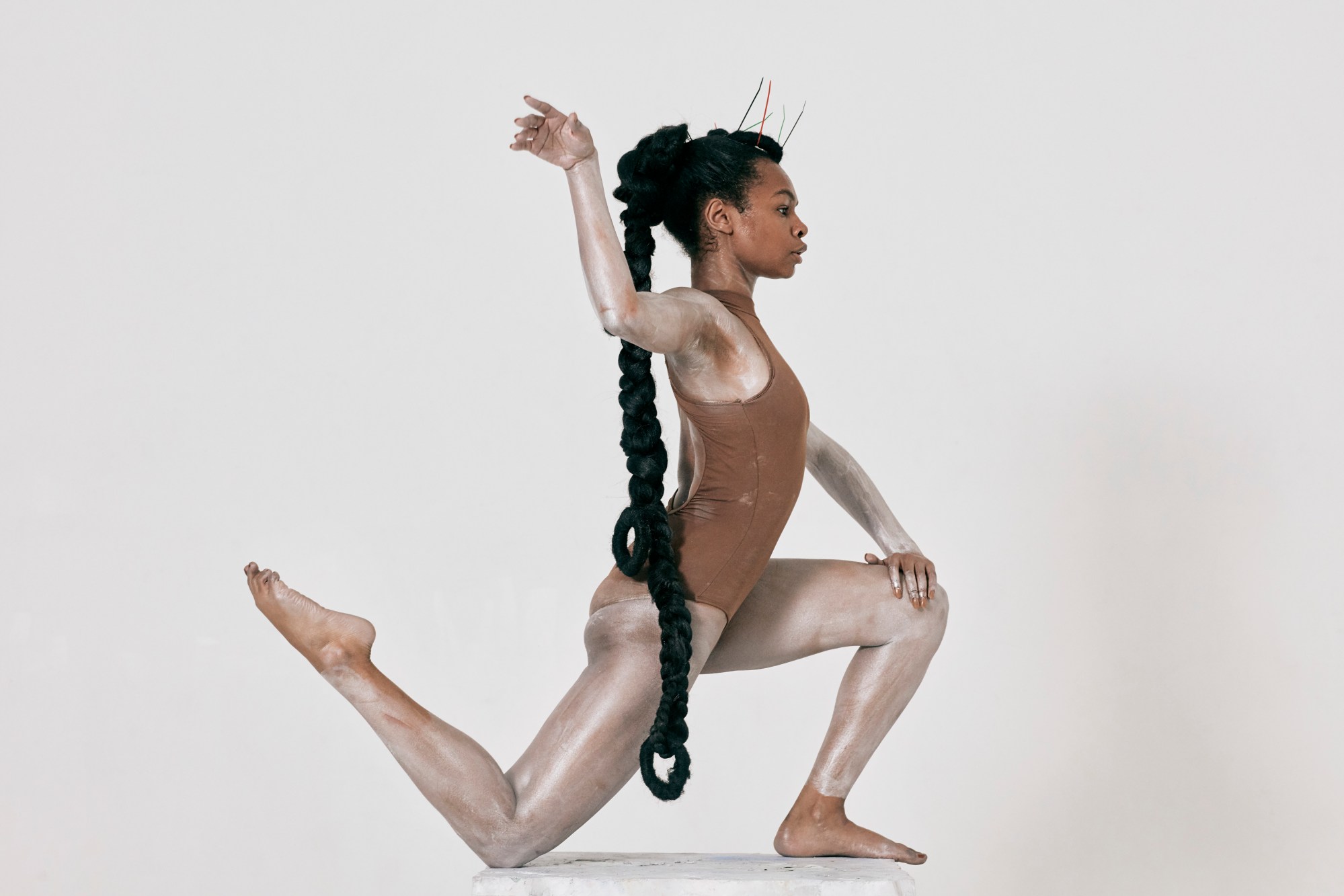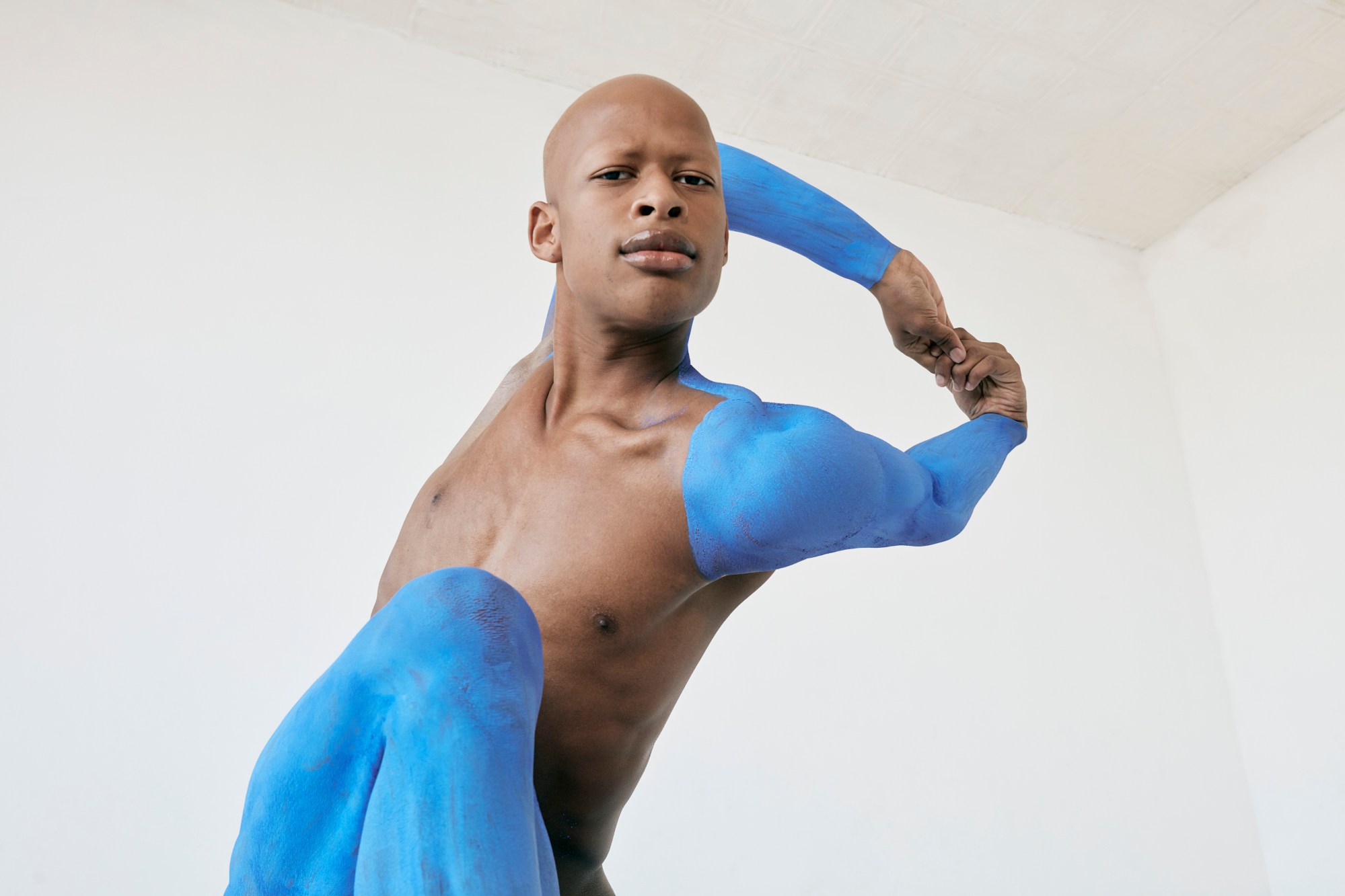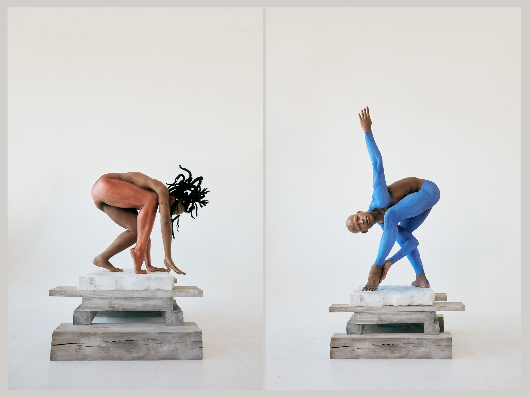 Each of her five models — all dancers — embody the proud shape and form of these sculptures, each nude, their bodies painted in ways that create illusions of where outstretched limbs begin and end. The dancers glide gently through the air to create a serene atmosphere reminiscent of the cavernous gallery spaces that are home to the artworks mentioned above. “I love working with dancers,” Erica adds. “The five dancers in this project come from various dance backgrounds. The melding of the different styles — from classical to hip hop, contemporary, and everything in-between — into a classical beat shows a beautiful juxtaposition and highlights strength and power in movement, as well as beautiful softer, more internal breaths of air — all things speaking to the experience of people of colour swallowed in a culture that always excludes them.