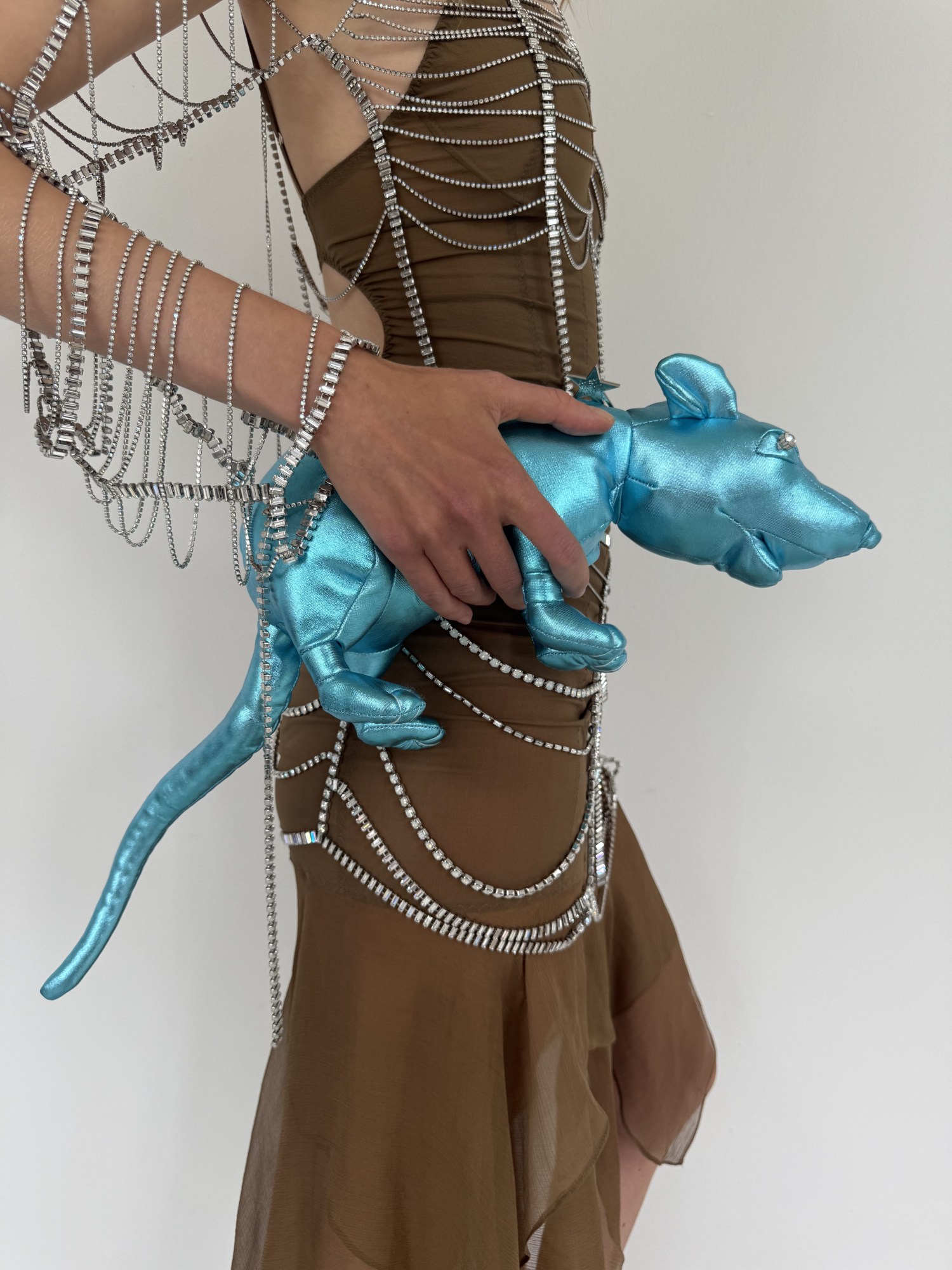 Madsen’s fine art background is how she met multi-disciplinary artist Esben Weile Kjær, current king of the rat sculpture. Last year, the Danish artist debuted a pack of fiberglass rats at the Danish pavilion at the Gwangju Biennale, followed by golden bejewelled rats at a solo exhibition at the Solar System af Kunsten. Both sculptures are now at different museums. He shrugs. “The rats travel a lot.” Clante, obsessed with the gold rat, and Kjær—a fashion lover who has collaborated with Madsen before—offered to make a new one. This time, it’s a plush little thing in bright colorways, with a star on the zipper.