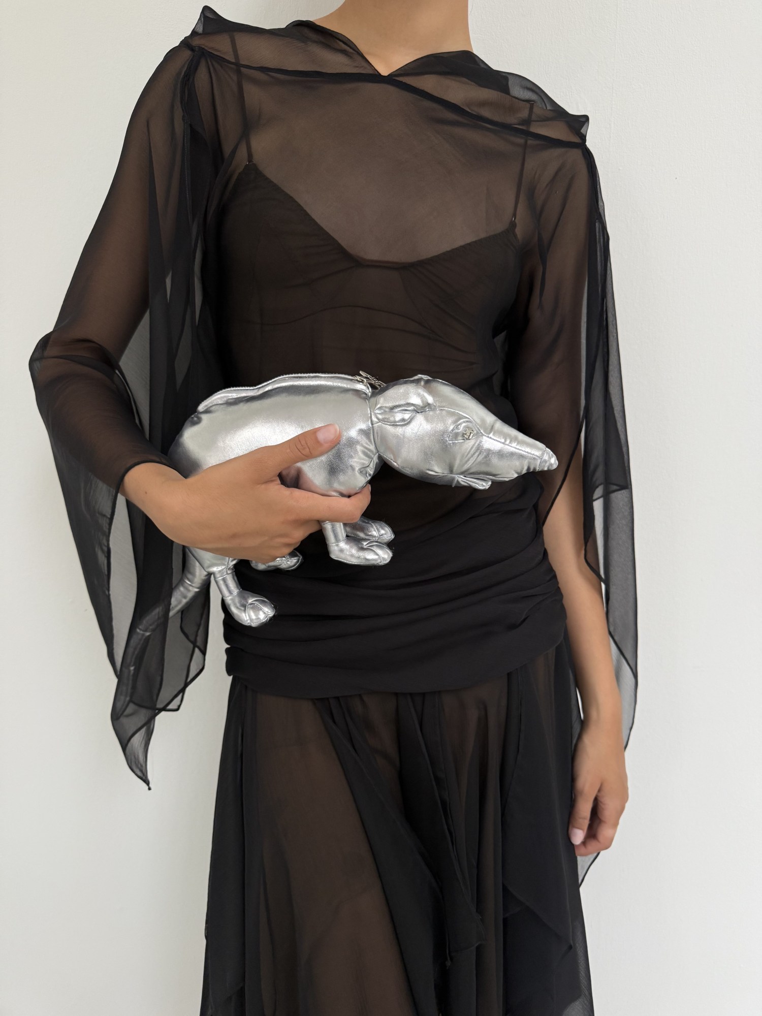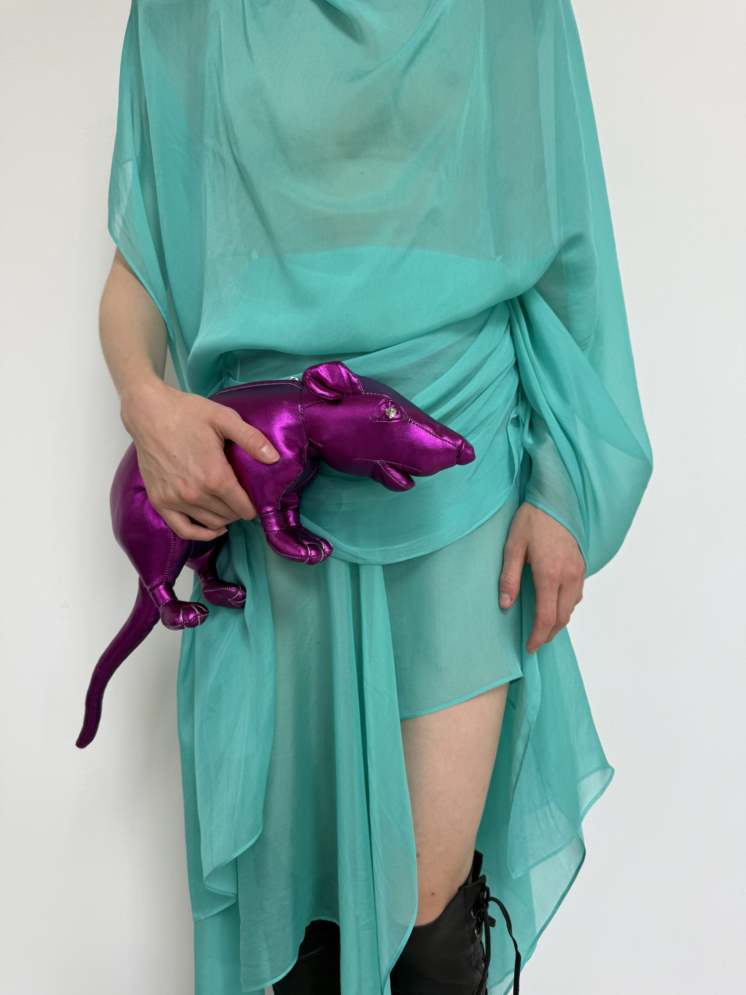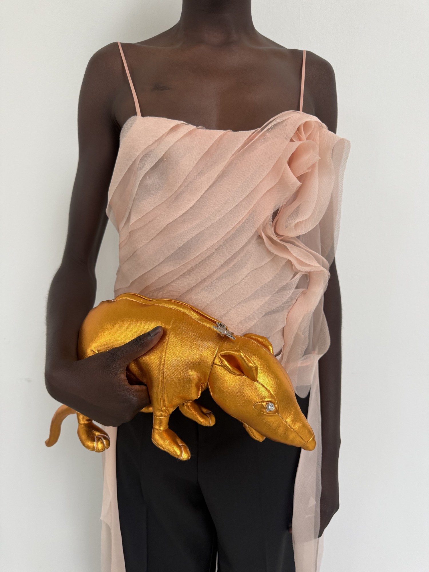 One of the most surprising pieces in the collection is a soft pink ruffled top. Madsen looks at it, amused. “It’s like Carrie Bradshaw.” Clante agrees. “It’s so cheesy but it’s right.” In cheesiness, there’s honesty. “We look at it this way—what are we longing for? The perfect little top to wear with fitted trousers.” What else are we longing for? A fab rat bag to go Ratatouille mode. Meet the Glam Rat Clutch: a high-gloss rodent turned it-bag, equal parts fashion and provocation.