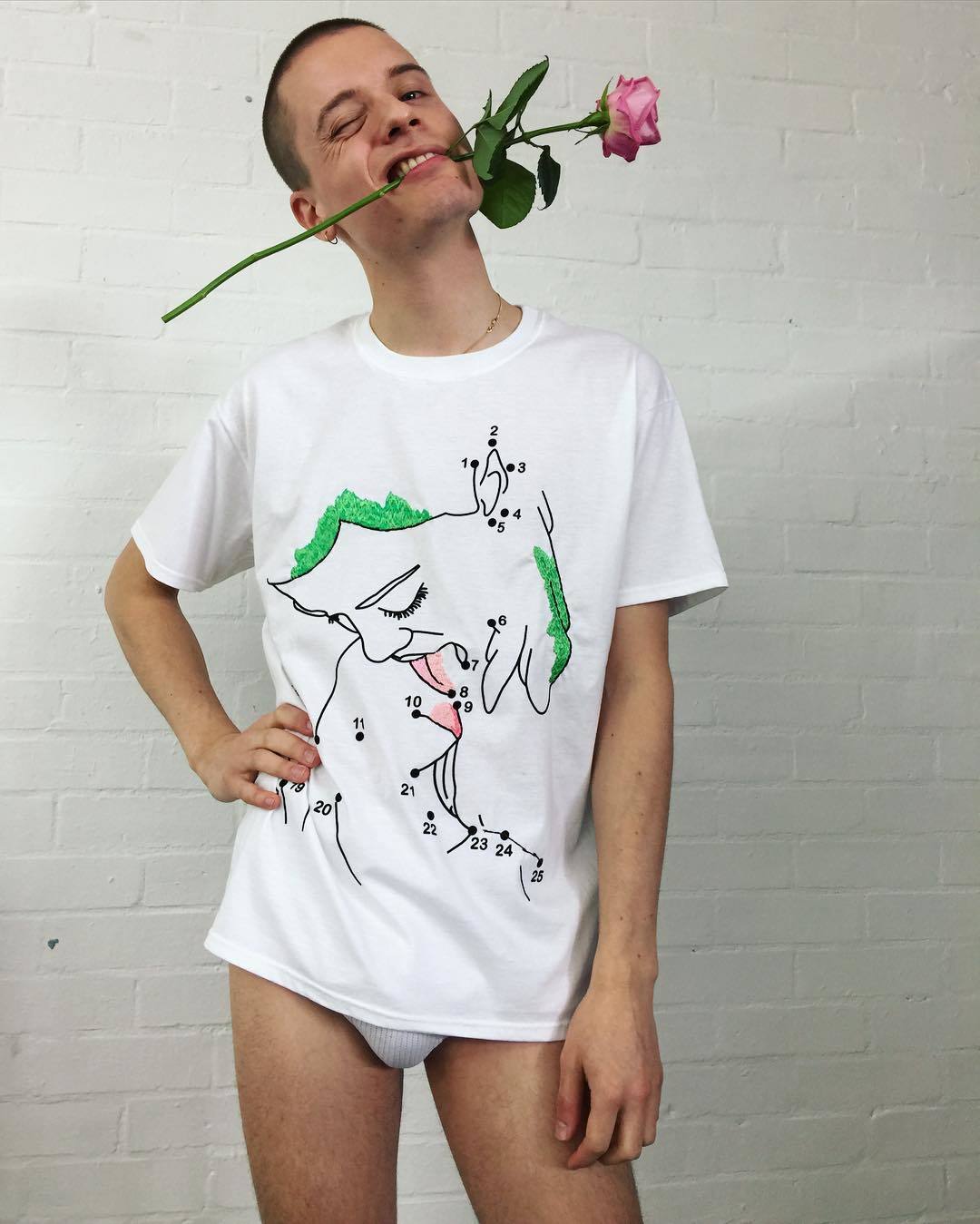 It’s something I’ve wanted to do for quite a long time, a T-shirt line. Seeing as our main conversation in the studio usually revolves around sex and boys, I thought let’s do something super sexy for the first one, because we’re planning to do three or four T-shirt collections every year. I wanted to do something that was kind of explicit, but not explicit, so you have to stare at it for a little while to make out what is going on. I love it when you’re on the tube and you see somebody wearing something that you can’t quite make out. There’s that slightly voyeuristic idea. If you saw somebody wearing one of those T-shirts, you’d want to know what it was if you joined the dots.