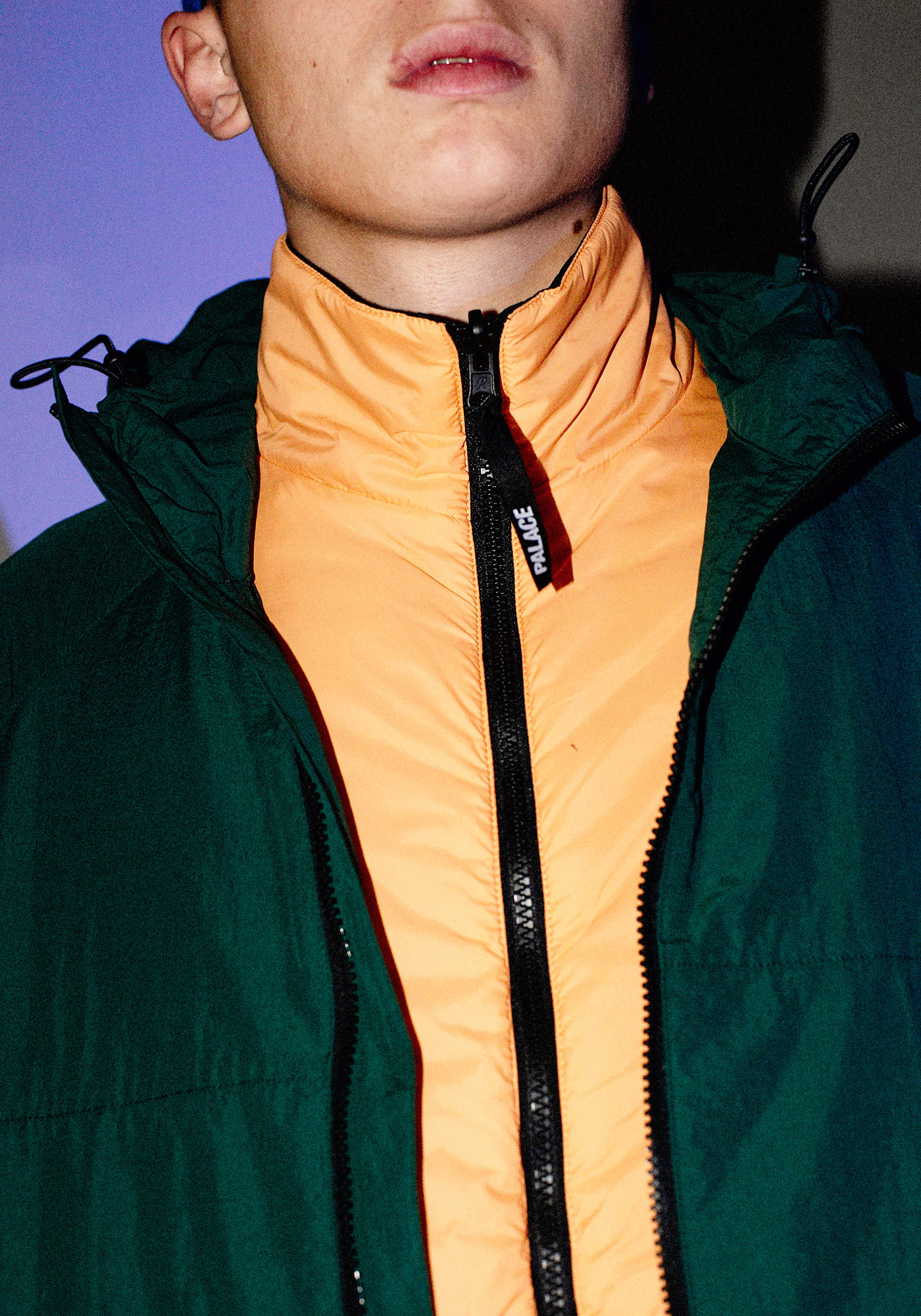 “We go out and look at things that we want to wear,” Lev said succinctly in an interview with i-D last summer. The “we” is important to Palace. It’s more like a collective of friends than a fashion house. As ideas bouncing between Lev and Nugget, the majority of visuals form from the daydream doodles of Fergus Purcell and Ben Drury. The good shit flows. So what is Lev excited about this season? “My favorite are the tracksuits and then this grey jacket with the zips on the front. Then these pink socks with stoned bulldogs on them,” he adds with a laugh. As Blondey models the mystical Palace Visions T-shirt, we press Lev on what his Spiritual Energist and Advisor sees in Palace’s future, his future, and our future? “Many pints,” he replies. We’ll drink to that! In the meantime, get drunk on Angelo’s shot selection below. If that leaves you wanting more, drink in the full look book here.