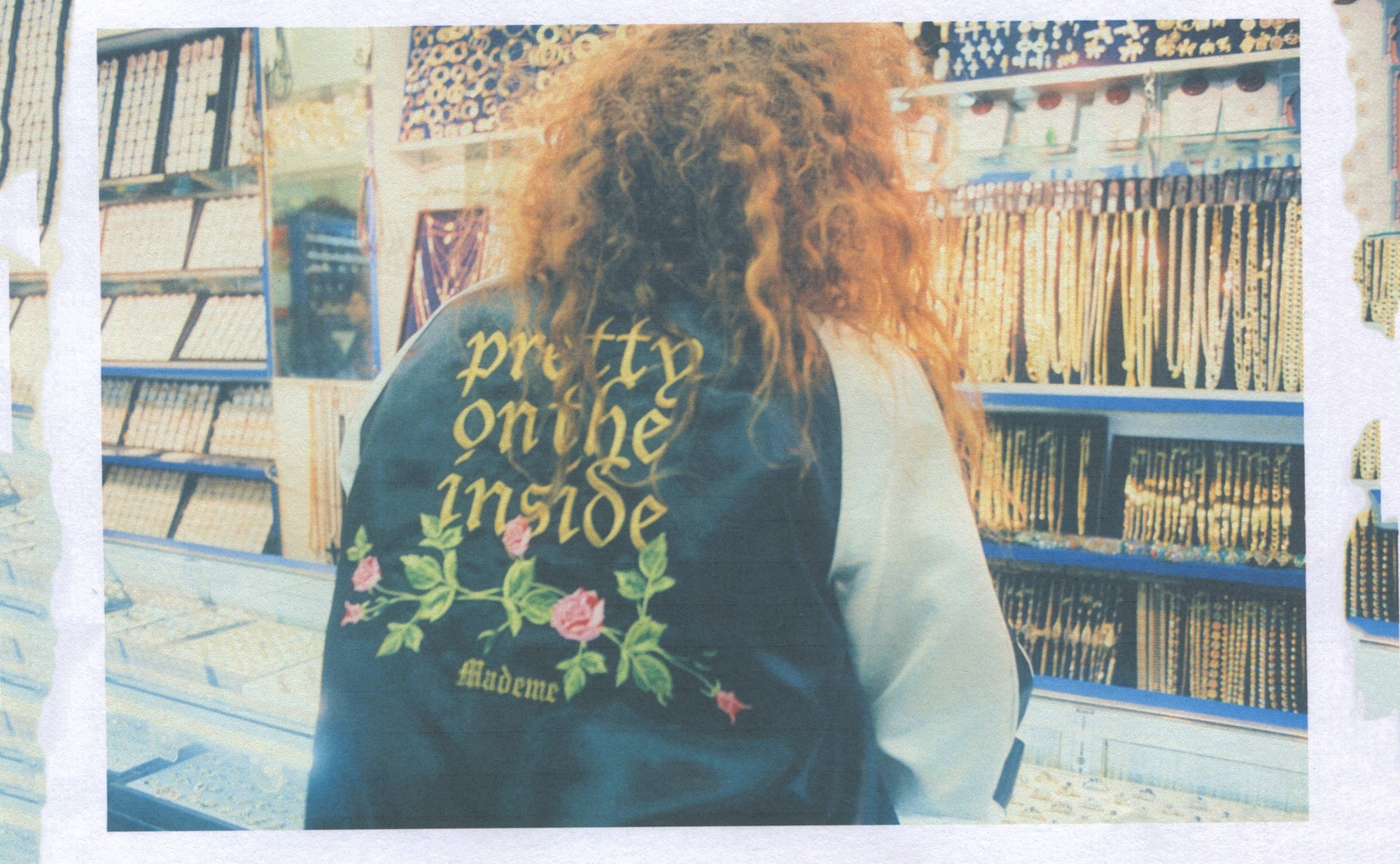 Featuring satin bomber jackets embroidered with phrases like “pretty on the inside” (a line lifted from Hole’s debut album) and tight pink tees, these spring offerings see Magee transition from 70s tartan to full blown 90s turf. Which is fitting, because we’re also psyched to reveal that come next fall, MadeMe will release a collab with Kim Gordon’s highly coveted cult label X-Girl. We caught up with Erin to find out more about her days as a riot grrrl and why she’d stay up all night watching Almodovar flicks with Madonna. To paraphrase Courtney Love, “Oh MadeMe over, I’m all I wanna be…’