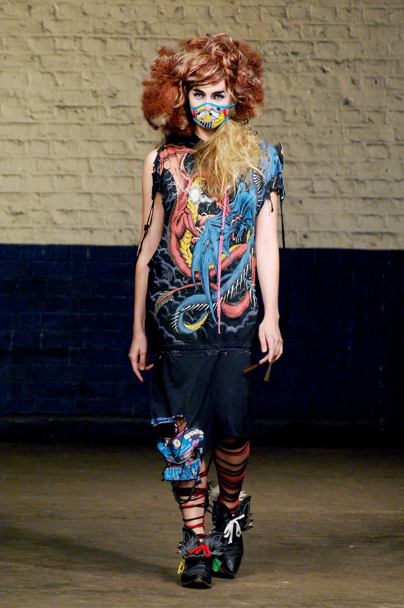 For his big debut, Matty Bovan sent a flurry of models down the runway all made up in his own image. Based in Yorkshire, hundreds of miles away from London, Matty would have to fit everything on himself, so naturally the collection ended up looking just like him. But to Matty, the collection was just a ‘greatest hits’ of some of his favourite things: “It was a celebration of a lot of my fave references — 80s downtown NYC, Keith Haring, Stephen Sprouse, Nina Hagen, very neon, very glittery, very in your face.”