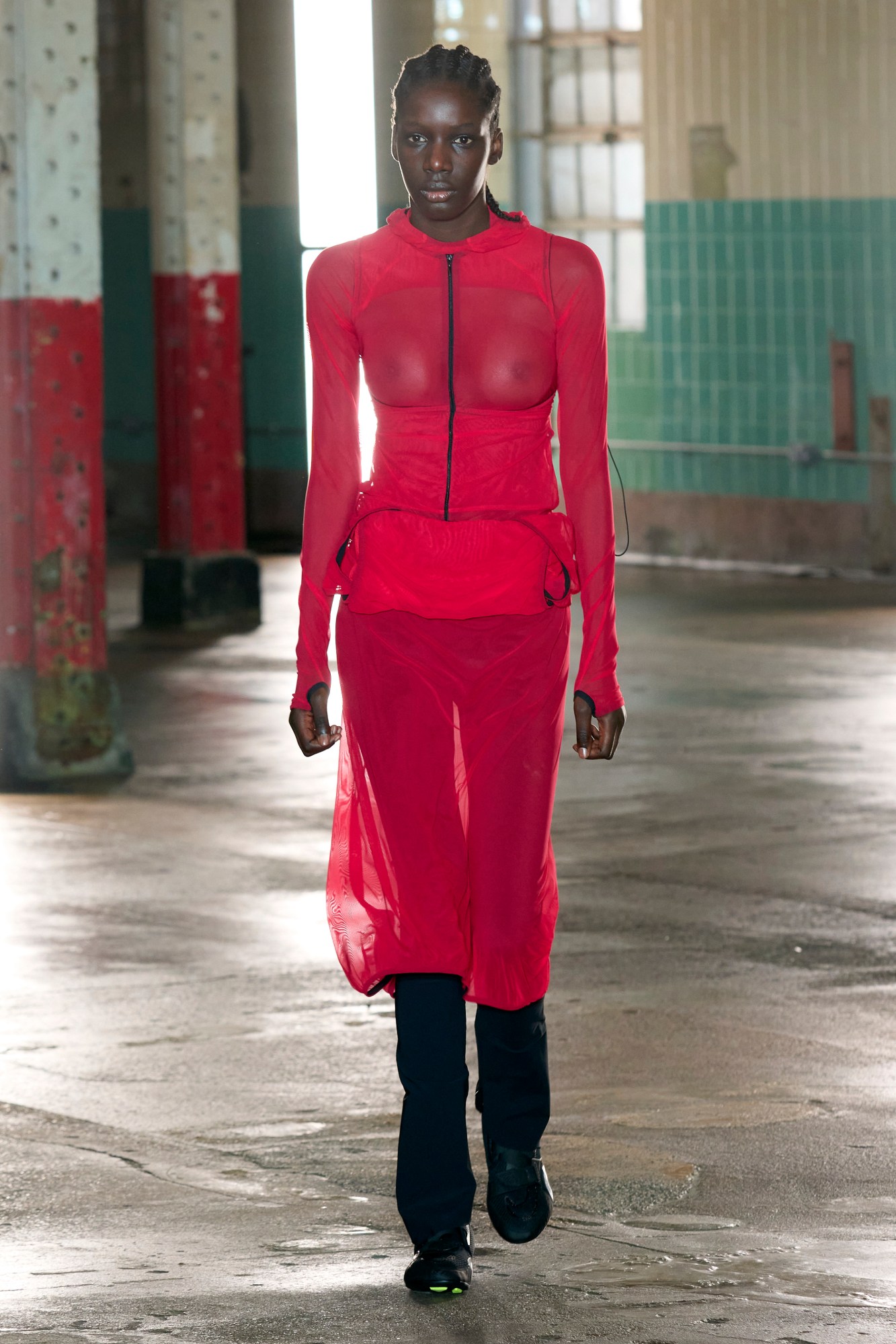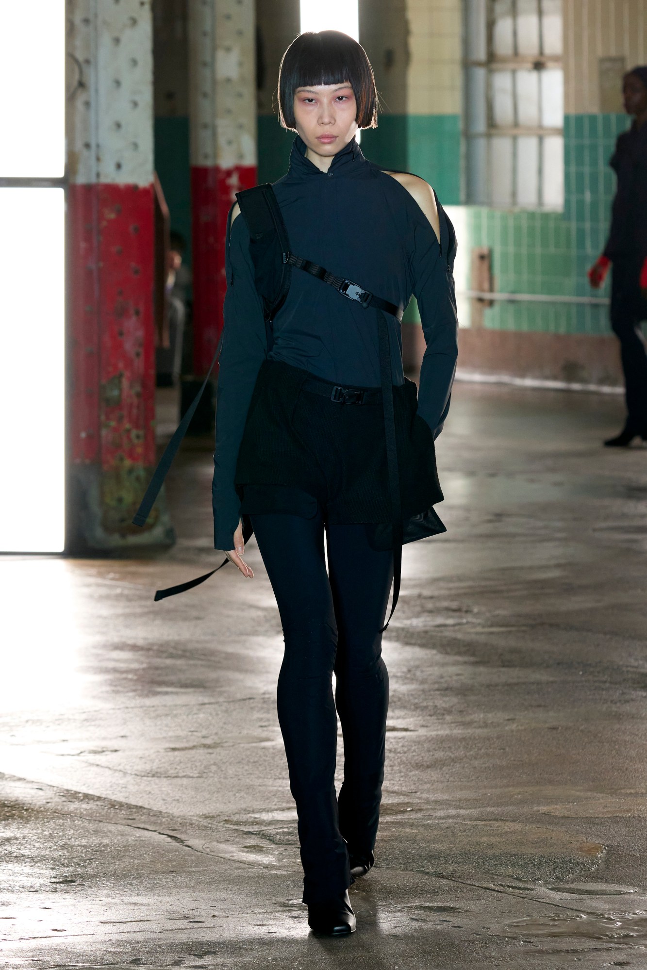 For her Fashion East debut, the Estonian designer presented a concise, elevated development on this vision. Collared cycling tops were constructed with slashed shoulders, bringing a dash of peekaboo sultriness to sporty staples, while nylon shirting and chic, asymmetric skirts were fitting with pulleys and toggles that allowed for garment to be adjusted to best suit the contexts they’re worn in. Bags came with straps that wrapped across the bust and fastened with easy-undo clips, and nylon chest rigs where layered over hooded dresses in gossamer mesh, resulting in looks that seemed to simultaneously nod to 80s Alaïa and the sort techwear you’d pick up at Decathlon.