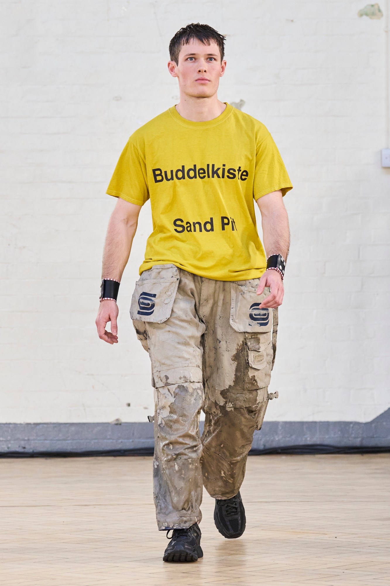 That latter feature made itself most prominently felt through the show’s casting, which featured a coterie of some of London’s most culturally astute, queer creatives, including artists Gray Wielebinski – soon to open a solo show at the ICA – and Michael Ho, regular i-D contributor Joe Bobowicz and BUTT Magazine editor Andrew Pasquier. The clothes they wore, marched out to a soundtrack mixed by Wolfgang Tillmans, represented Olly’s most distilled and conceptually effective collection to date, with staid hypermasculine archetypes subtly, sensually subverted through considered fabric choices and cuts. Styled by multidisciplinary artist Novacaine, hearty gingham shirts were spliced with Cordura nylon panels, and paired with press-studded shorts in the same rugged fabric, imbuing them with an almost fetishistic timbre. Mesh polo shirts came with zips down the flanks, opening up to reveal brazen peeks of the body beneath, while low-scooping vests and plaid harnesses served as architectural cladding for shoulders and chests. All around, an incredibly accomplished debut.
