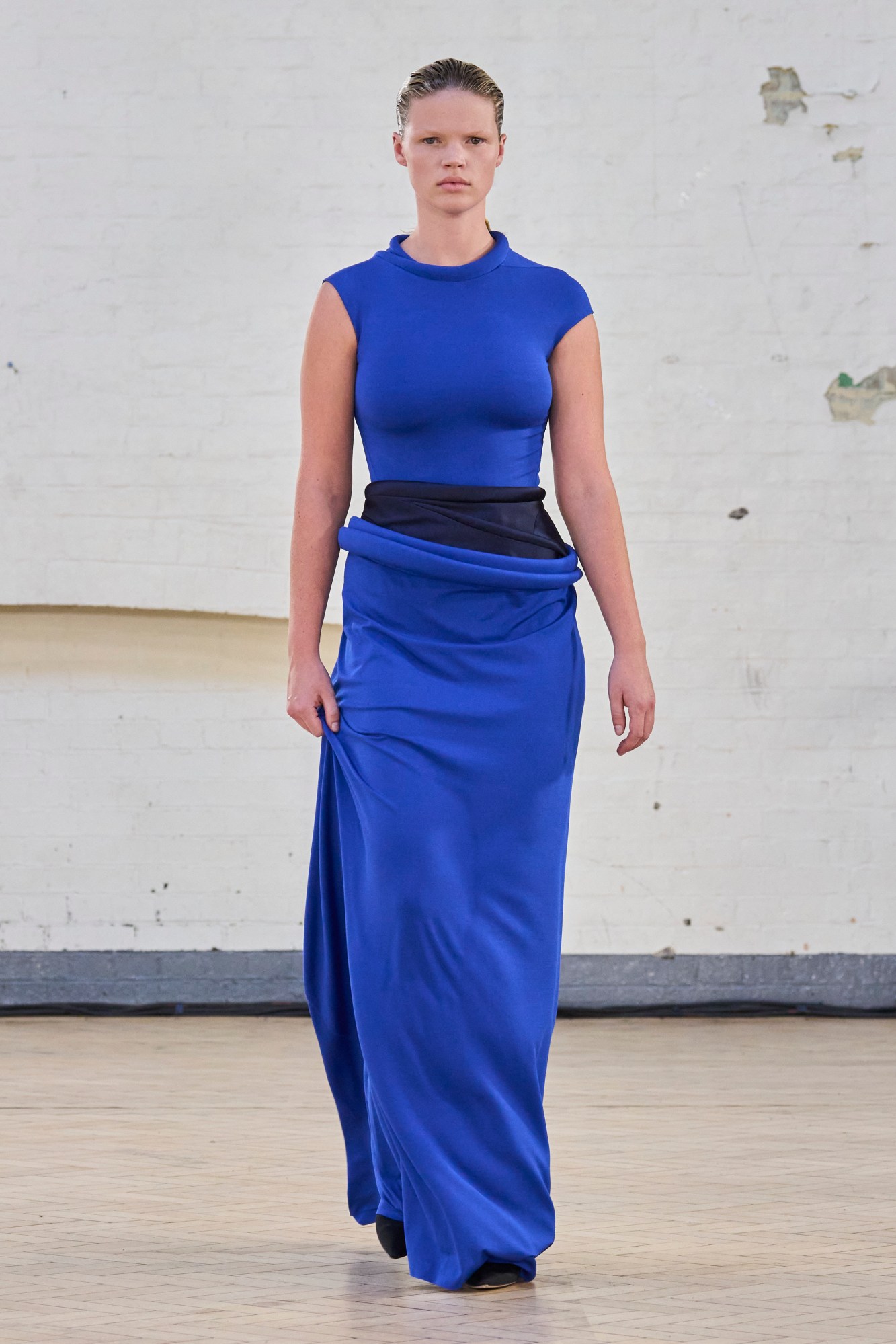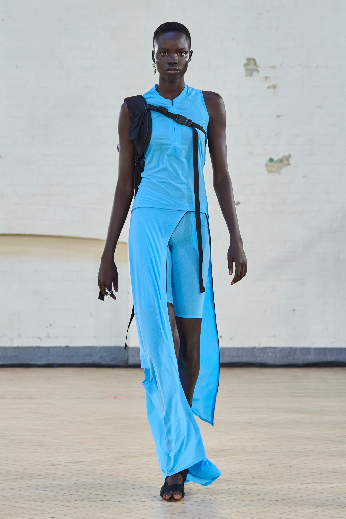 In a predominantly sober palette of blacks, blues and deep purples, Johanna’s wardrobe for her dynamic girl on the go comprised shirting with slashed shoulders, offering a sensuous take on an office staple, a timbre that carried over into asymmetric backpack-strap crop-tops and diaphanous recycled nylon vests. Gossamer gowns in white and teal swept the floor with effortless grace, but where constructed in a manner that accommodated handbags through discreet gaps in the fabric, resulting in graphically distinct drapes when worn on the shoulder. All in all, the perfect wardrobe for the glamour girl on the go.