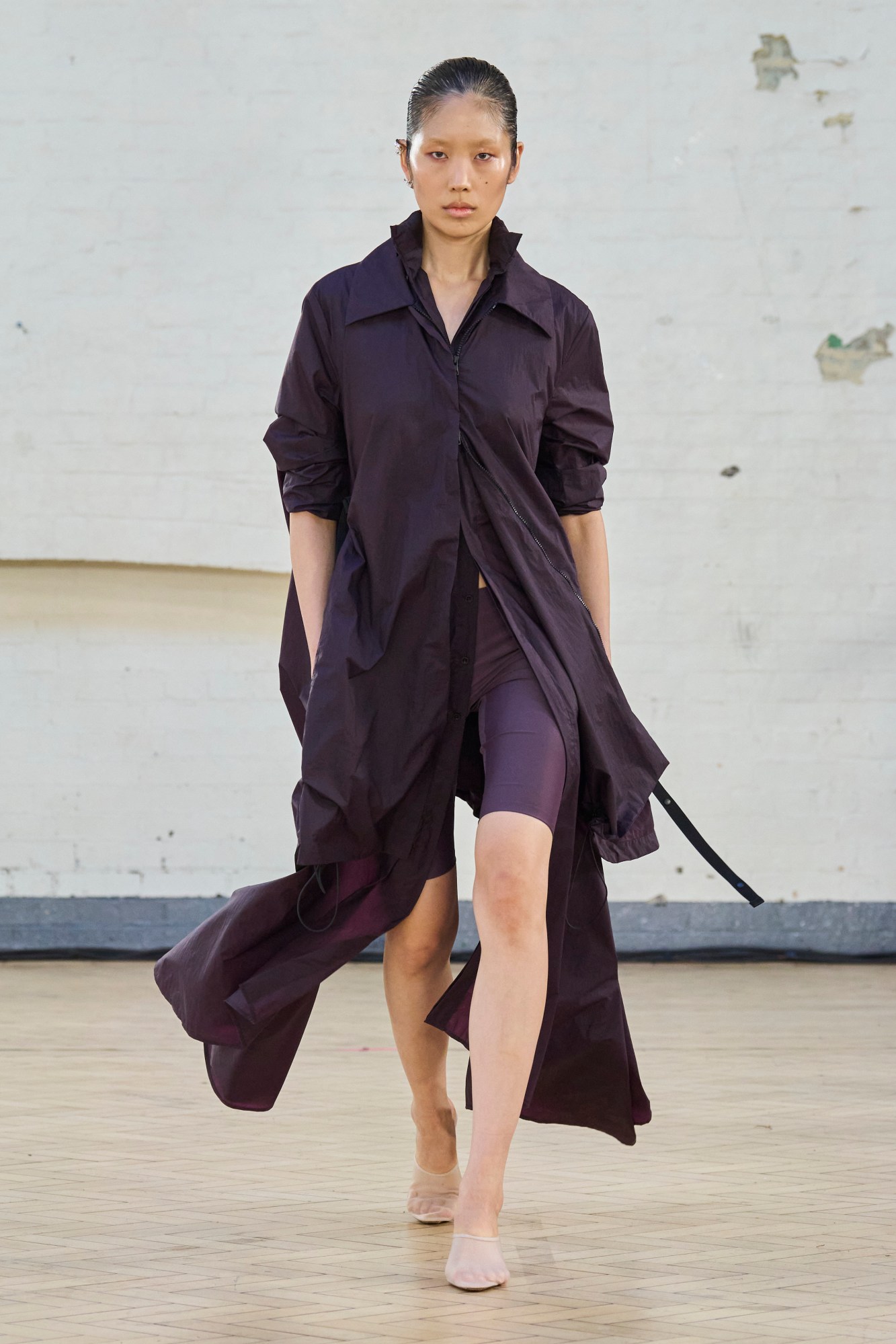 Continuing her exploration of the intersection between feminine power dressing and practically-minded sportswear, Johanna Parv sought to explore what she described as “powerful tranquility” in her shownotes, drawing inspiration from 50s and 60s dressmaking techniques and the urban women she’s sees around her in London on the daily — from lycra-clad cycling nuts zipping by on bikes to backpack-toting bankers on the tube.