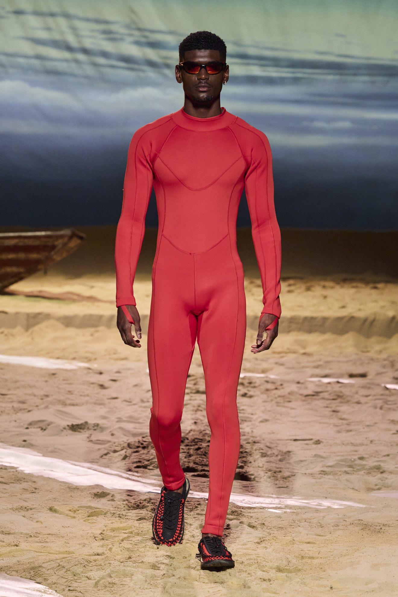 Those watching closely from the start will have picked up on the earliest hints of this new wave (sorry!) during the SS24 London men’s collections, when Saul Nash brought the Big Smoke’s fash-pack to a make-believe Mauritian beach, held inside the ICA. Here, an exposed stitch diver’s suit and body contour rash vests were teamed with branded towels and toggled budgie smugglers. Perhaps, this was a Freudian slip from Planet Mode as the industry’s hive mind wished it were someplace else that fateful June. Certainly, the hankering for sunnier climes was felt when Dsquared2 presented its ode to Miami Beach’s slightly trashy charm, serving up a sheer, strapless minidress with paillette sunset and palm trees paired with a shell handbag, plus topless, six-pack-flexing models in washed-out, distressed jeans and big-buckle belts. In part, it felt like a nod to the fraternal, surf bros that defined Hollister’s heyday, perhaps indicating our wishes for simpler, albeit blissfully ignorant times when all that mattered was getting a photo with the hot guy at your local mall.