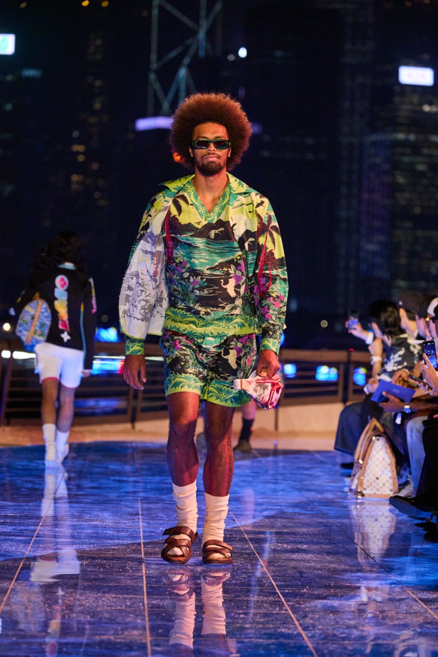 So far, so surfy. Then, just days ago, Louis Vuitton went full hog, taking us to Hong Kong via Hawaii for a business-meets-pleasure getaway packed with double-breasted, Hawaiian printed suits, floppy surfer locks, and LV-emblazoned wetsuits complete with reinforced knees to ward off surf rash and colour-blocked leg panels. On foot, the rubbery, bulbous shoes looked perfect for wading out to sea without getting stuck by a sea urchin, or simply strutting along the digitised waves that lit the catwalk. Even bomber jackets and cycle shorts morphed into neoprene surf gear, while trunks and keepalls were transposed with tropical illustrations or trinketed with crab keyrings. And yes, that was an LV surfboard you saw.