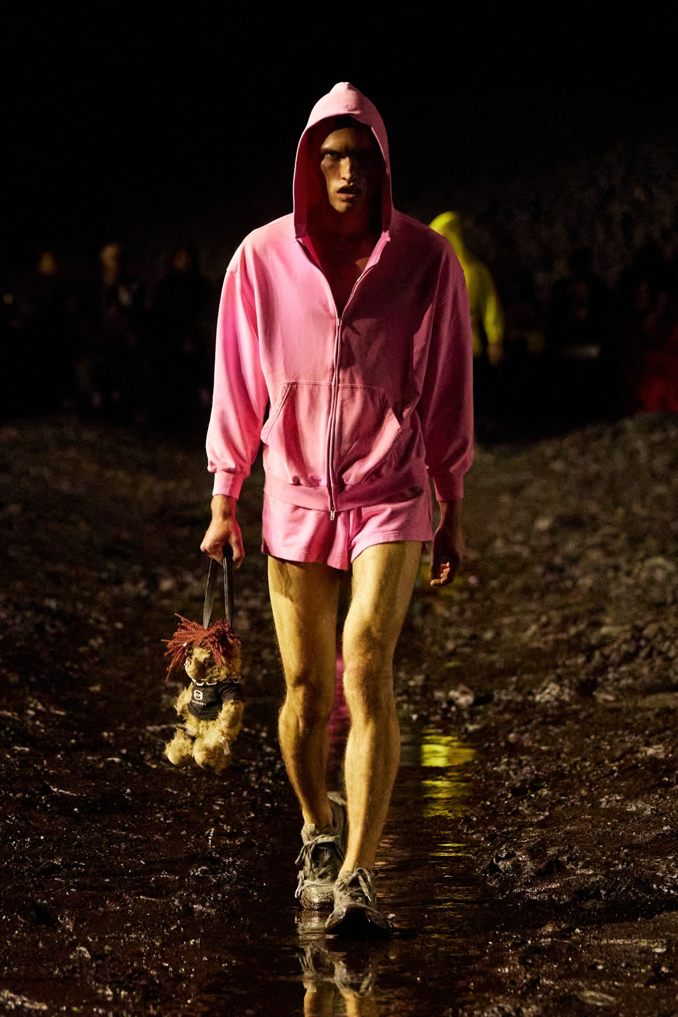 “I hate boxes and I hate labels and I hate being labelled and placed in a box,” Demna announced in his Balenciaga show notes. “I’ve decided to no longer explain my collections and verbalise my designs, but to express a state of mind.” True to his word, Demna’s collection defied typical binaries – couture versus streetwear, luxury versus democratic, consumerism versus art – and instead amalgamated various characters into one rugged vision. As strong as his professed revulsion for boxed-in thinking may have been, there were hints that the designer still harbours a soft-spot for the toybox. Dressed in neon go-go shorts, MA-1 bombers and mosher jeans, models crossed a mud pit with punky plushies in toe. Rocking neon mohawks soon to be caked in dirt, the adorable fluffballs looked almost like Berghain regulars, decorated with studded harnesses and barbell nose rings to boot. Remember when Woody meets the toys under Sid’s bed in Toy Story? That vibe. Less creepy, though, were the baby dolls slung models wore slung across their bodies, an uncanny addition to the runway that even the sternest editors fawned over.