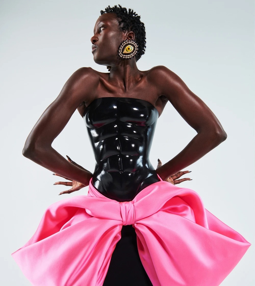 Of course, these muscular motifs are deliberately theatrical. They’re almost like props in a playful satire of the men who spend hours chiselling their physiques. Still, the fact that fashion’s engagement with jacked bods has typically been limited to menswear speaks to wider social preconceptions; namely, the false belief that defined muscles are synonymous with masculine strength. That’s why seeing them in Schiaparelli’s womenswear collection felt not just uncanny, but subversive. This was Daniel’s goal all along. “It’s about blurring the traditional lines of gender stereotypes while still celebrating femininity,” the designer explains. His muscular bodice, for example, is complemented by an exaggerated pink duchess satin bow, highlighting that flamboyant displays of femininity and depictions of women’s bodily strength are not mutually exclusive.