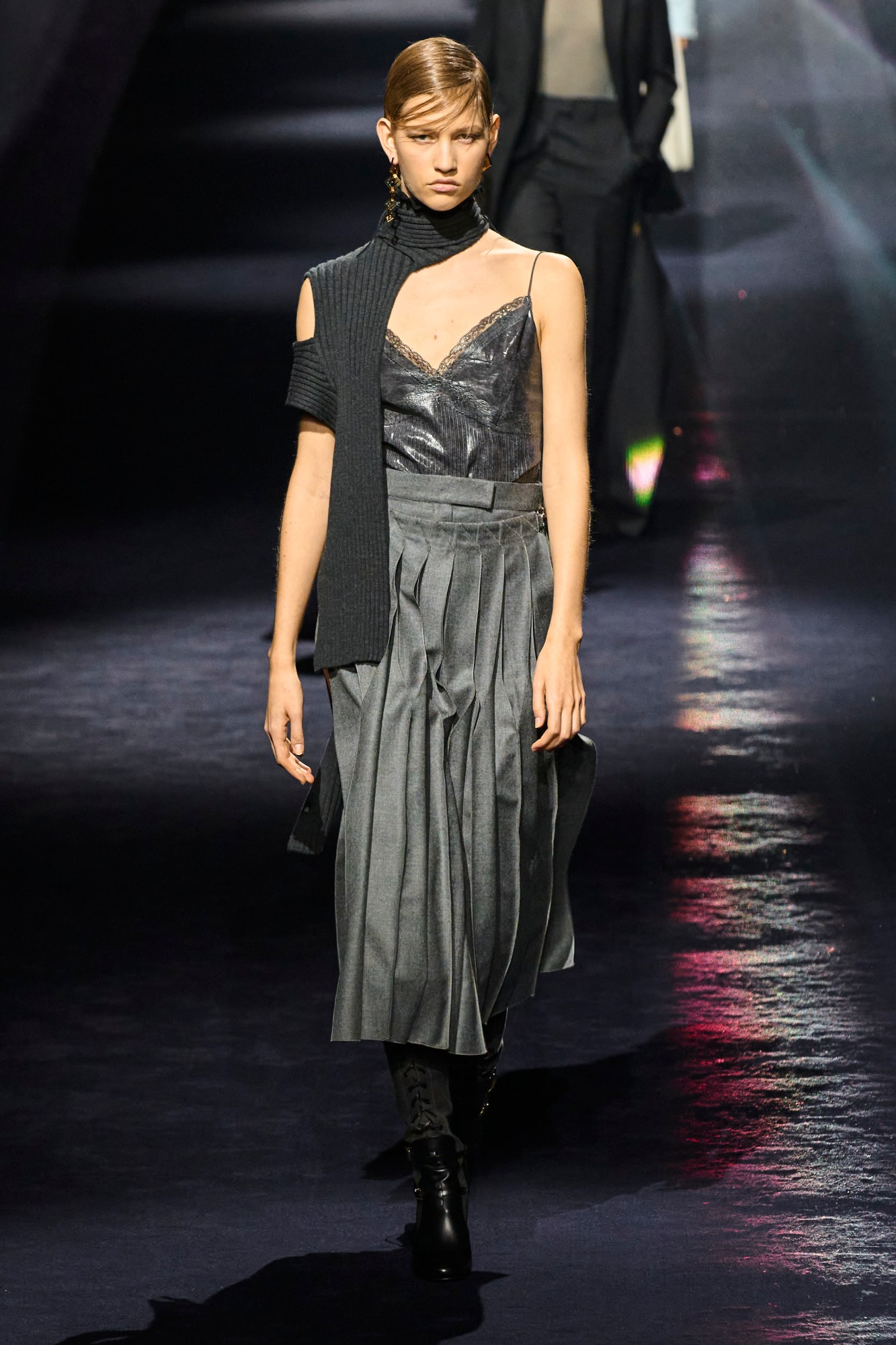 As the show progressed, it offered the hallmarks of a traditional wardrobe, much of which was borrowed from menswear: apron pleated skirts, blue cotton shirts, grey sweaters, beige macs, charcoal tailoring — it all hinted at school uniforms; simple clothes designed to transcend time or status. Kim is British, after all, and what Brit doesn’t love a uniform? However, this being Fendi, it’s all about standing out from the crowd, pledging your allegiance with double-F monogram earrings and an array of new bags. Every piece of clothing that hinted at uniformity was, as Kim described it, “twisted”. Those Catholic schoolgirl shirts had delicate lingerie pressed onto them; waistcoats came backless with caped shoulders; sweaters sinuously writhed around the body as long, open-backed dresses; the macs came with sequin-lined lapels or in Persian lambskin; the schoolyard tailoring elongated and hybridised with workwear jackets. It served as a reminder that although there is a demand for straightforward, timeless clothes at times of socio-economic uncertainty — they also need to be special enough to make us really want to part with our rapidly devaluing cash.