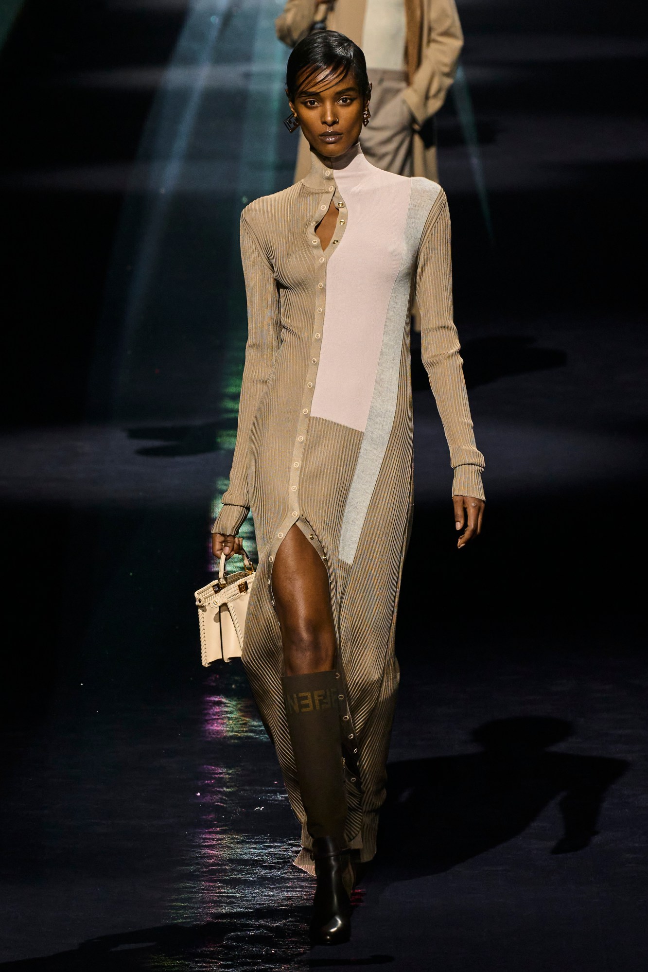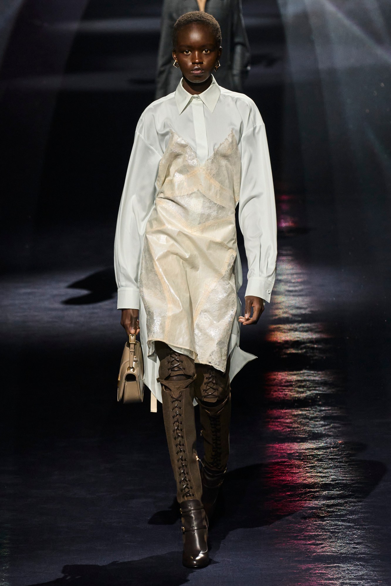 Fendi’s latest show began with a laser light show, rainbow-spectrum strobes zipping through the dark catwalk staged at the brand’s Milan showroom. It set the tone for something brooding, perhaps even a bit sci-fi, to emerge from the shadows. Instead, what became clear from the first few looks of Kim Jones’ AW23 collection for the house was a sense of something lighter and much more quotidian; a wardrobe of daywear grounded in reality that felt like an antidote to the ornate negligée gowns that they showed for Fendi’s couture last month,or even the hyper-luxe furs and logomania that the late Karl Lagerfeld established as the house’s DNA. This was a collection that ostensibly examined the uniforms of our lives, perhaps even our childhoods — and twisted every piece to create something more complex. It offered a delicious paradox of uniforms for individualists, archetypes of austerity reimagined in luxurious splendour. “That duality is very Fendi, as is the idea of something which appears simple but, in reality, is very complex,” Silvia Venturini Fendi, the house matriarch and the designer of its menswear and accessories, reminded us in her statement.