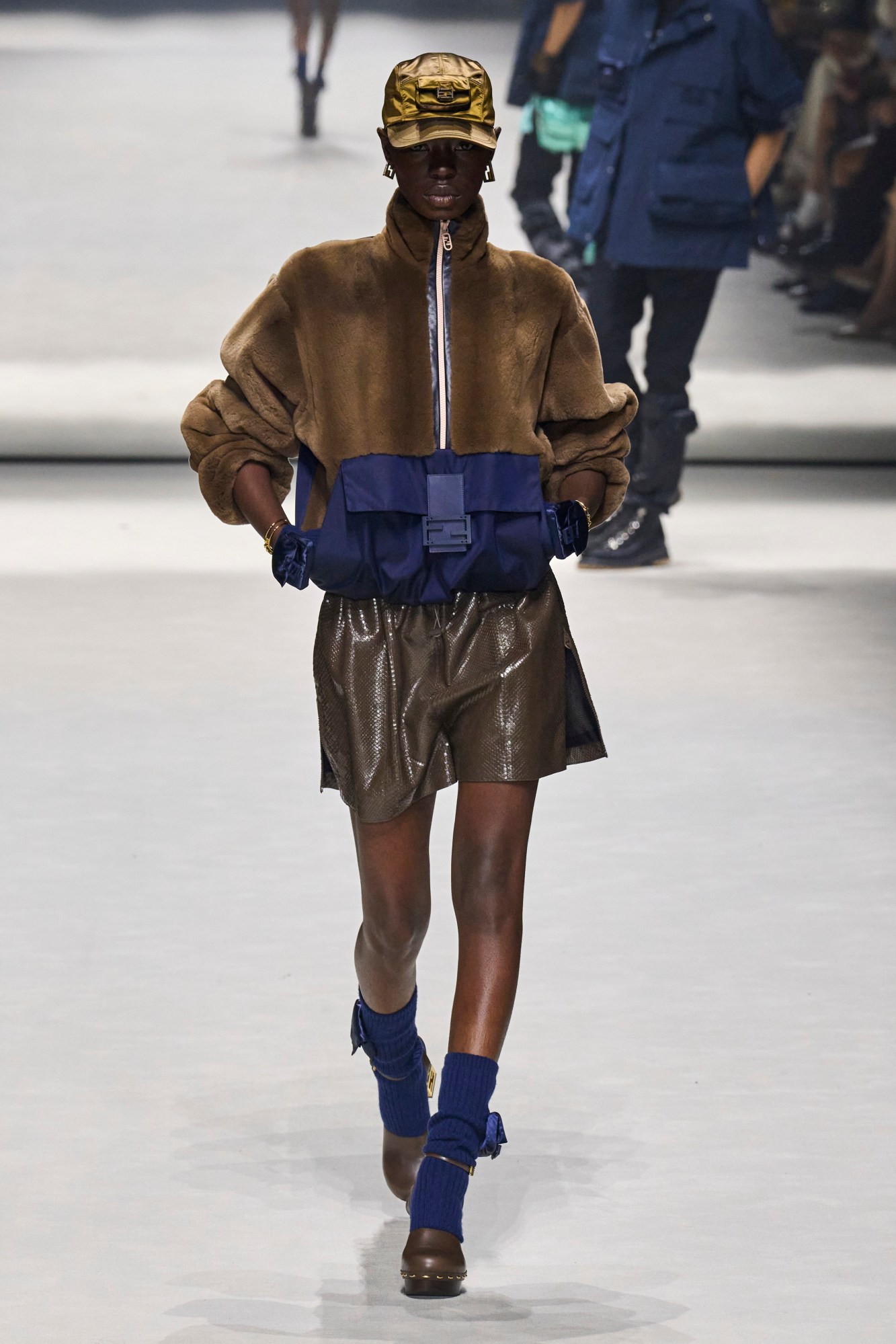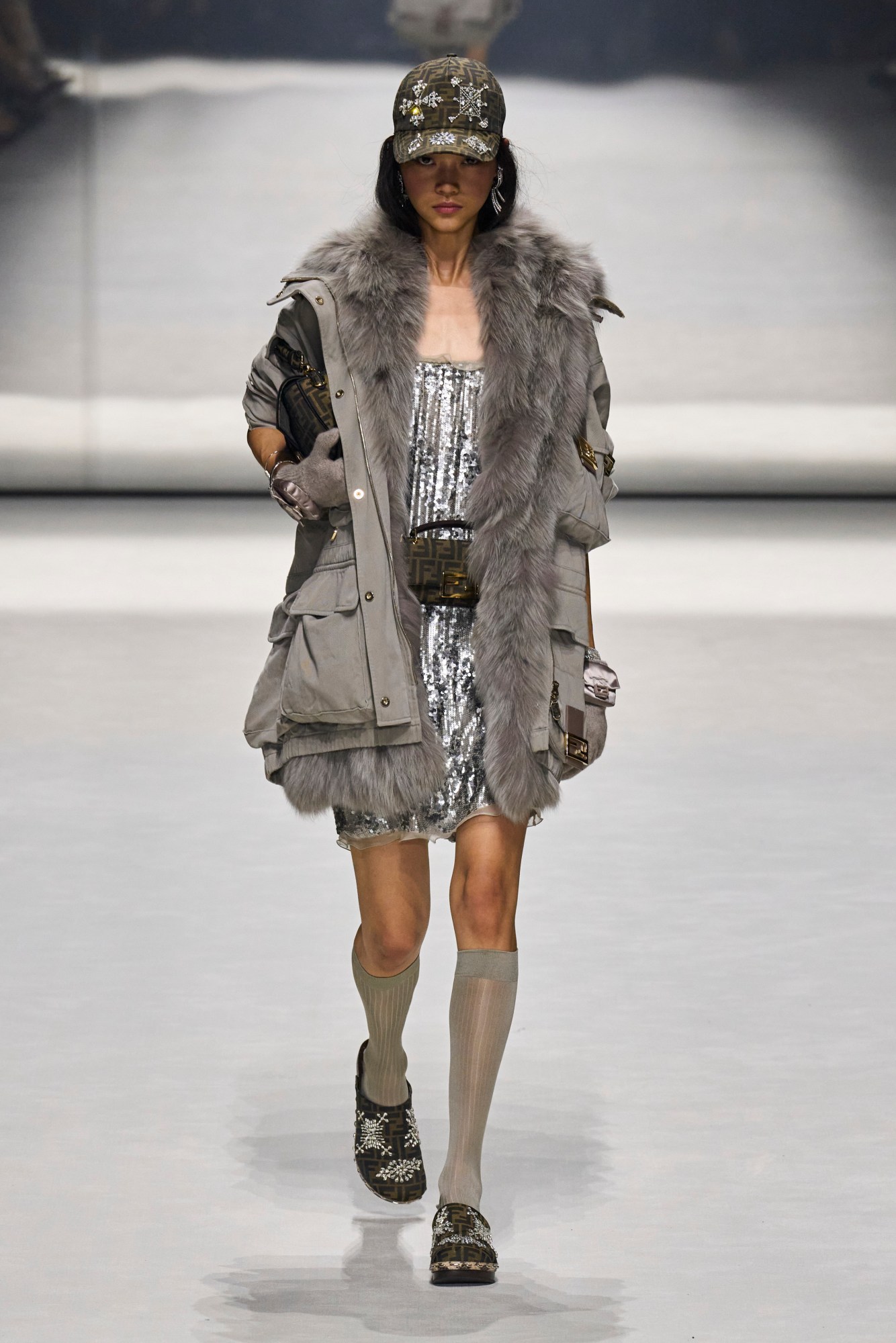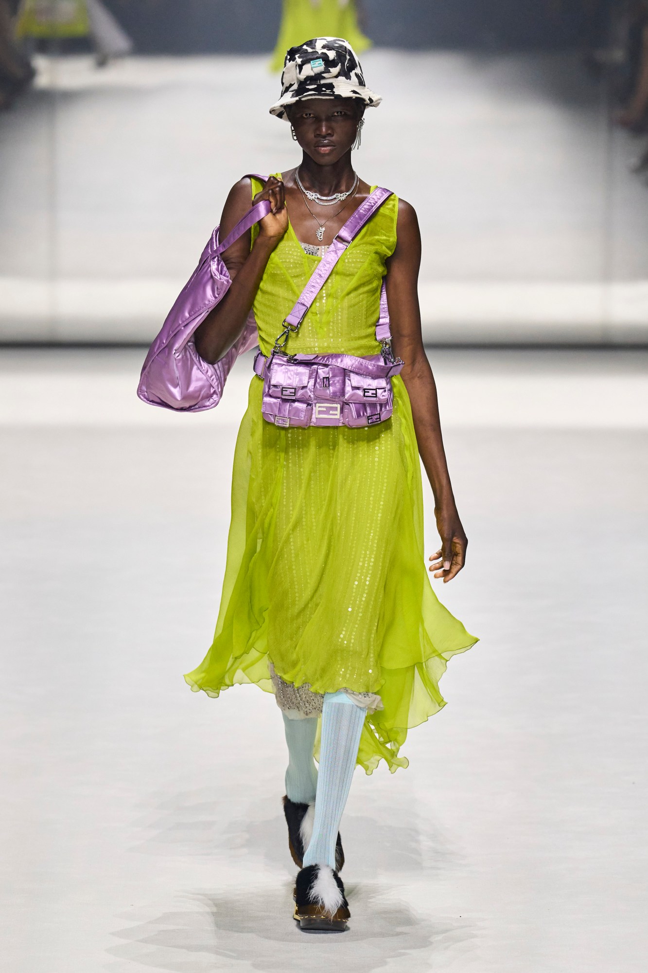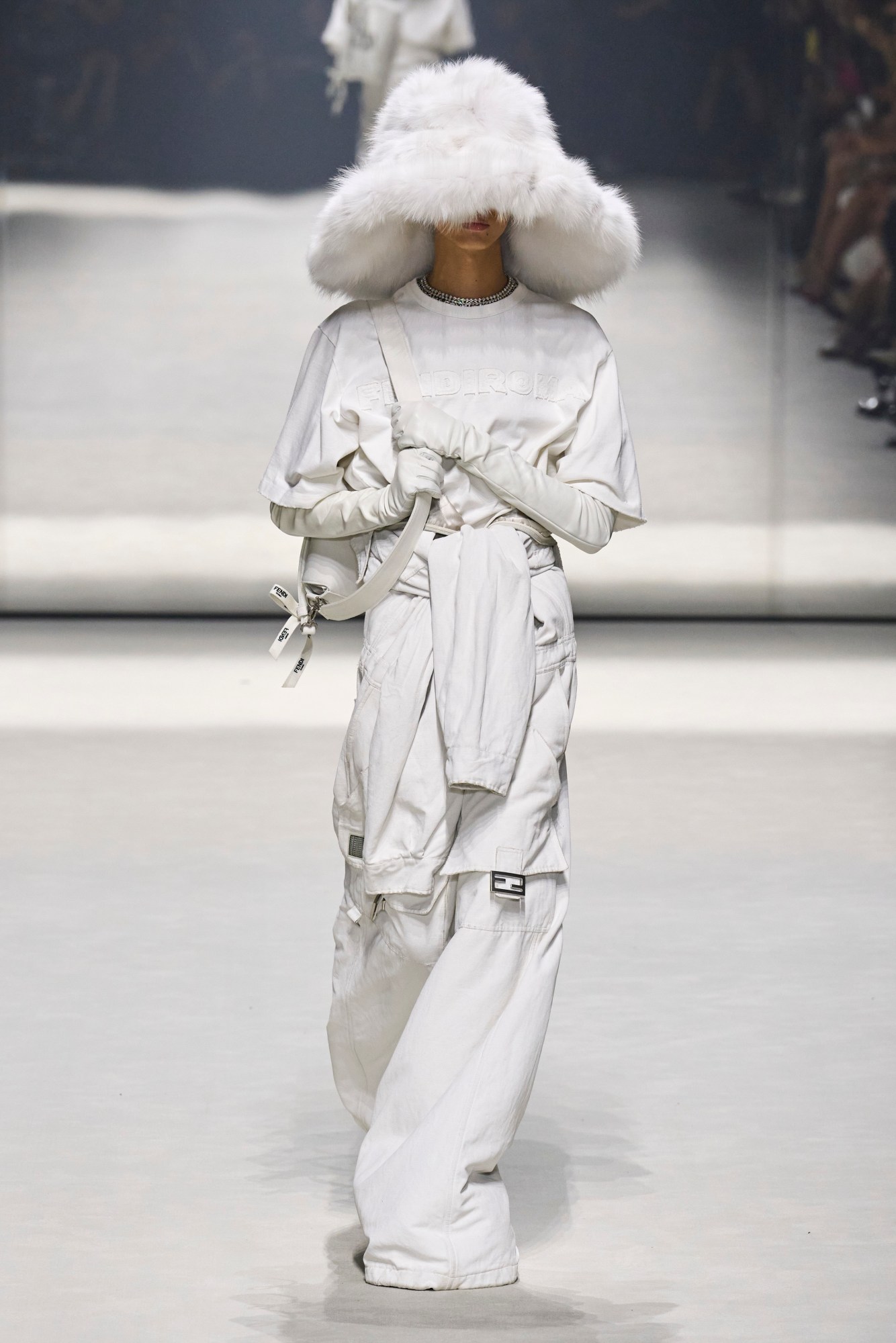 It was the energy of that time which Kim Jones drew on for his collection: yes, there were Baguettes in abundance, affixed to gloves and gaiters and beanies; inbuilt as pockets into tops and cargo skirts; suspended as earrings or dangling as charms (“We’re probably the world record holders now for number of bags in a show,” Kim grinned.) – after all, Fendi has long played in the domain of irreverent takes on utilitarianism, and that sentiment was writ large in Baguette font across the collection. But, beyond the literal, there was a clear homage to the era within which the bag was conceived. “I was thinking about all those different girls running around New York at that time, being busy and loving fashion,” he explained. “It’s that mix and match thing: putting fabrics together than you wouldn’t normally. It’s a bit off-piste for us but it feels exciting.”