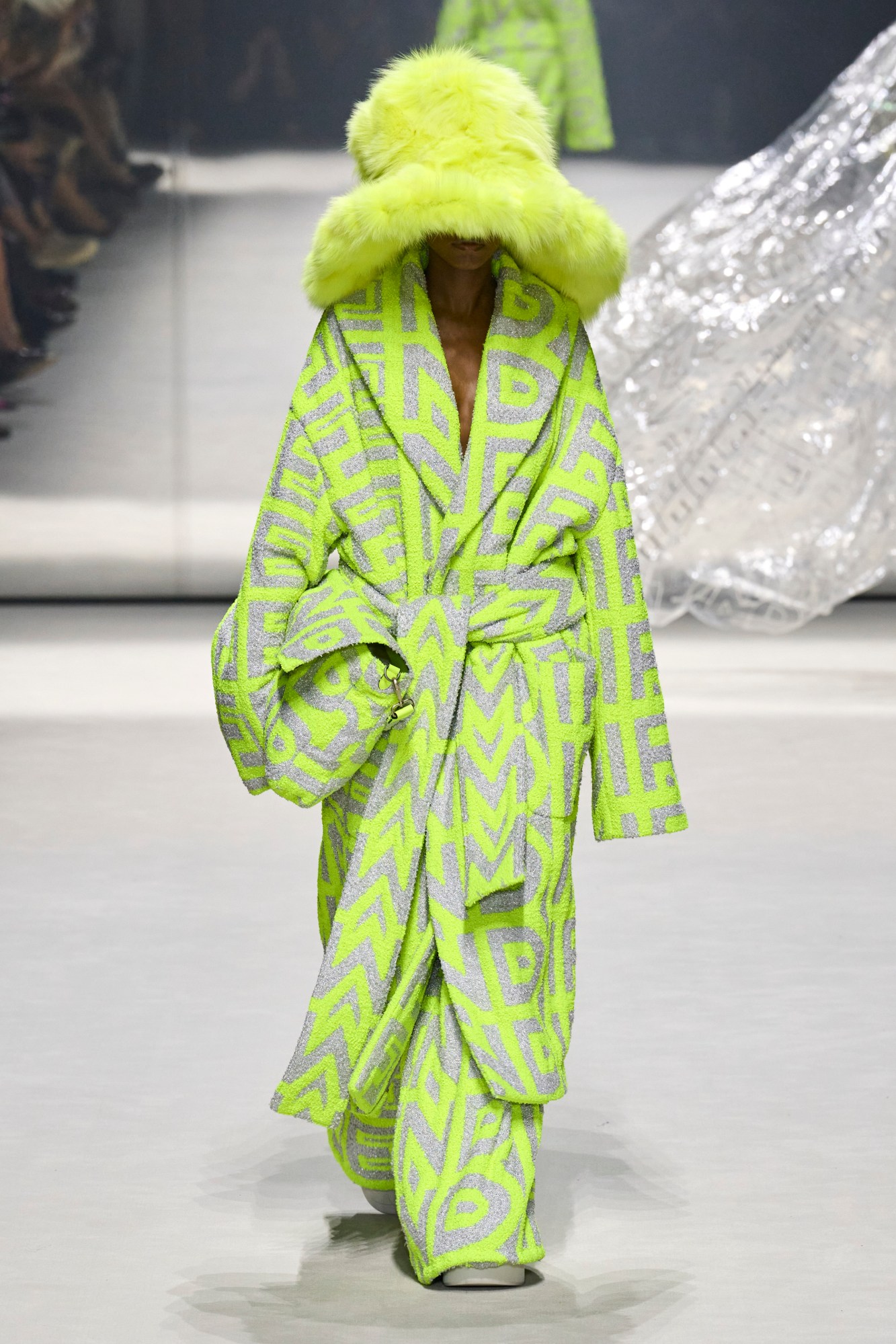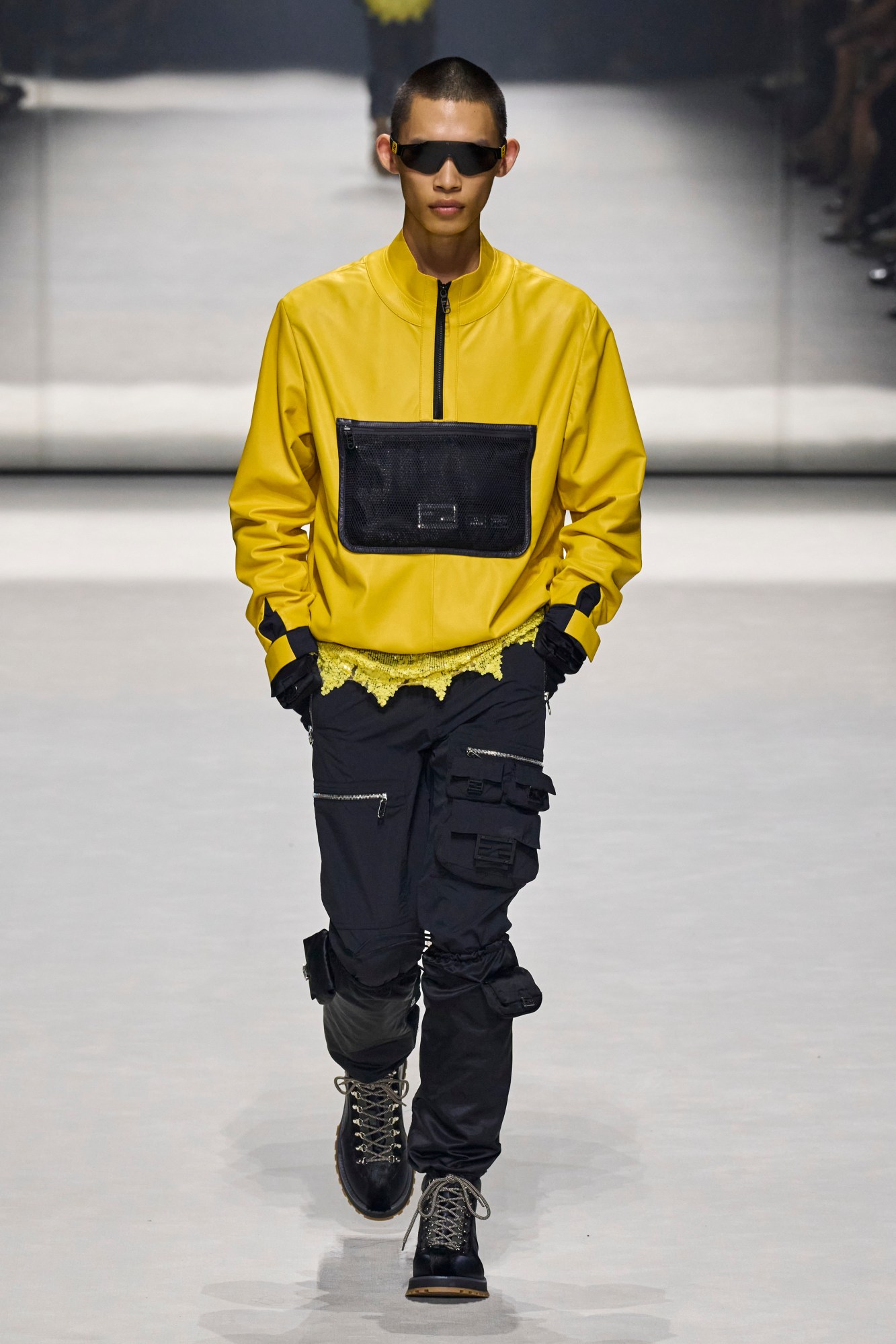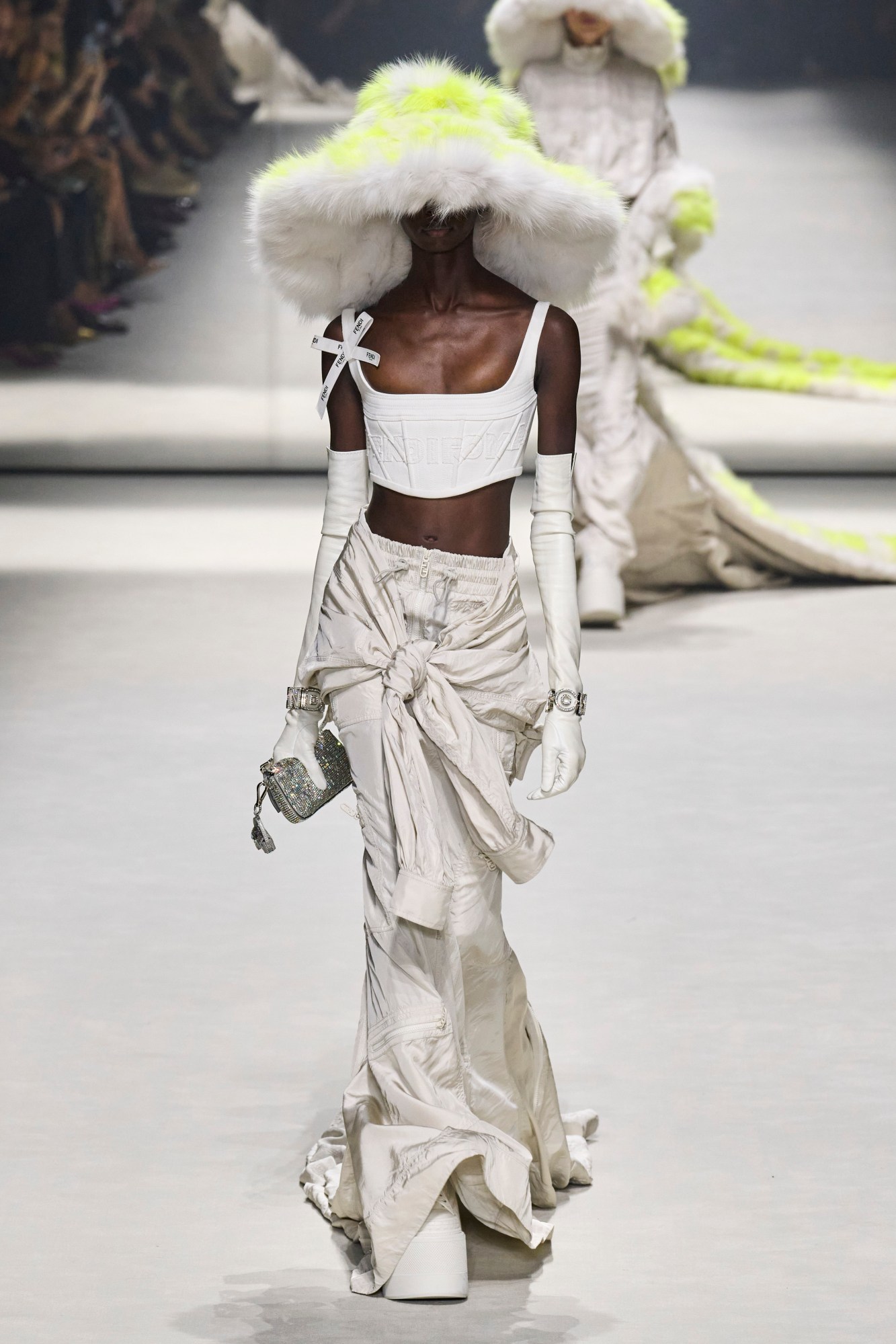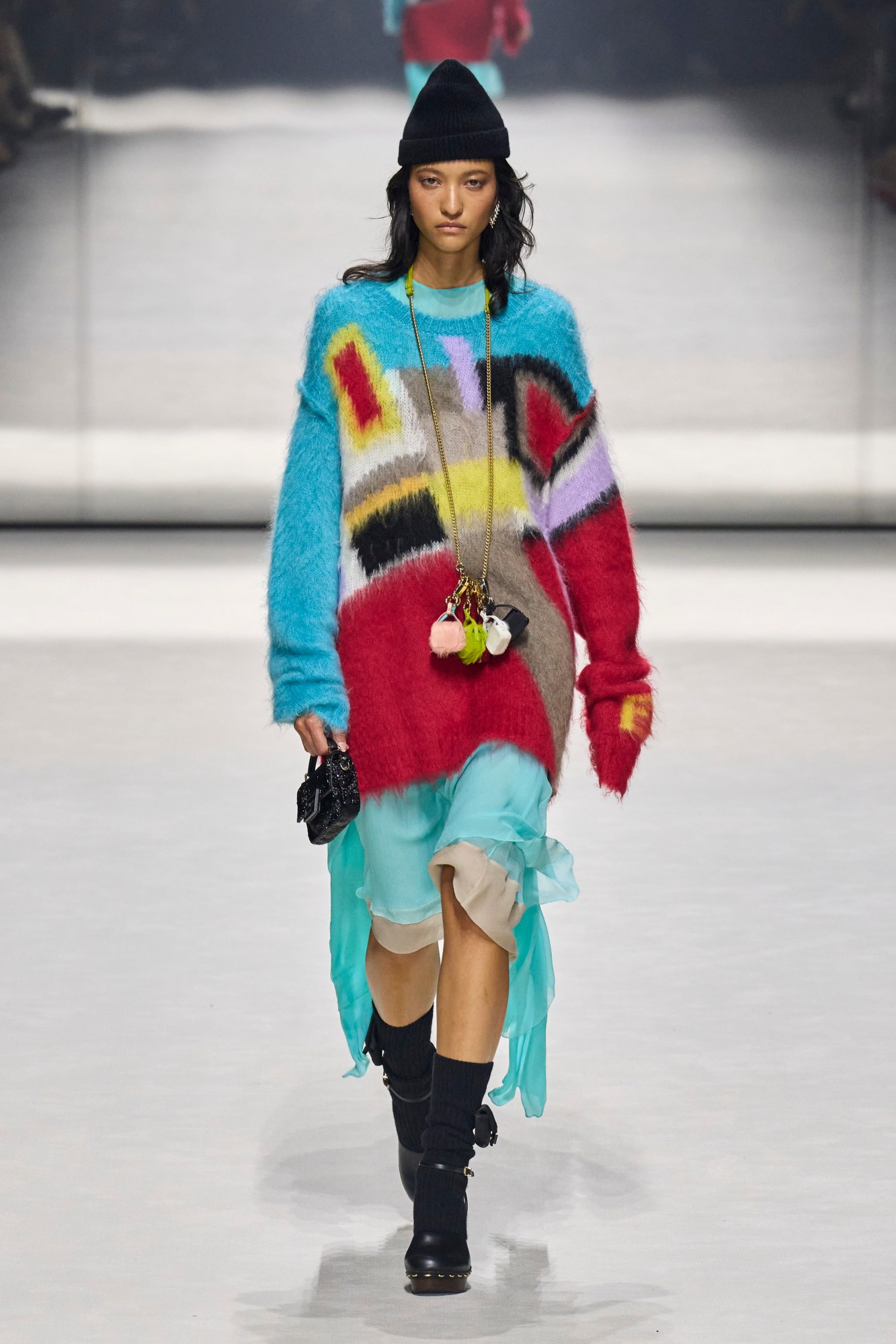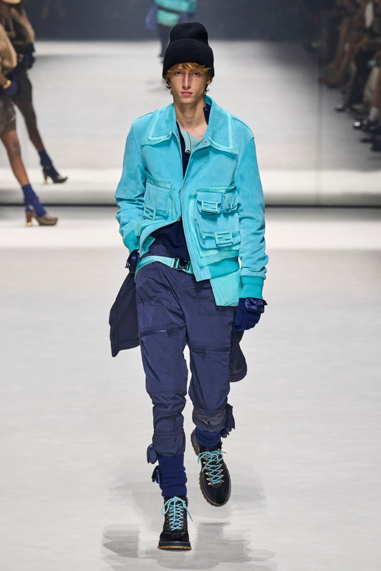 It was the energy of that time which Kim Jones drew on for his collection: yes, there were Baguettes in abundance, affixed to gloves and gaiters and beanies; inbuilt as pockets into tops and cargo skirts; suspended as earrings or dangling as charms (“We’re probably the world record holders now for number of bags in a show,” Kim grinned.) – after all, Fendi has long played in the domain of irreverent takes on utilitarianism, and that sentiment was writ large in Baguette font across the collection. But, beyond the literal, there was a clear homage to the era within which the bag was conceived. “I was thinking about all those different girls running around New York at that time, being busy and loving fashion,” he explained. “It’s that mix and match thing: putting fabrics together than you wouldn’t normally. It’s a bit off-piste for us but it feels exciting.”