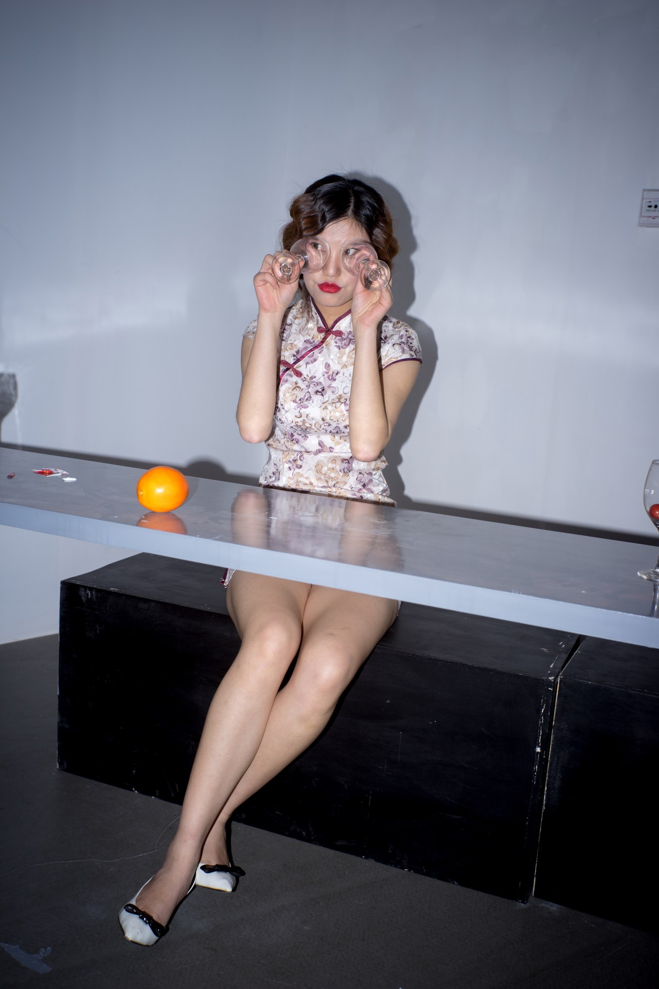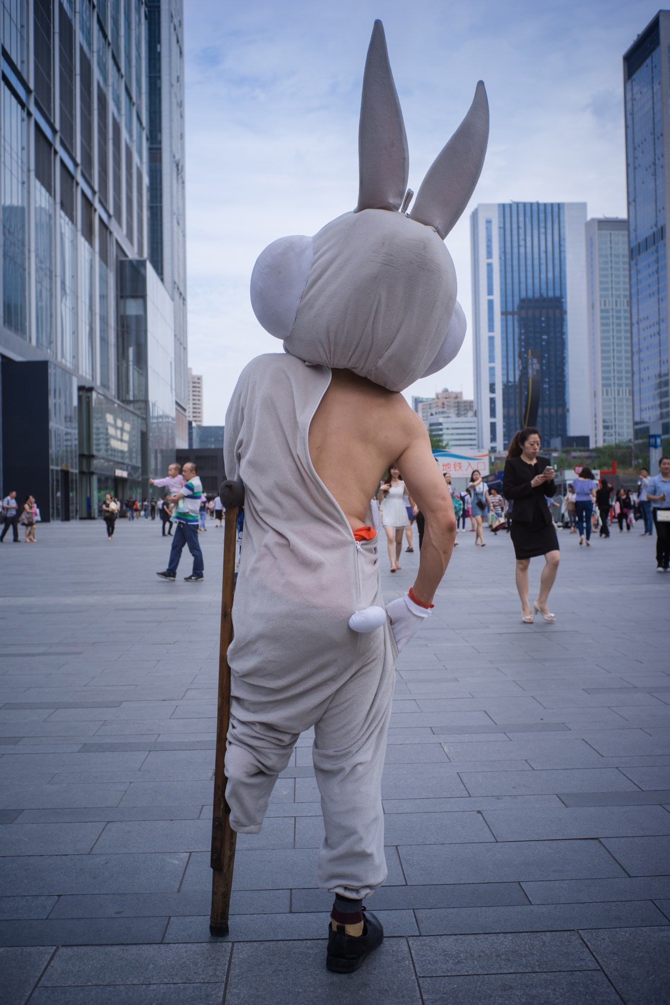Snapping pictures daily in the streets of Chengdu — capital of the Sichuan province and one of the most populous cities in Western China — chance encounters provide him with a constant source of material. His vision is characterized by surprising juxtapositions, tongue-in-cheek humor, bright textures and colors, all yielding a sense of the absurdity and even the uncanny within the urban landscape. The quotidian is examined under a bright flash, populated by inscrutable yet compelling characters: a figure in a silly bunny costume who, upon closer inspection, has an amputated left leg; a man casually lighting a cigarette despite an alarming amount of blood on his hand. The humorous and the sinister share a single frame: an uneasy, startling balance of violence and satire without any context.