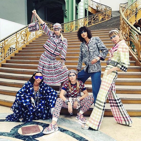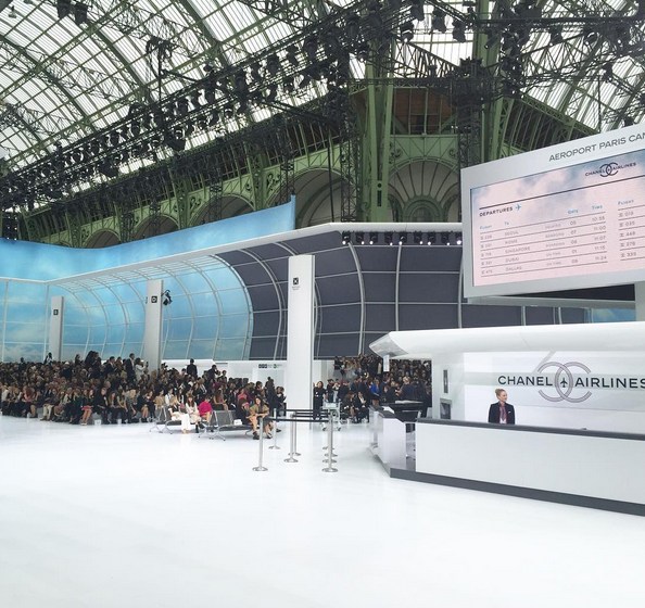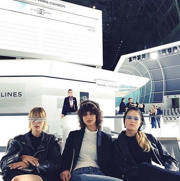 There’s possibly more hope in trying to list the style ideas and famous names who weren’t at the Chanel spring/summer 16 show in Paris than those who were. In a cavernous airport hangar, dubbed ‘Aeroport Paris Cambon’, Brit model Edie Campbell was the first to catch a flight on Chanel Airlines, wearing a pastel checked, double breasted, flared, nobbly wool jumpsuit. She was followed by a who’s who of hot models, including Lexi Boling, Kendall Jenner, Mica Arganaraz, Lineisy Montero, Molly Bair, Soo Joo, Anna Ewers, Binx Walton, Lindsey Wixson, Jing Wen and Greta Varlese. Watching from the front row was Janelle Monae, Petite Meller, Jamie Bochert, Lily-Rose Depp and mom Vanessa Paradis, Jean-Paul Goude, Irene Kim, Kris Jenner and Cara Delevingne, who ran to Karl with little Hudson Kroenig at the end of the show.