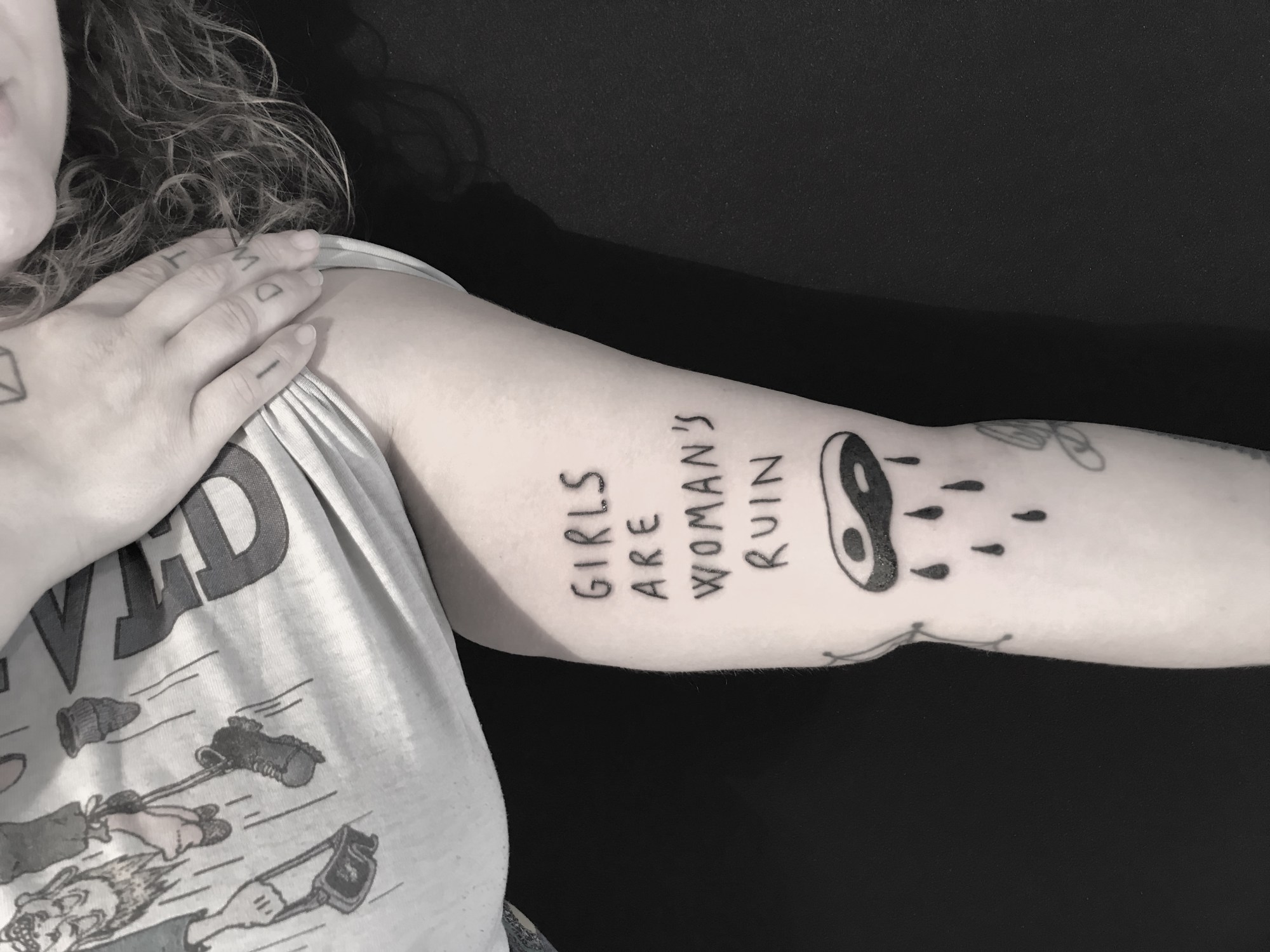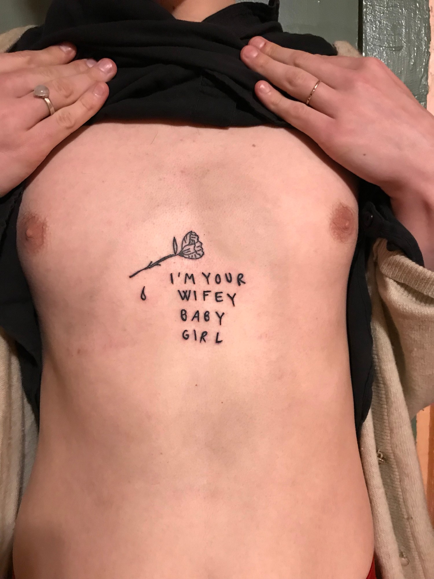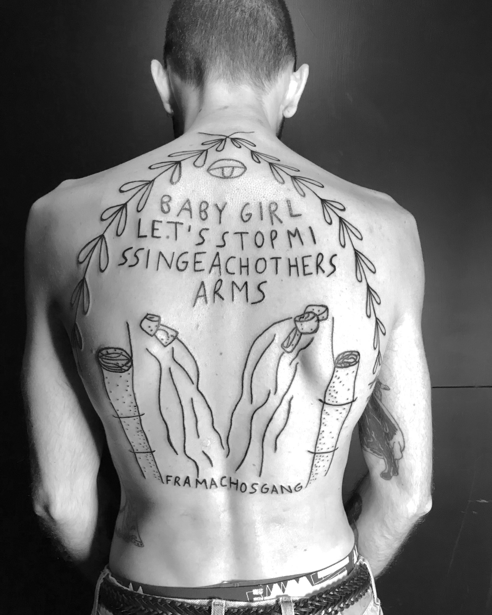 Within an Instagram feed dominated by black-and-white snaps of simple, line-drawn tattoos, a disclaimer reads in caps lock, “GUESS WHO IS A GIRL MARRIED TO A GIRL? ME. THAT’S MY WORK, DIRTY LOVE POEMS FOR MY WIFE. CRAZY STUFF FOR CRAZY PEOPLE. YOU THOUGHT IT WAS A GUY IG? NO. MAYBE UNFOLLOW? YES. MAYBE LIKE IT EVEN MORE. ” Welcome to the sexy hate-free zone of an artist by the name of Fra.