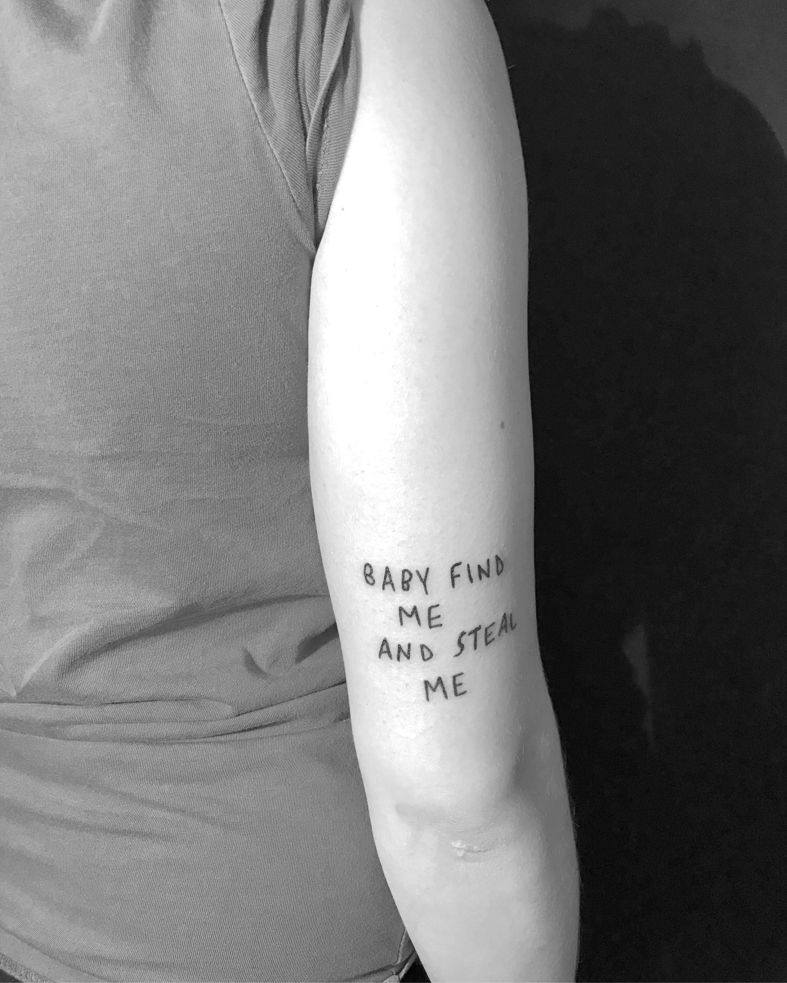 Born in Switzerland’s canton of Ticino to Chilean refugee parents, Silva earned her Master of Fine Arts from Zurich University of the Arts in 2012. She began tattooing at the age of 15, practicing first on her own skin, and picked up the gun again in her 20s. “It was for me the natural step from paper and installations,” she explains. “I draw a lot and write, and document my life with my wife with cheap cameras. I like to work with different mediums but, at the moment, I live in between countries, so I don’t want to collect any extra luggage.” Now a full-time job, Silva’s style of tattooing is frequently understood within the industry as “Ignorant Style,” a term coined by French tattooer FUZI UVTPK and characterized by simple line work, little to no color or shading, and references to street art. Silva rejects the umbrella term. “That’s what people call them if they don’t speak magic,” she says, trading the phrase for one of her own imagining: “I call it THE BRUTAL MINIMALISM .” A running hashtag throughout her social media feed, the phrase is correct in that her tattoo-poems engage with the principles of minimalism, hammering down language into raw, uncompromising emotion in the form of very few, choice words.