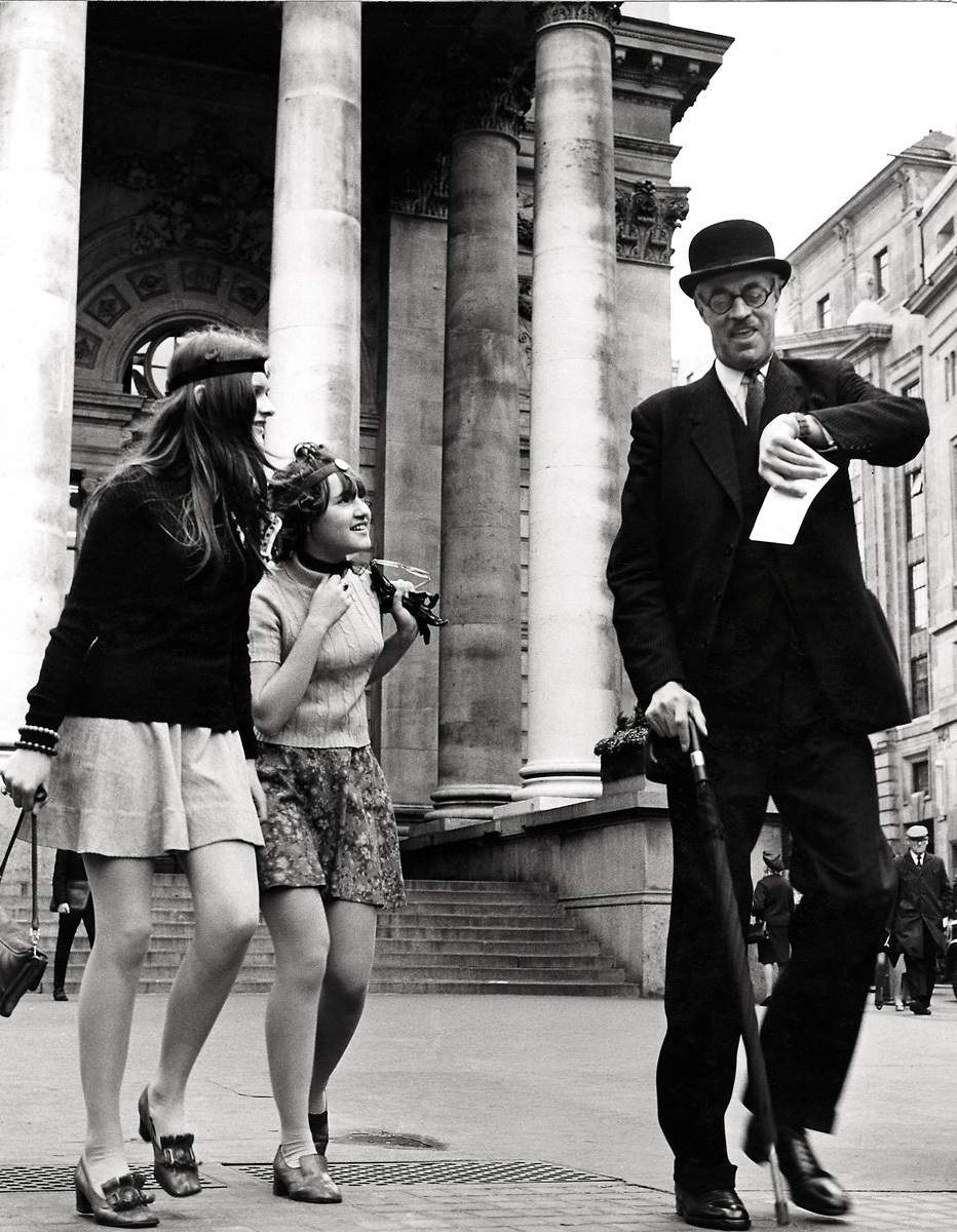 There’s an image, captured by Frank Habicht in the early 60s, of two girls, styled out in Quant-esque miniskirts, loafers, exquisite knitwear, flowerpower headbands. They’re speaking to a classic banker of the old school type — full Savile Row suit and bowler hat, round specs, rolled up umbrella doubling up as a walking stick. He’s out on the streets of the City, the girls asking him the time, an uneasy clash of old and new worlds, yet there’s no friction; a laugh escapes from the banker’s mustache-rimmed mouth, as if he’s in on the whole glorious, ridiculous spectacle. There’s an uneasy ghost at the feast in the background though, not in on the joke, a flatcapped and work-jacketed 50s relic staring down the lens in the distance. He could’ve been launched in from a different image, he’s conspicuously not part of the conversation. The world, you imagine, will go on to be the same for the banker. There’s a new world opening for the young. But there soon won’t be much of a place left for that gruff specter of an old working class. Those girls though, performing their new-found liberation, are conscious harbingers of a new mode of being, a joyful crash of light into an old grey world.