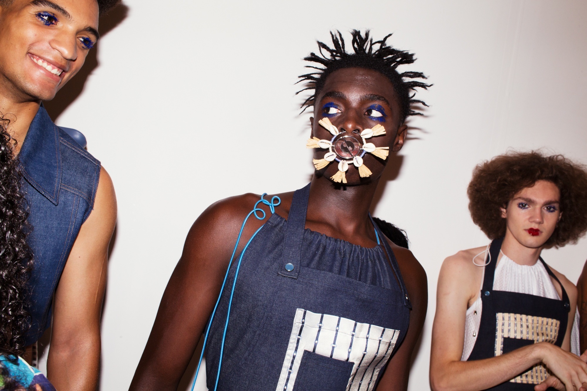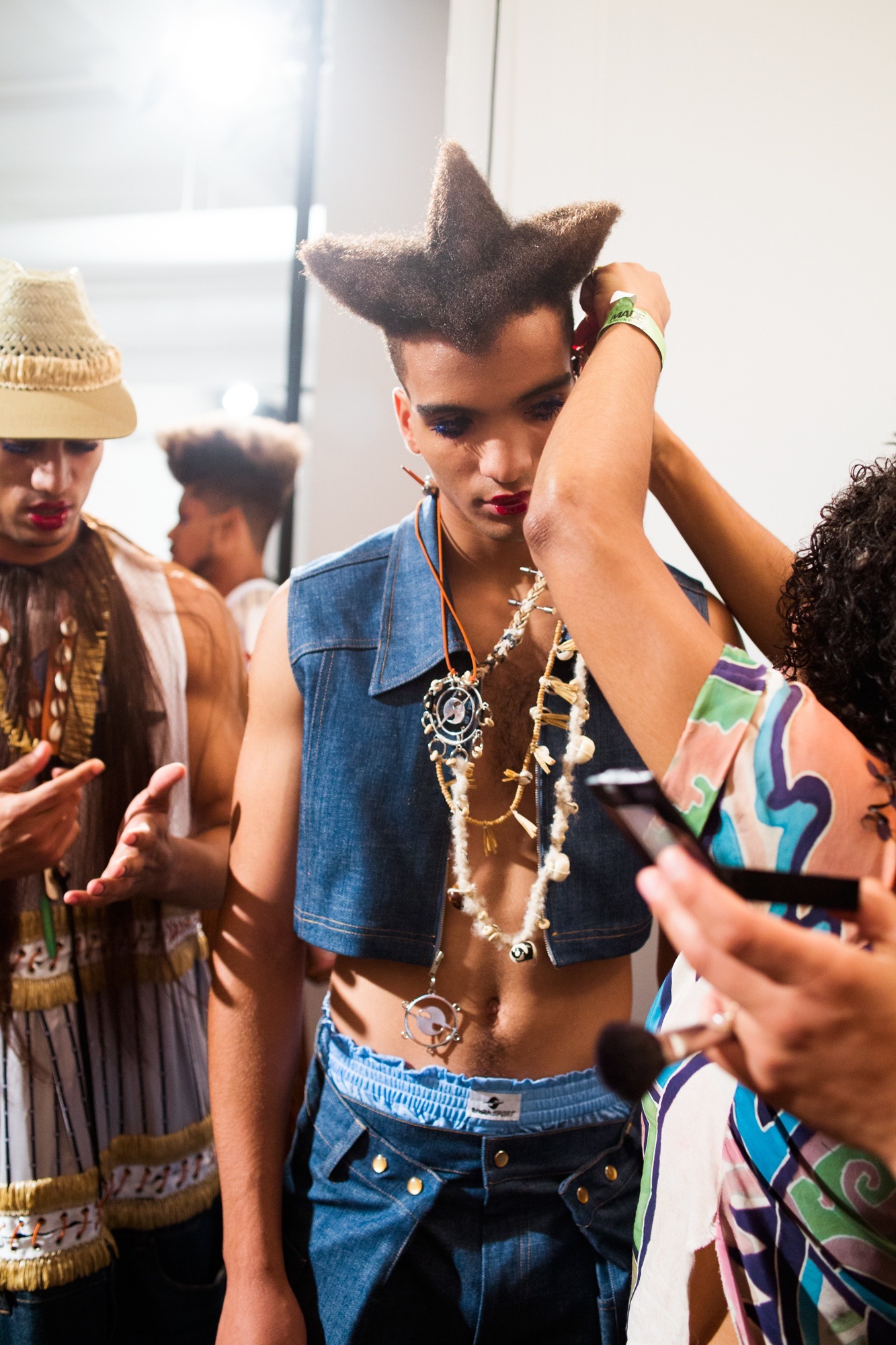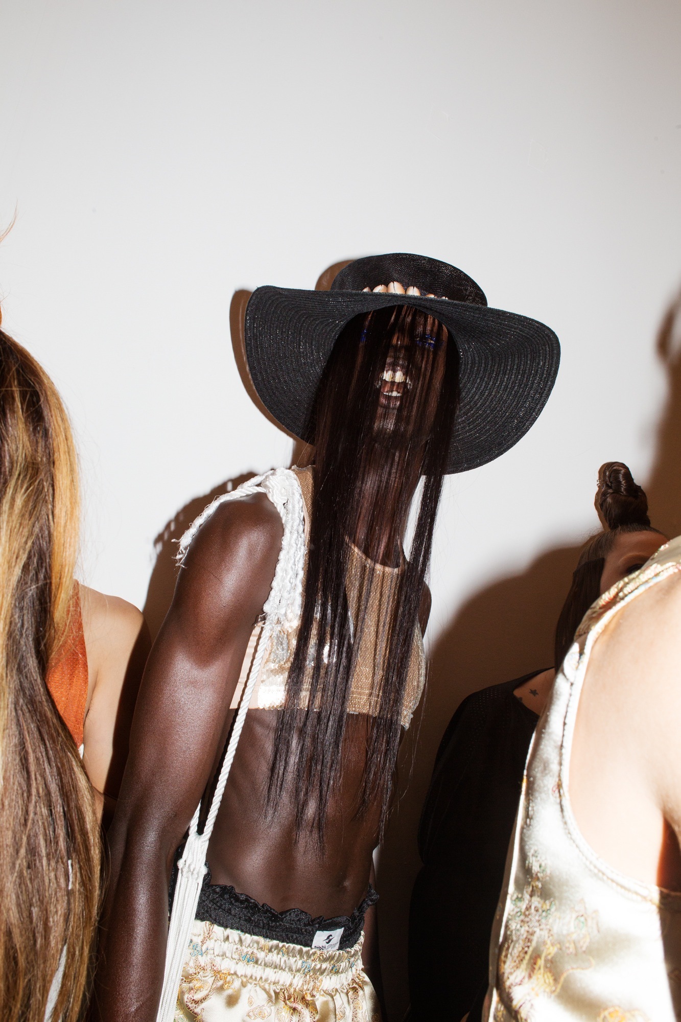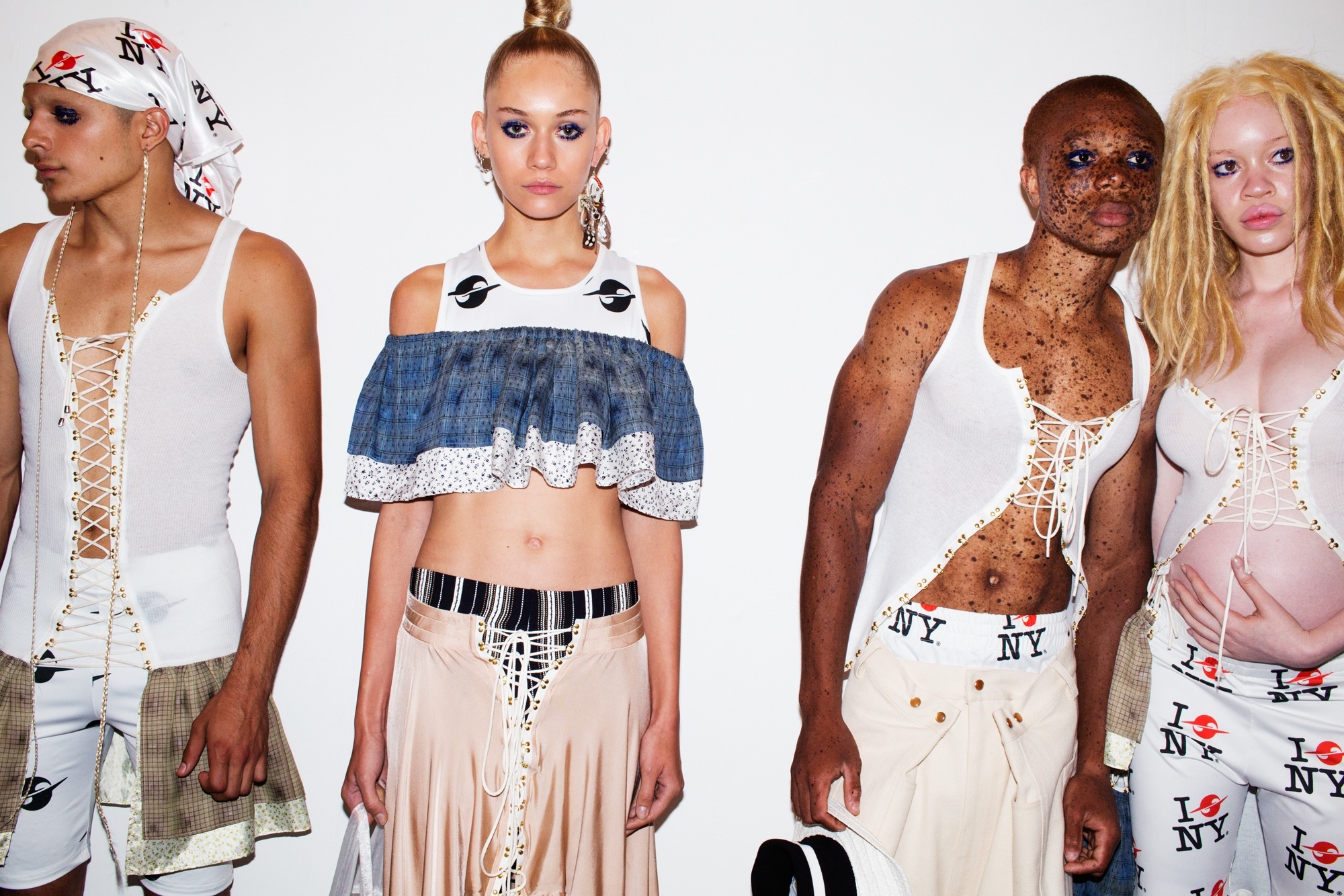 It’s this tribe that gives the brand its fearless singularity. Uribe’s constellation of pan-ethnic, pan-gender creative collaborators have helped cement Gypsy Sport’s status as one of New York’s most boundary-shattering fashion forces. This crew was in full effect yesterday — from boys whose beards were dotted with liquidy lipstck smears to the pregnant woman who put her baby bump on display more proudly than Kim Kardashian at Givenchy.
