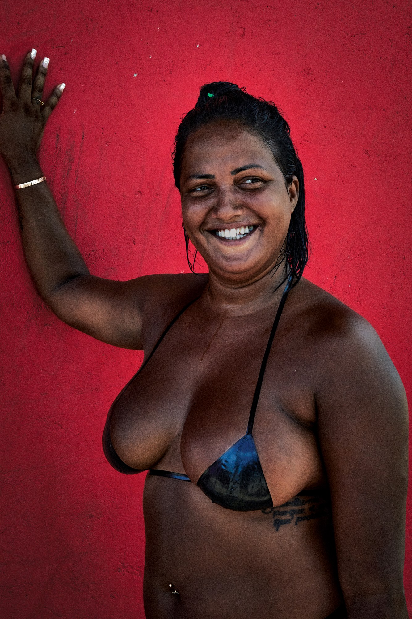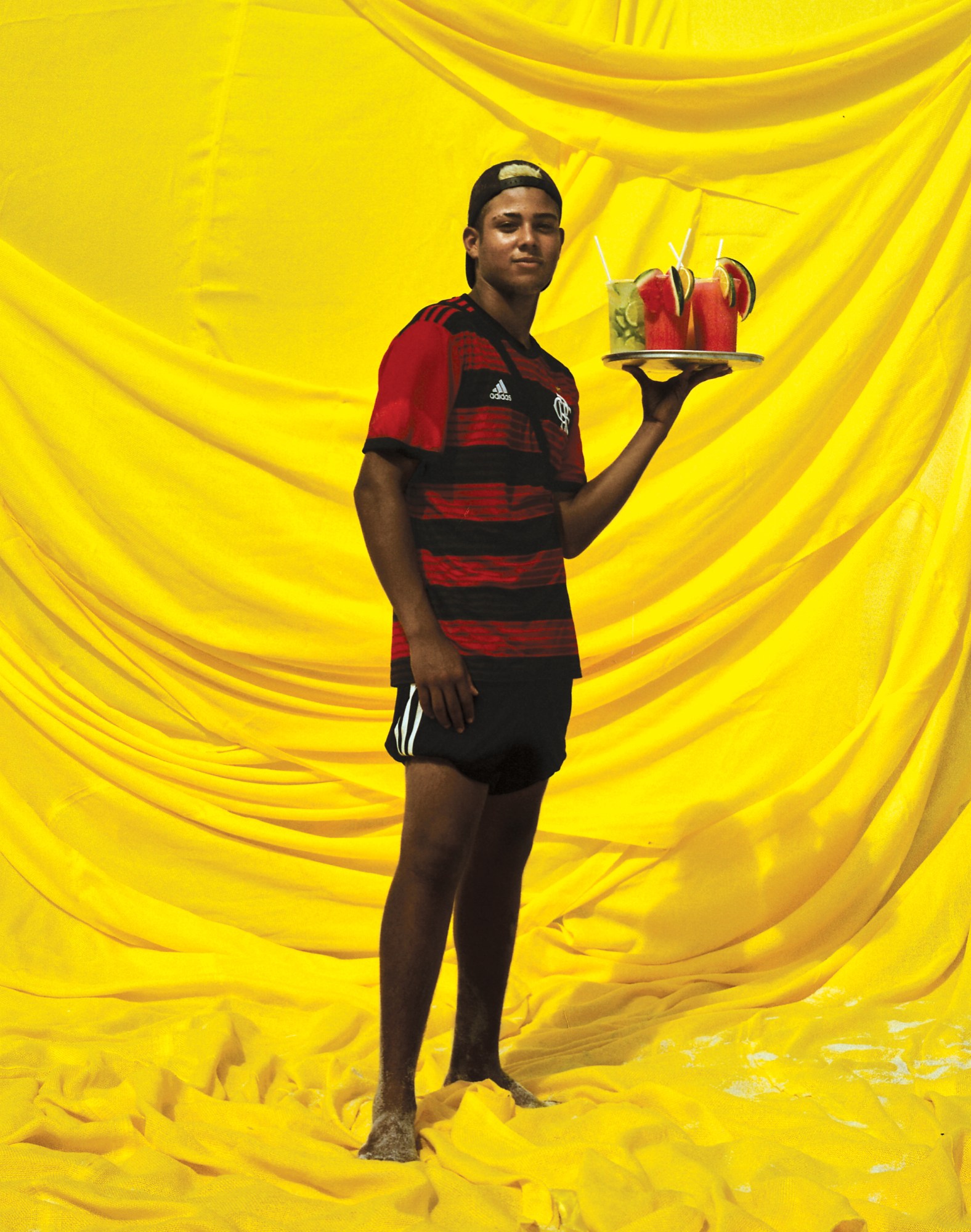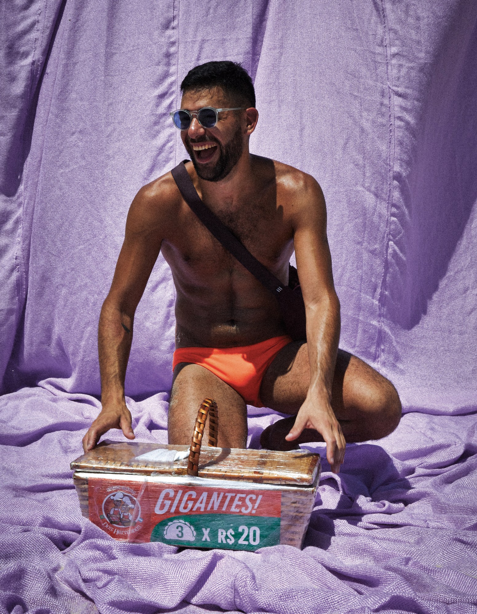 He got to know the vendors along Leme Beach, Copacabana and Ipanema, who touted caipirinhas and sweet, iced yerba mate — an herbal tea transported in large metal cylinders to keep it cold — stashes of Biscoito Globo, candyfloss, plastic Christ the Redeemers, hats, bikinis, sunshades and beach chairs. At Piscinao de Ramos, an artificial saltwater lake where thousands of people from the 15 surrounding favelas spend their summer, he found women selling biquini de fita: tape that’s stuck on the body in the shape of a bikini for perfect tan lines. “I wanted to highlight them,” he says.