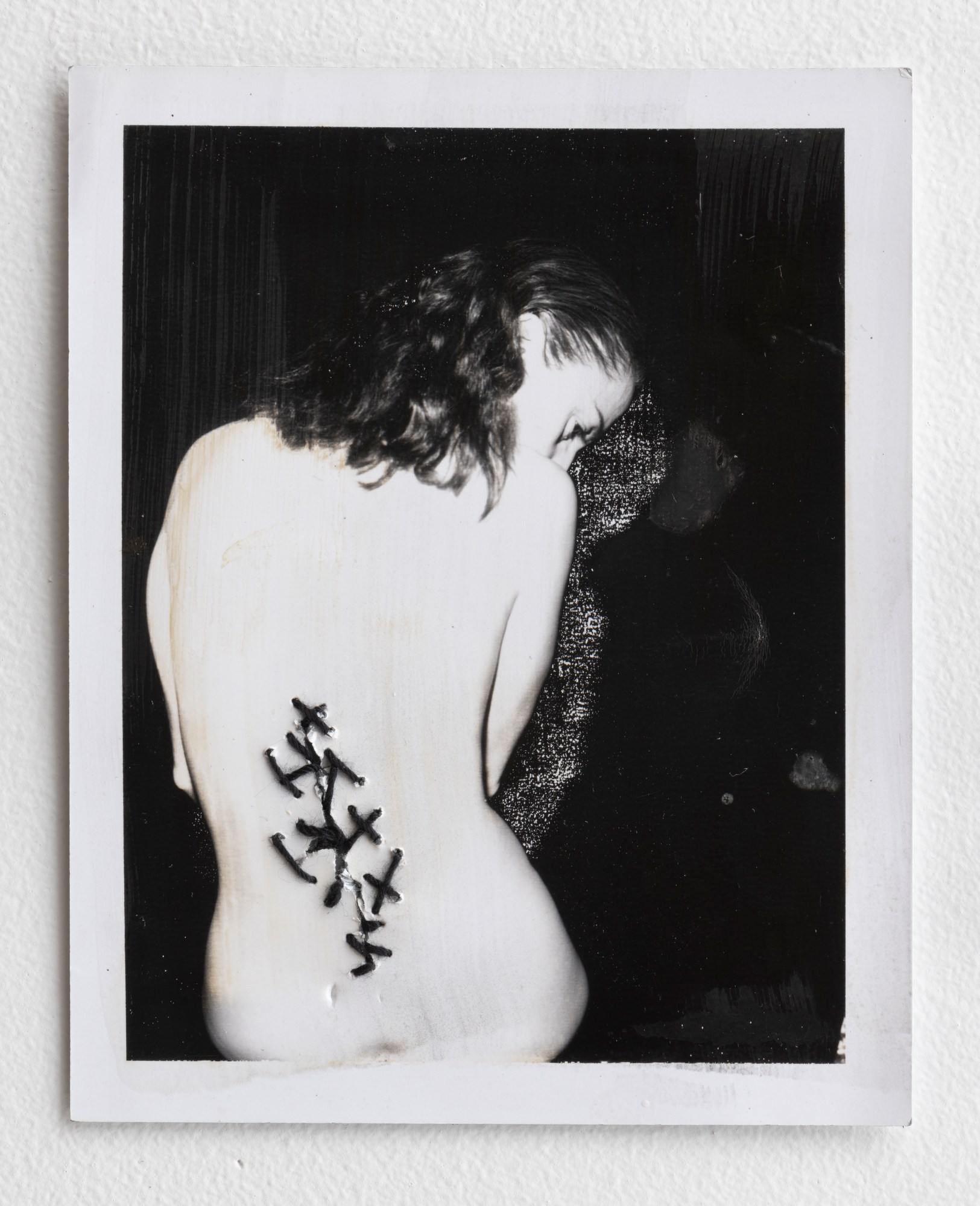 a nude woman sits facing away from the camera; there are stiches over a tear in the polaroid down her spine