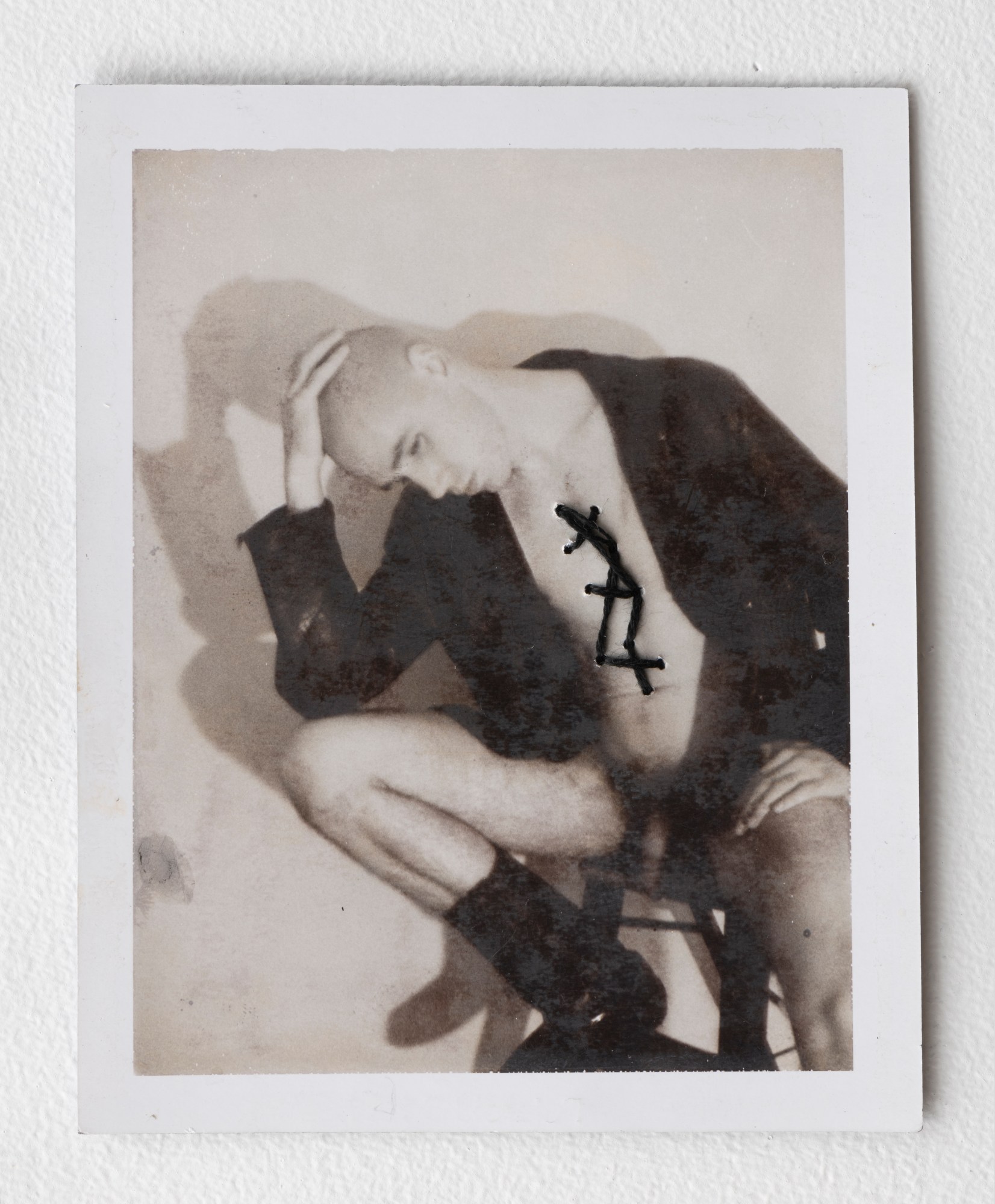 a white man (nude aside from a jacket) sits with his legs open on a stool; there are stitches through the polaroid in his chest area