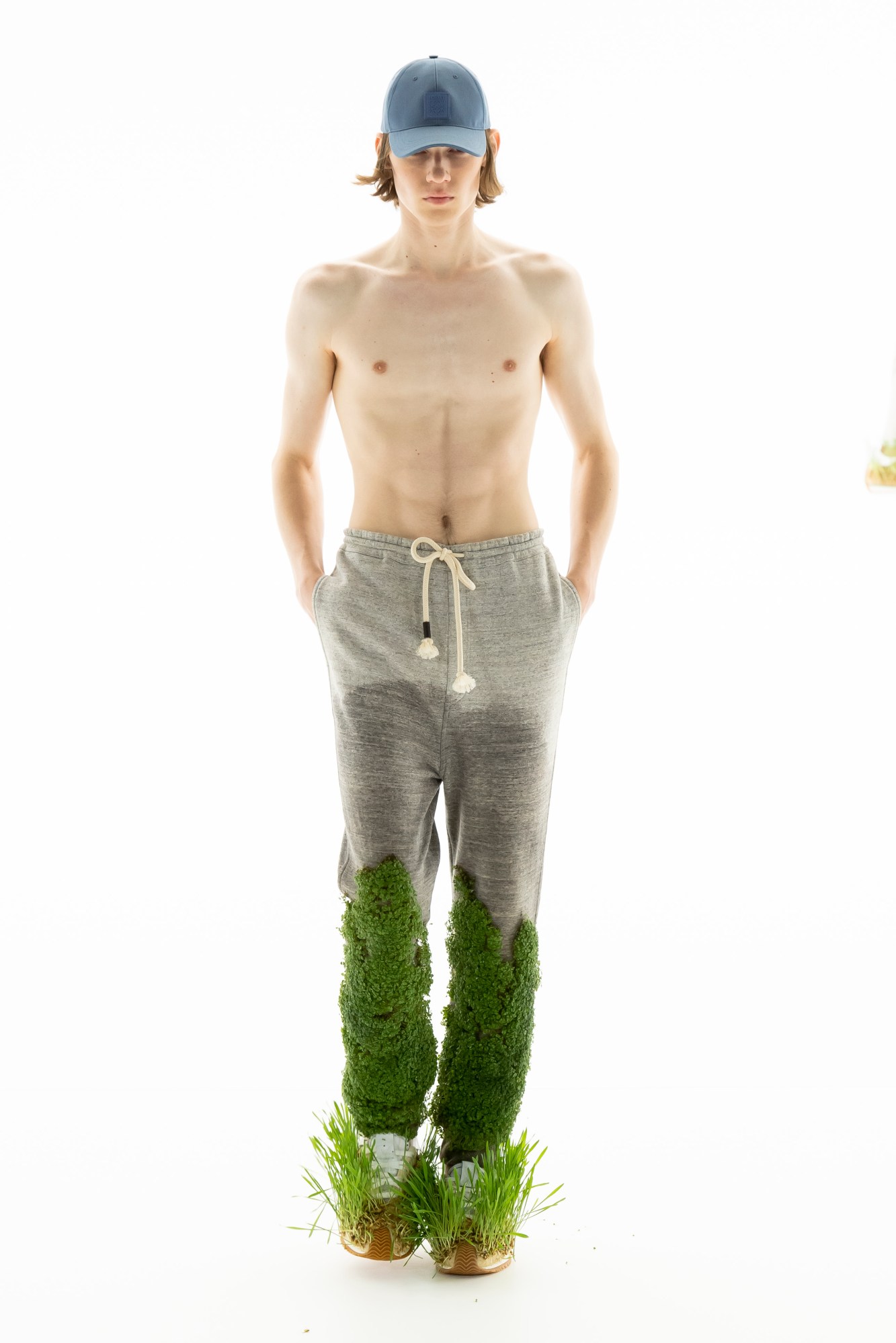 Calling on emerging designer Paula Ulargui Escalona to seed sneakers, sweatpants and tailored cashmere coats with cat’s wort and chia plants, Jonathan Anderson drew us closer to the labour behind garments, which began in polytunnels skirting Paris. Presented on a backlit, sloped stage, they appeared alongside outerwear mosaiced with tablet screens broadcasting stock footage of dandelions fluttering in the breeze and circling birds. Through this juxtaposition, Jonathan explained in his post-show debrief, we might do away with the “dogma that fashion is about technology” and at odds with nature.