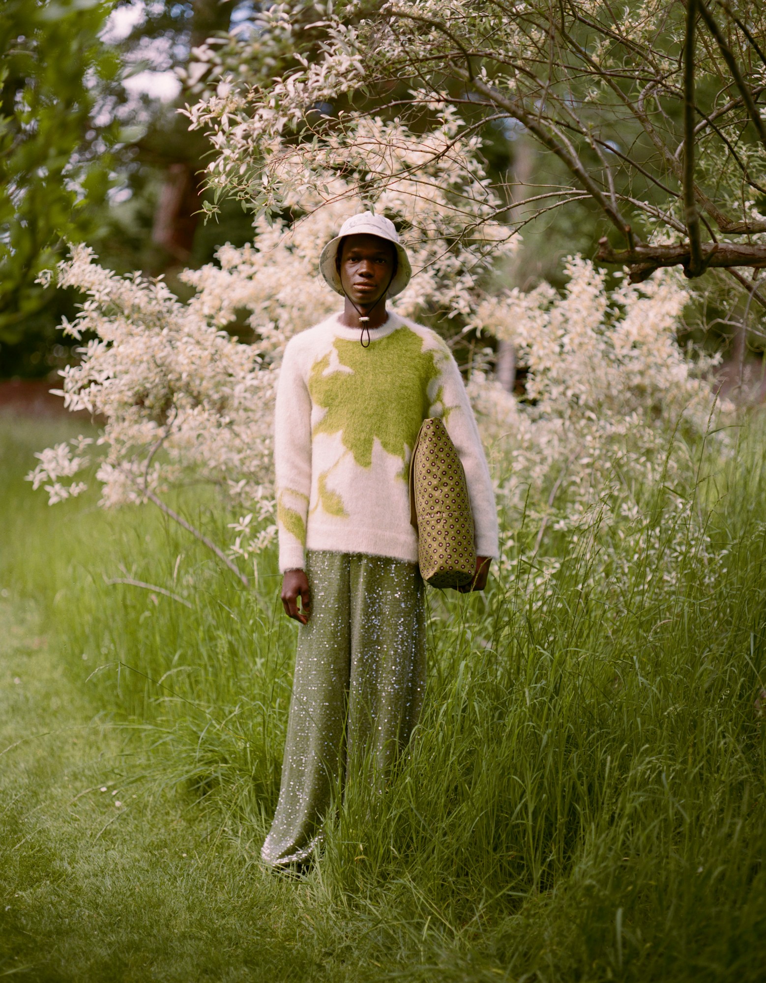 But change is afoot. For SS23, the men’s collections got down and dirty with the great outdoors, grass stains and all. Why this err towards the earthy occurred is hard to pinpoint, but, like that poorly watered houseplant beside your desk, it’s growing despite all odds. Hot on the heels of a cultural shift that has seen terms like cottagecore and its trippier cousin, goblincore, enter our lexicon, menswear’s bountiful garden makes space for the boys tape-seamed into Arc’teryx Beta jackets and the readers of the fungilicious literature that has consumed conversation at every 20-somethings’ dinner party since 2020. Add to this an earnest and increasing concern for the natural world and perhaps this shift is less surprising.