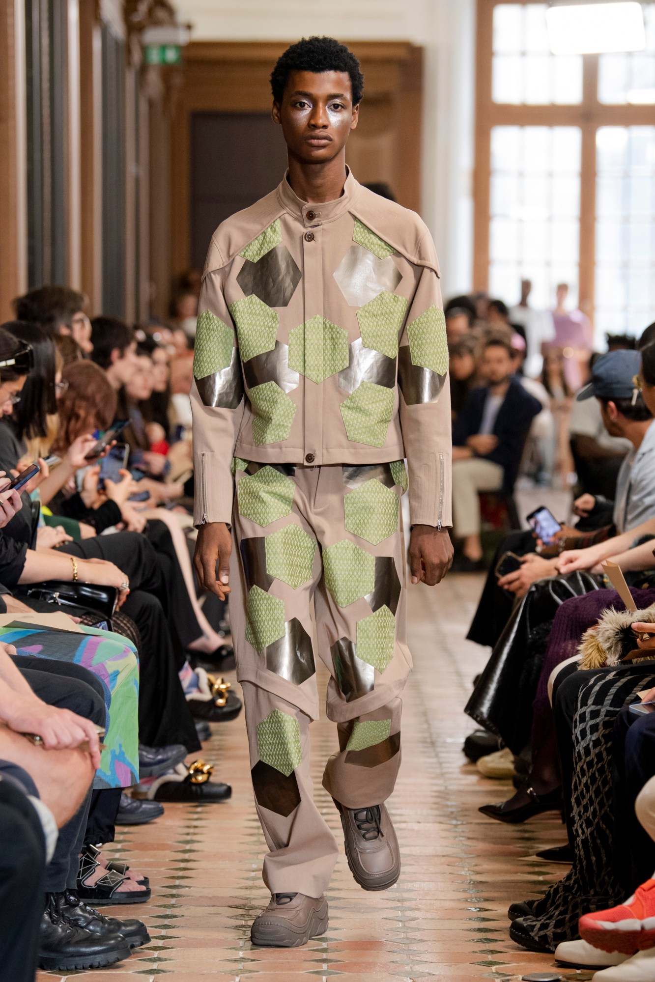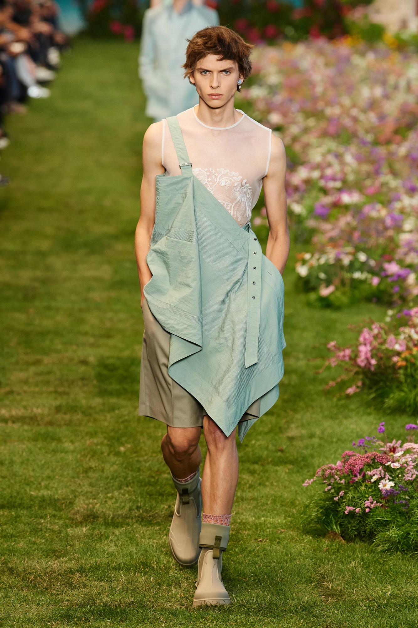 Exemplifying the latter approach, Kim Jones looked to the Bloomsbury Group’s favourite country getaway, Charleston. A site of leftfield thought and creativity, the building was remodelled for the Dior Men show opposite a recreation of Granville, Monsieur Dior’s childhood home in Normandy renowned for the exquisite garden cultivated by his mother Madeleine. Between them, models clad in a tailored, effete rendition of gorpcore strode across a wildflower meadow. Rattaned climbing shoes, pearlescent snail-shell necklaces and military-grade bumbags manufactured by American outfitter Mystery Ranch were aligned under Jones’ techy skew via Matthew Williams’ rollercoaster buckles. This was contemporary streetwear, emasculated with gardening hats designed by milliner Stephen Jones – apt shade for a day in the flowerbeds – plus French wellies and the paintings of Bloomsbury alumnus, Duncan Grant, splashed across torsos.
