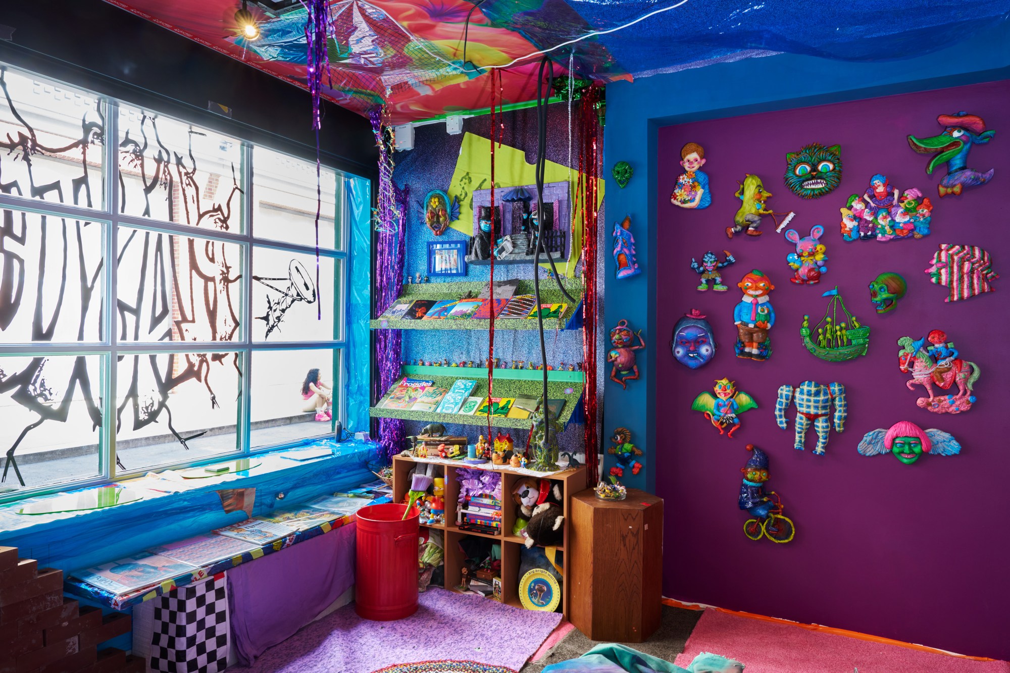 Step inside the brain of artist and set designer Gary Card, creator of grotesque, hypersaturated worlds for the likes of Comme des Garçons and Lady Gaga, and you’ll find a tangled archive of busted clown heads, mutant trinkets, VHS tapes, and, most recently, a weird little bear-shaped cake made out of foam roses. His latest exhibition, “Gathering Dust,” has taken over the Soho space of Plaster—a creative studio and art magazine founded by Milo Astaire and Finn Constantine—like a psychedelic garage sale on acid. It’s a maximalist dive into Card’s obsession with discarded things and DIY world-building.