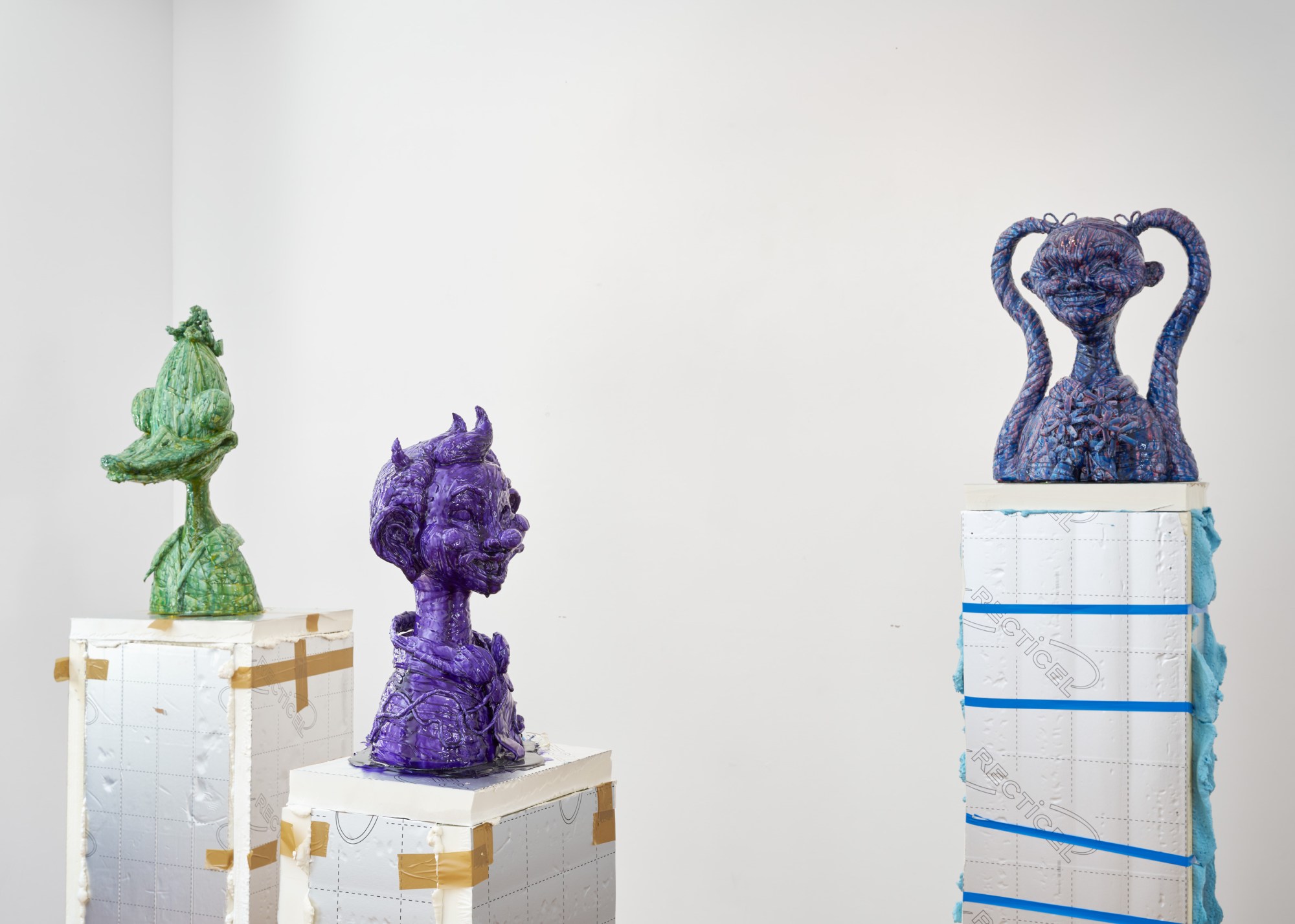 The exhibition is split over two floors: downstairs, a dense, immersive curiosity shop-meets-studio-meets-shrine to Card’s hoarding instincts; upstairs, a quieter but no less mad collection of sculptural busts, something Card has become known for creating, made entirely from masking tape. “Milo just said, ‘I want some heads,’” Card grins. “So I gave him heads.”