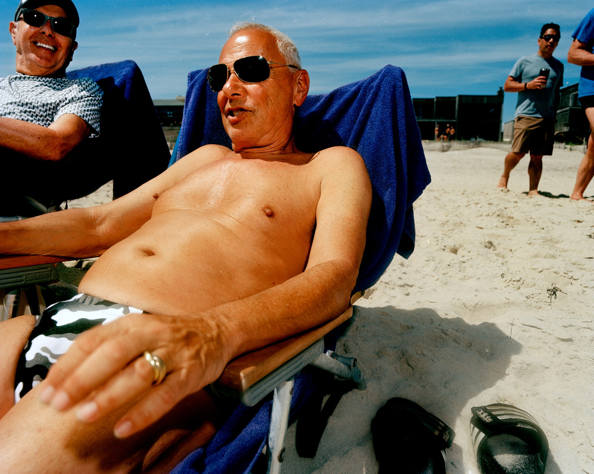 The images really sit together, in the same way all the subjects did at these beaches. But the picture of the red fold-up chair with the dog’s rear while his owner lies splayed out behind encapsulates the ease and assurance of self I hoped I’d find in queer beach goers.