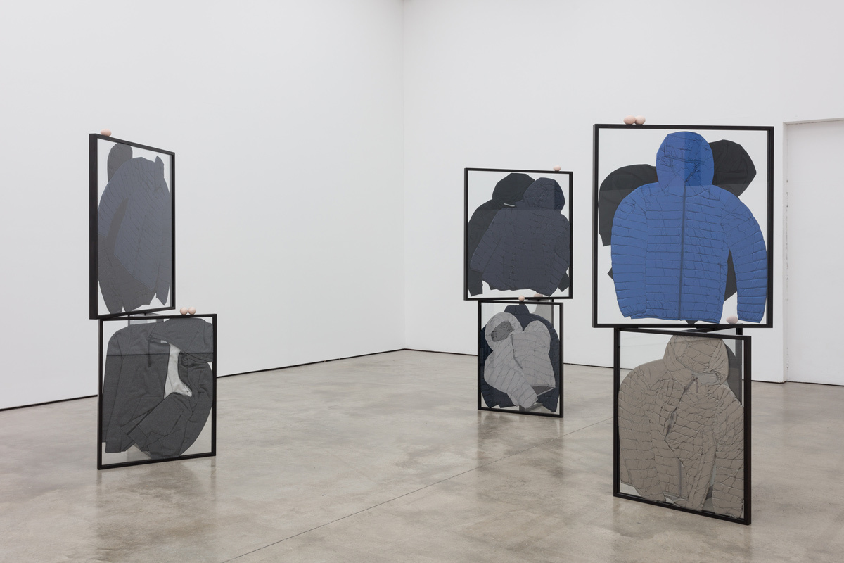 I’ve been making those hoodie works for a couple of years now, and they’ve always been flat on the wall. I wanted to bring them into the space and have a sculpture you can walk around. I’ve been reading this book where I came across a reference about the myth of this guy who falls in love with this sculpture because he’s able to circle it. The hoodie pieces emerged out of me using a very ubiquitous material, these Uniqlo puffa jackets that you see pressed up against the glass on the tube. It’s this idea of contact. And I was thinking about puffas as a way to cushion you in the space that you inhabit. I had this compulsion to squash them and sandwich them between sheets of glass. I live opposite a funny park and I often see these boys hanging out and in those types of jackets. I look at them from a distance, and I was thinking about clusters of people, groups, social forms, scrums and gangs. There is something about objectifying these things, but I also wanted to make it something loving as well. It’s about empathy and understanding.
