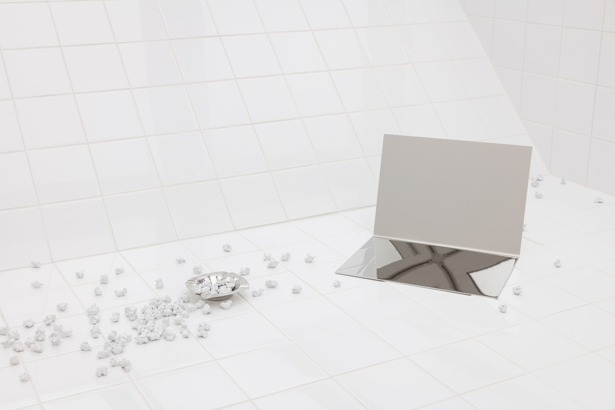 What I like about the banal tiles is that they’re this highly reflective surface that allow you to have a view behind yourself. I’ve come across that standing at a urinal, facing a white tiled wall, which is there ideologically and architecturally to be cleanable and reiterating ideas of hygiene, but it also allows you to abuse what it’s about, by letting your eyes stray and seeing shadows and things behind you.
