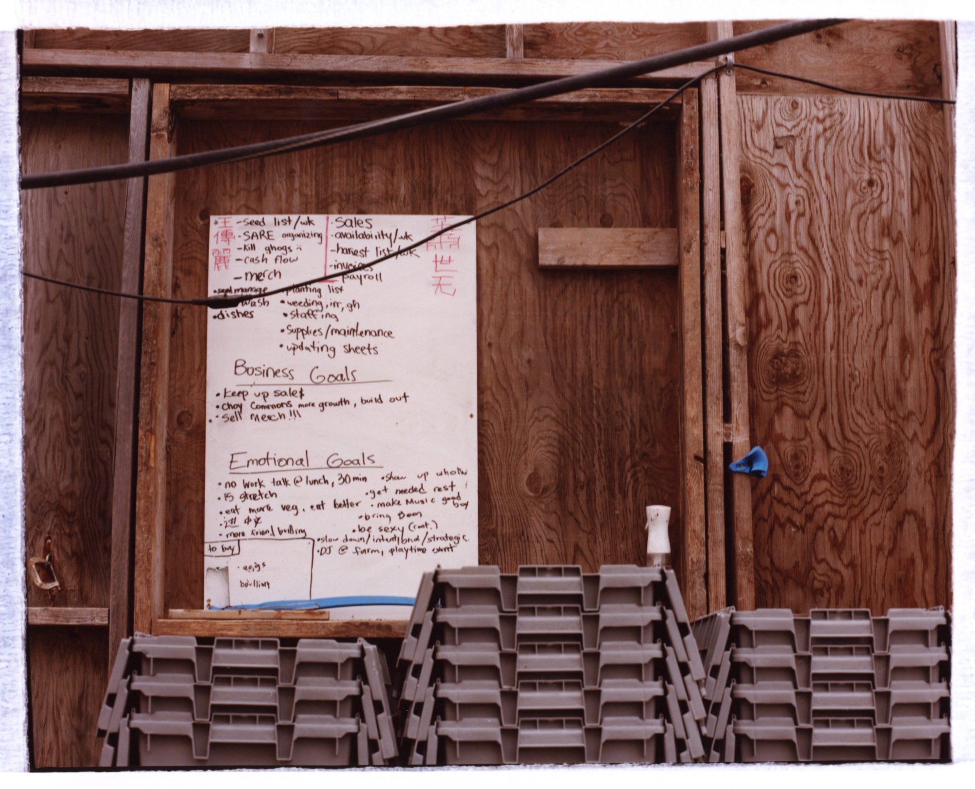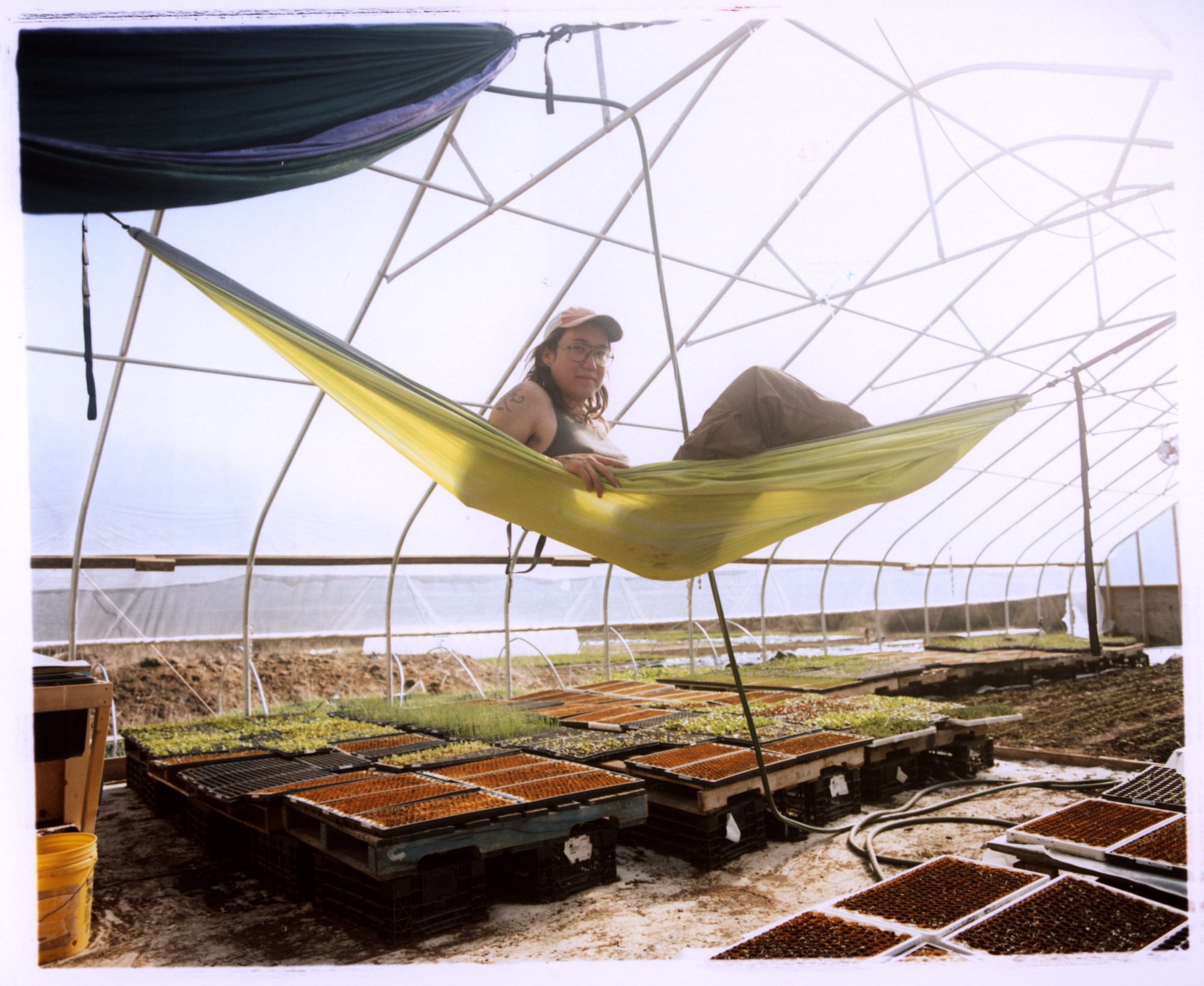 On the walk back to the sheds, Momo, her farm dog, kicks up loose dirt as fine as soot. It hasn’t rained in weeks, and gusts of wind threaten to erode the soil. Farmers in the region have been hit by drought, wildfire smoke that blocked the sun during the cool months, followed by flooding that can quickly turn the fields back into wetlands. The uncertain conditions of climate collapse are exhausting, but Chan greets the unknown with persistence. “It’s not a job, it’s a full-on lifestyle, and you never really know what’s gonna happen at any given point, so you just have to be prepared,” she concludes. “All I’m thinking about is what do I have to do next? Is this thing going to survive the frost? Did I leave the irrigation on?” The hardest part of farming, she sighs, is that there is no off switch.