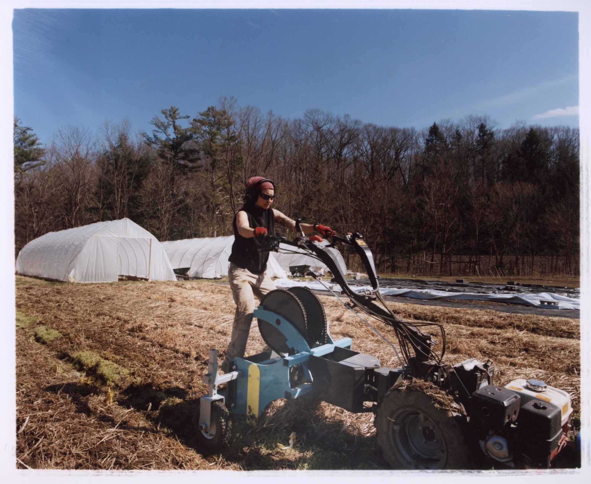 It’s hard to imagine their field, now organized into neat rows of diversified vegetables, was once a wild brush pile where cattle grazed. “Everything is super tight,” explains Wang of the farm’s leased land. “All of our inputs into the soil and all of our spacing for crops has this underlying preoccupation with running out of space.” Their block system is based on high-density farming methods they learned at Brooklyn Grange, a five-acre rooftop farm where Xiao farmed and Wang taught ecology before leaving the city.