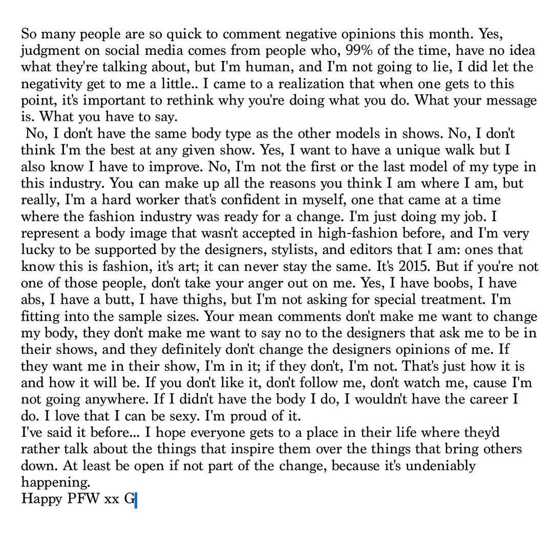 “So many people are so quick to comment negative opinions this month,” she posted on instagram as the opening line in a lengthy statement on the matter. “Yes, judgement on social media comes from people who, 99% of the time, have no idea what they’re talking about, but I’m human, and I’m not going to lie, I did let the negativity get to me a little,” she said, adding, “No, I don’t think I have the same body type as the other models in shows. No, I don’t think I am the best at any given show. Yes, I want a unique walk but I also know I have to improve. No, I’m not the first or last model of my type in this industry,” and explaining that, “You can make up all the reasons you think I am where I am, but really, I’m a hard worker that’s confident in myself, one that came at a time where the fashion industry was ready for a change.”