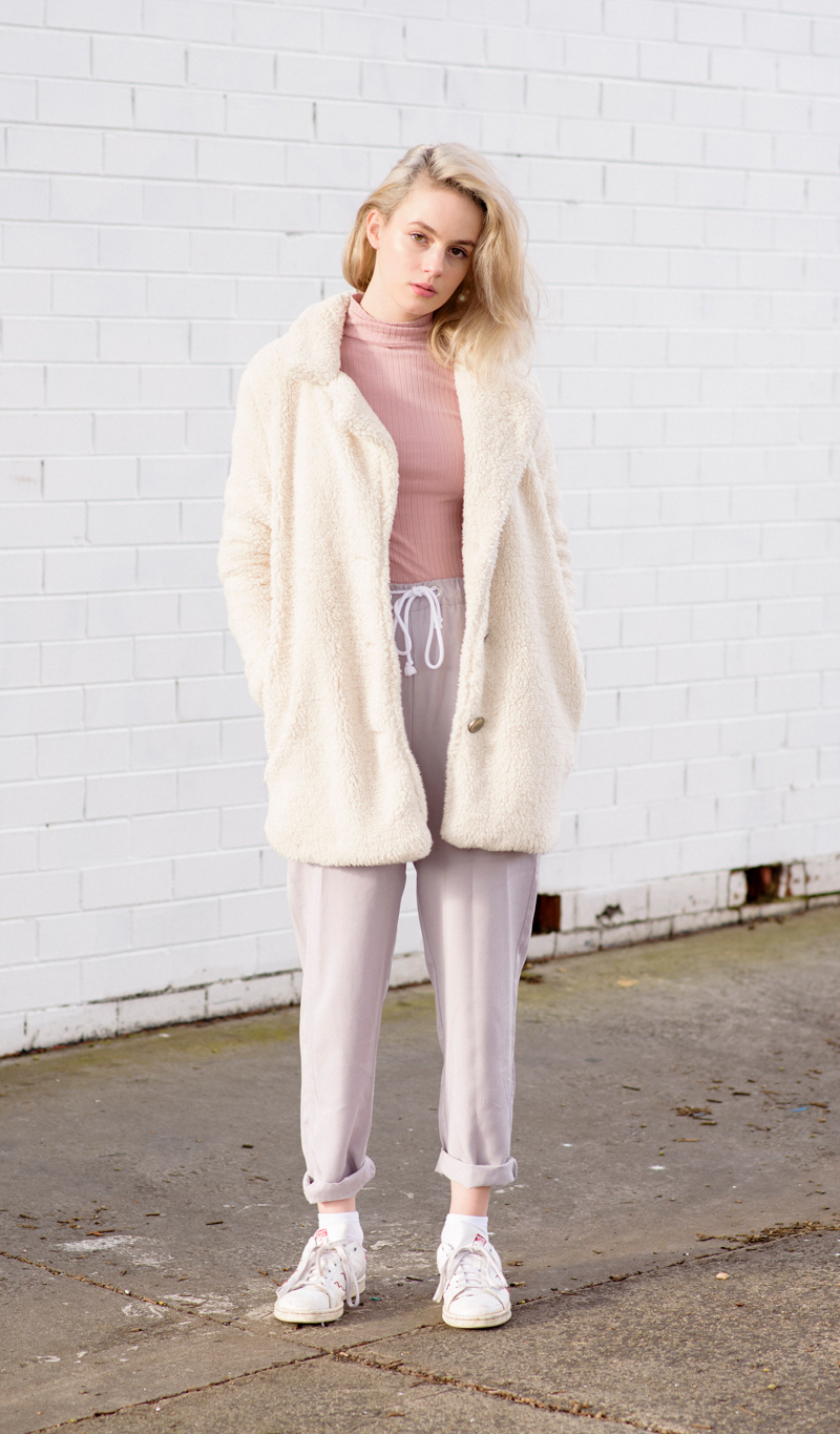 My new fluffy faux wool jacket, my favourite pink turtleneck, trousers from ASOS and my trusty Stan Smiths.