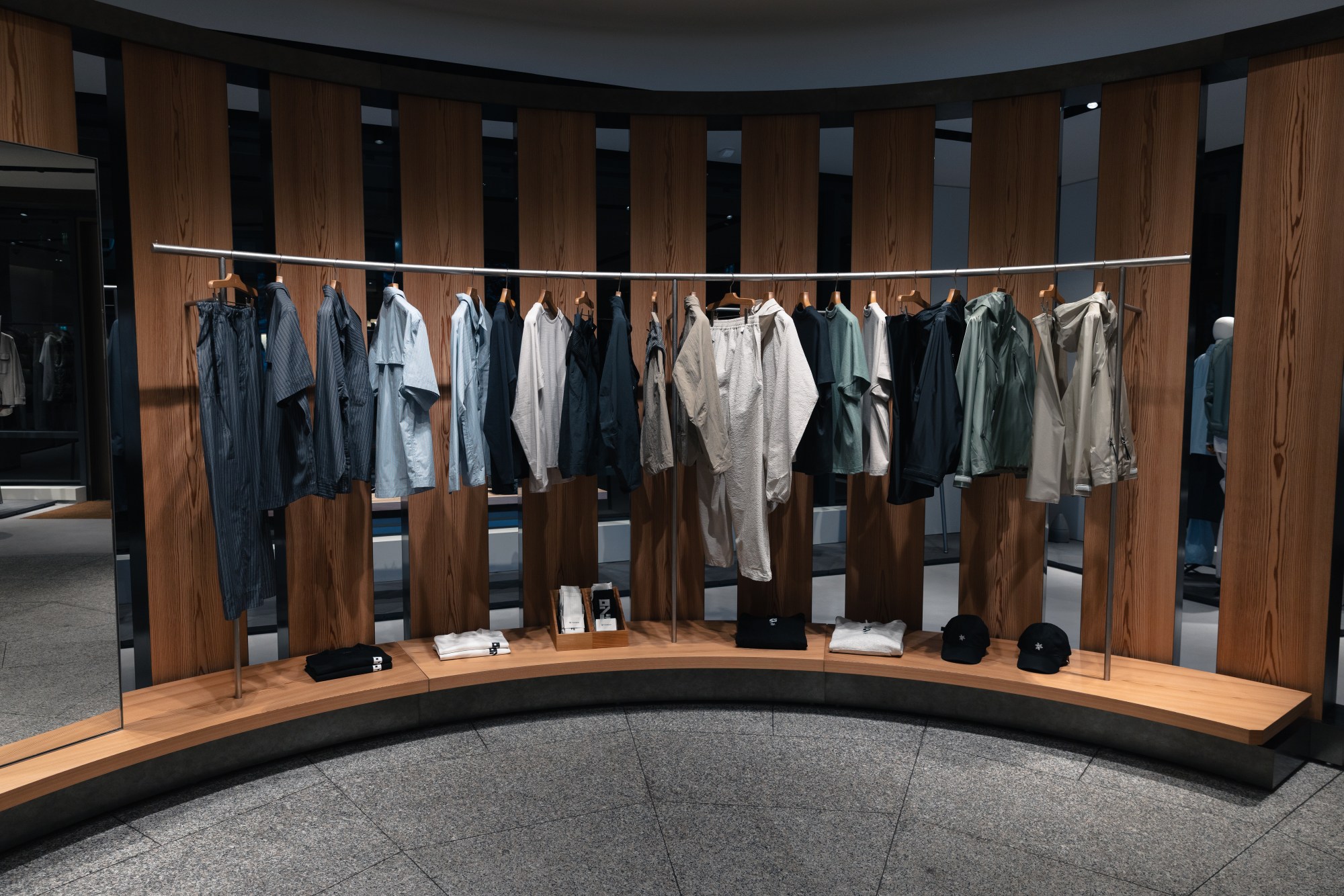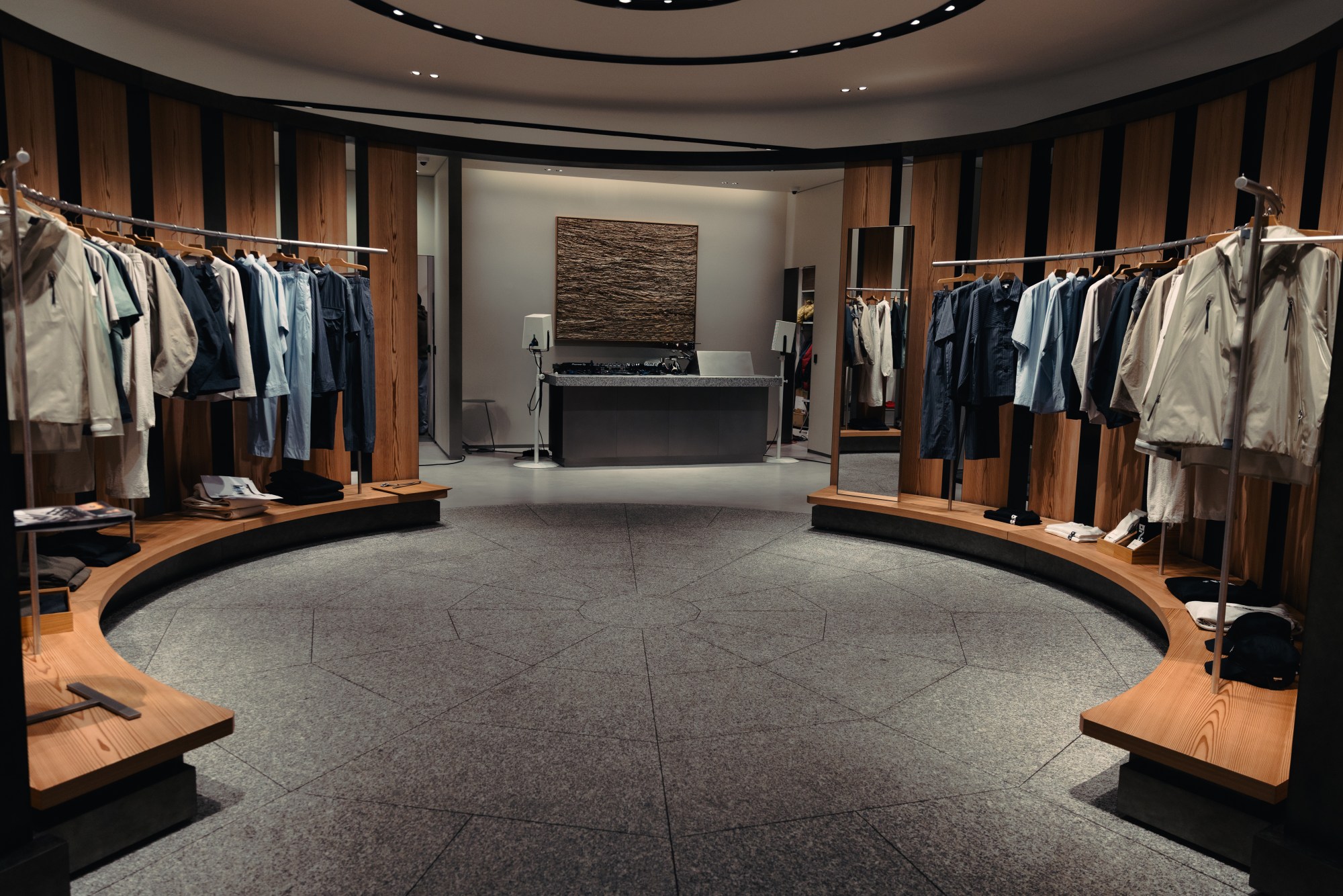 Step inside and the atmosphere pivots again. Rows of Akita cedar pillars stand within the ring like a carefully cultivated grove, their warmth and texture grounding the space. The contrast with the outside world is deliberate. Even the fitting rooms reflect that philosophy. Panels made from specially developed fabric dyed using traditional kakishibu techniques line the walls, silk threads slowly treated with persimmon tannin until they take on a subtle sakura glow. The detail feels intimate, almost meditative. Then, just as the calm settled, the tempo shifted.
