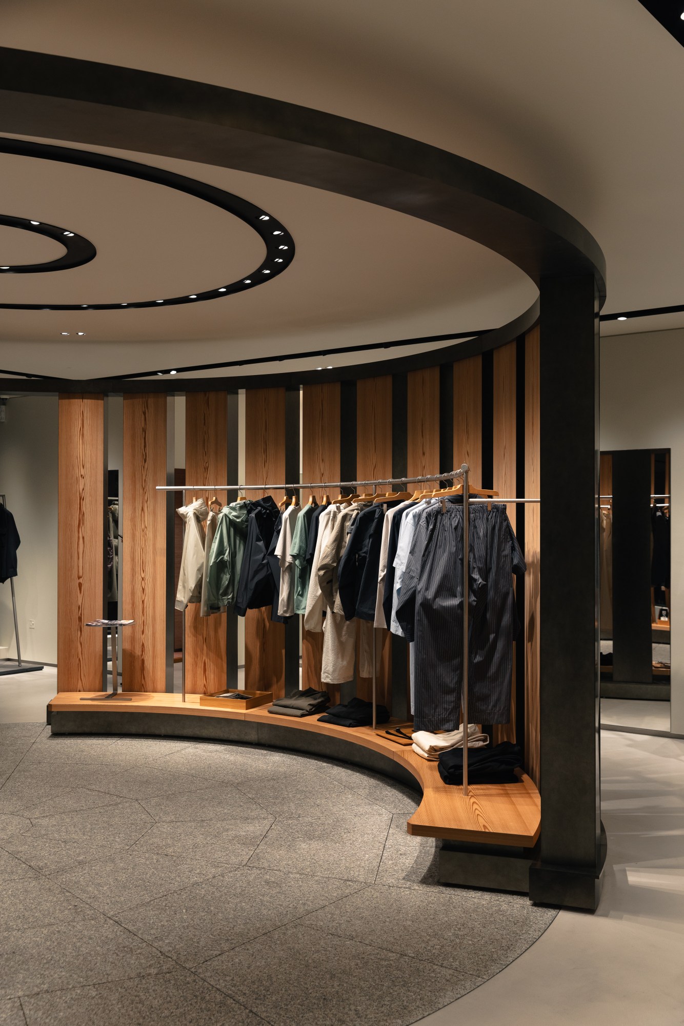 Behind a glass facade at 35 Broadwick Street, a circular cedar structure glowed softly against the dusk. Goldwin had officially arrived in London, opening its first-ever UK store and launching its Spring 2026 collection in a space that felt less like a shop and more like an architectural statement. Designed by Hiroshi Sugimoto and Tomoyuki Sakakida’s New Material Research Laboratory, the 170-square-meter flagship is built around the Yashiro, a ring-shaped sanctuary positioned to face the street. It operates as both focal point and frame, broadcasting the brand’s philosophy outward while drawing passersby inward.