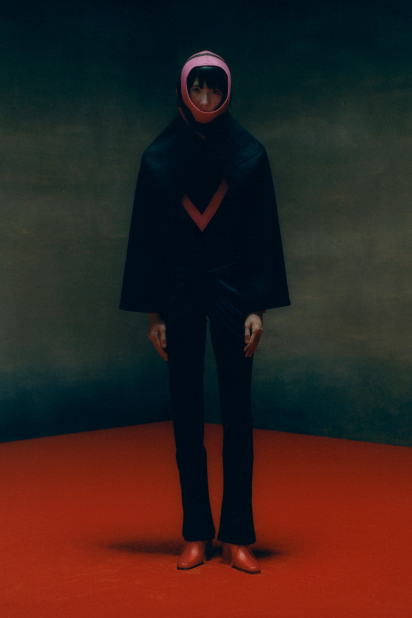 “For me it’s not about a specific horror or ghost story, but rather the experience of building anticipation that horror genres create and the fear of not knowing what’s going to happen next,” explains the Korean designer. “It’s the not knowing and how our imaginations can amplify the uncertainty of the current situation.” And so, Goom’s collection is full of moody plays on shadows — quite literally in the case of reflective silky wool fabrics — as well as stark hooded silhouettes with origami folds, sheeny tailoring with razor-sharp edges, carefully-constructed pleats, and the occasional swathe of drapery, inspired by the work of mid-century couturier Madame Grès.