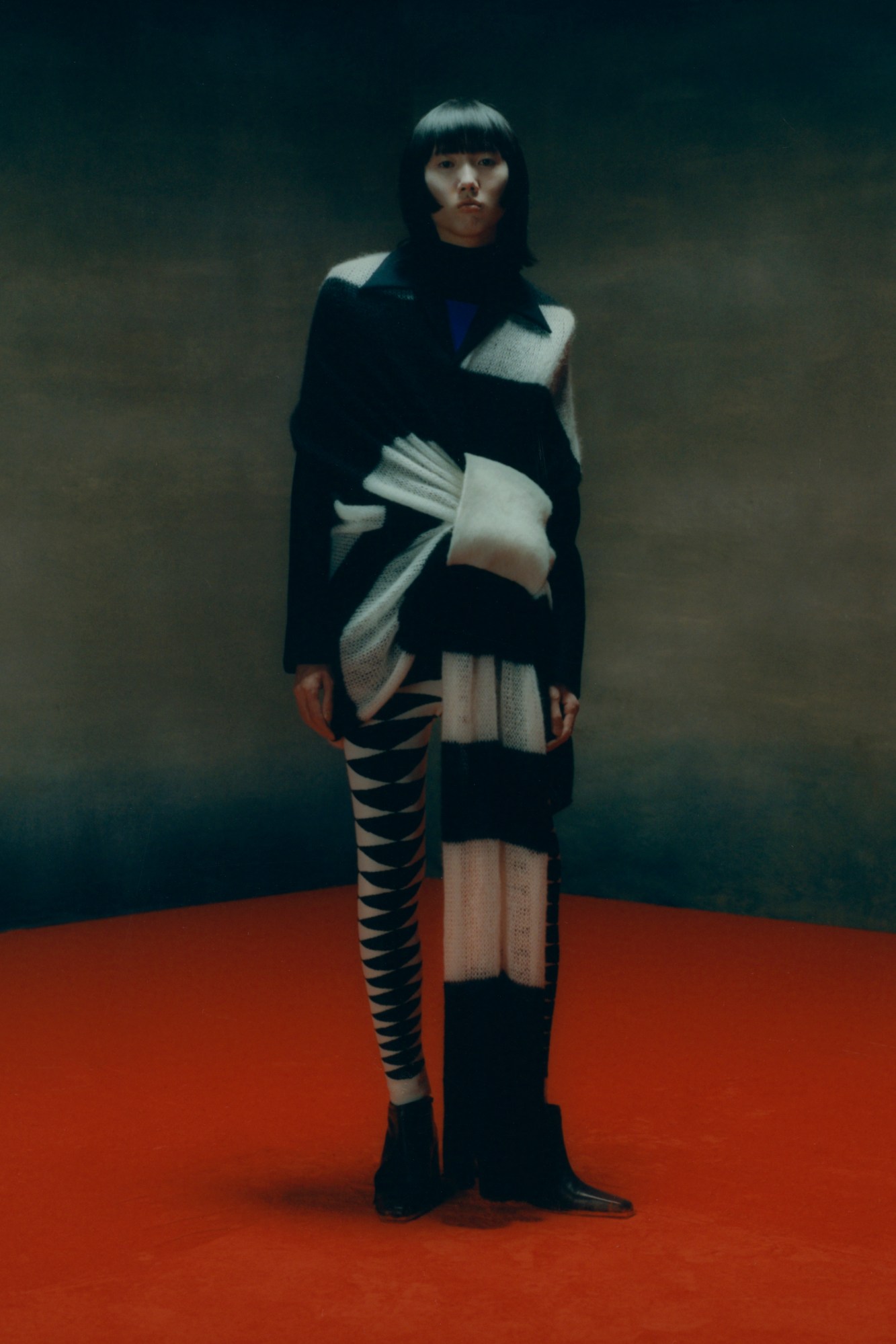 Goom grew up in Jinju, South Korea, before moving to Springfield, Illinois and later coming to London to kickstart her design career at the prestigious art college. It’s there that she began to toy with graphic designs that play with ideas of shape and contrast; like digital images brought to life with intricate constructions and techniques. This season marks her first foray into womenswear, and for AW21, she took her cue from the horror genre — we’re living in scary times, after all — and more specifically, Robert Wiene’s 1920 silent horror film The Cabinet of Dr Caligari and the angular bronze sculptures of Philip Jackson.
