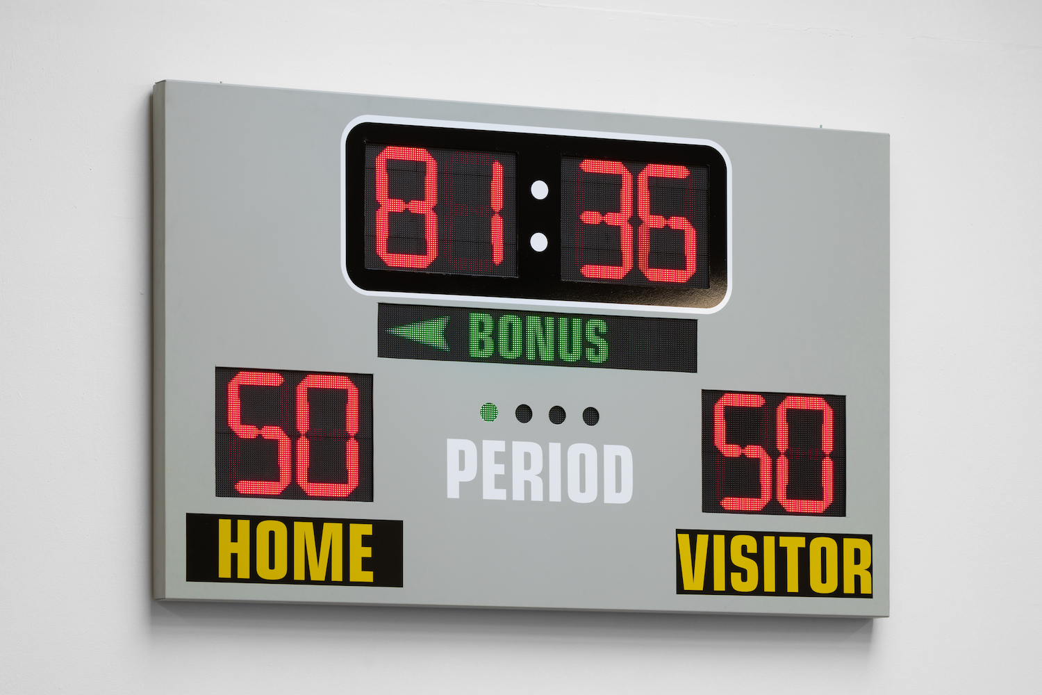 This playful ambivalence between innocuous surfaces and the sinister meaning they may (or may not) conceal shimmers throughout the show. Throughout the space rings the sound of what could either be cicadas nestled in neighbouring trees or urgent alarm drones. At one end hangs a retro basketball scoreboard, the periodic flicker of its display implying your participation in a game where the rules are unclear, a sense buttressed by the series of shooting target-like prints of concentric circles suspended at the court’s opposite end.
